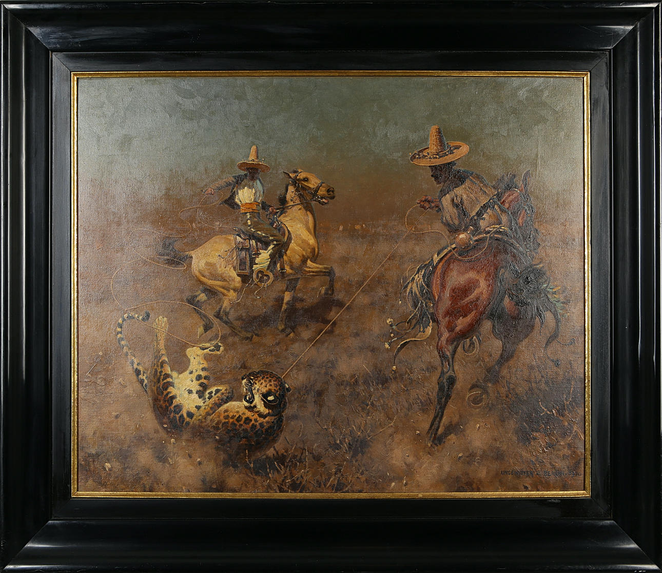 The motif bears, according to a contemporary label on the verso, the title: "Jaguarfang mit dem Lazzo", 78 x 98 cm.