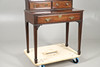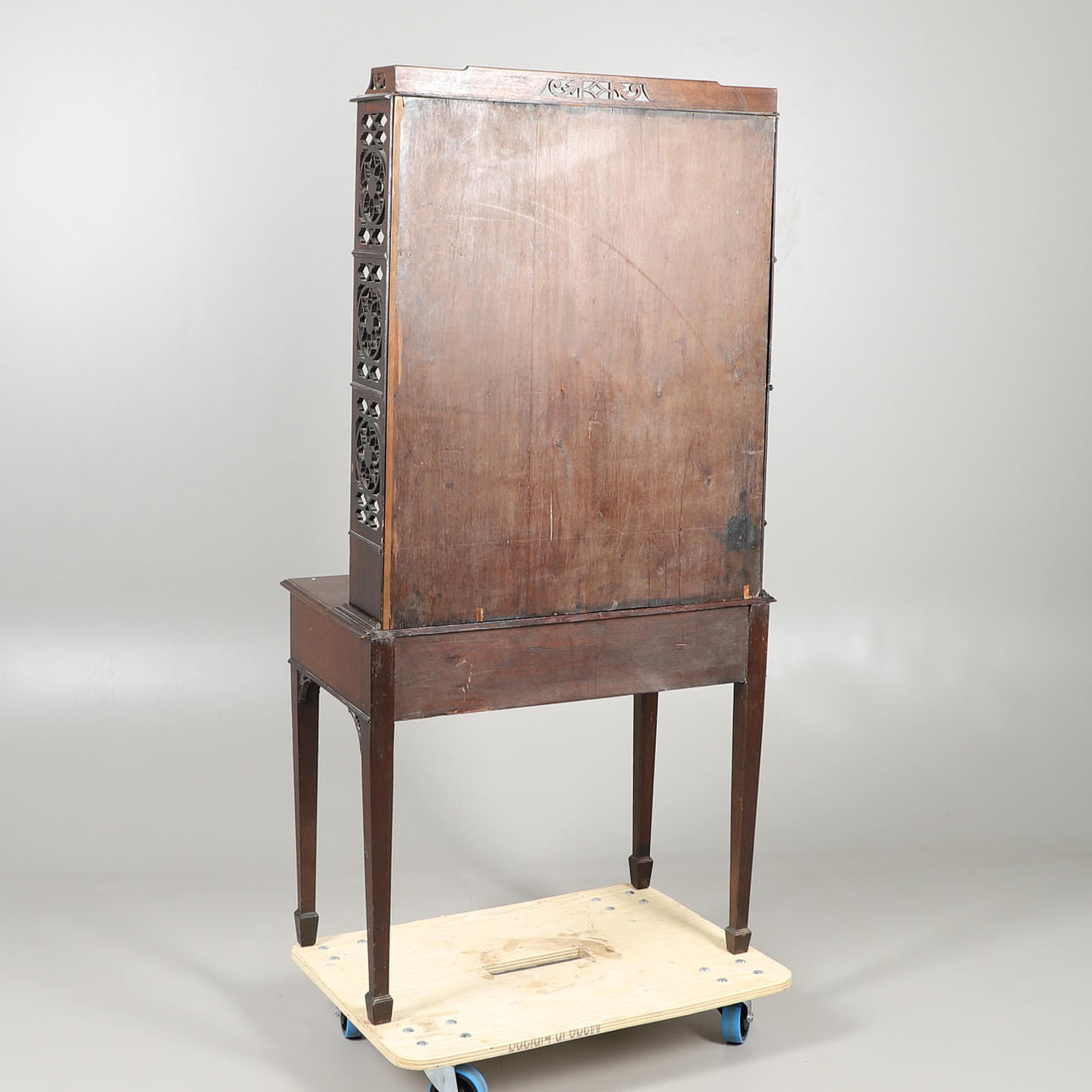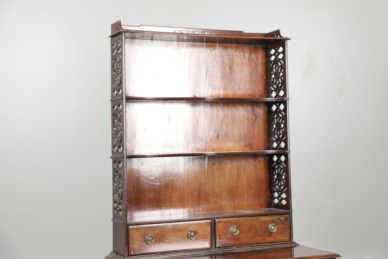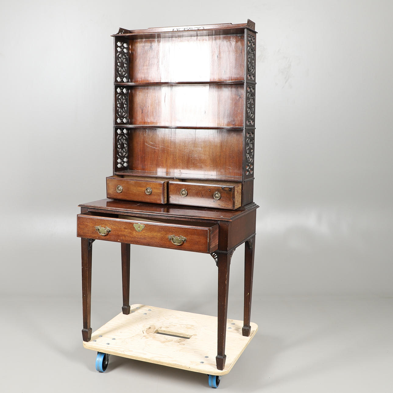 2623654. A MAHOGANY TABLE WITH FRETTED DISPLAY SHELVES.