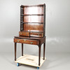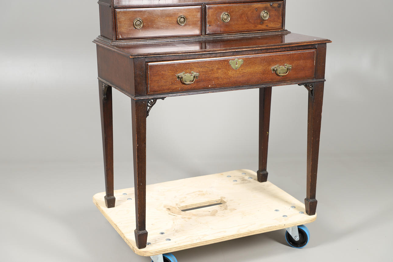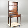the upper shelved section fretwork roundel sides and two drawers, the table with single drawer on square tapering legs and spade feet, 163cm high x 82cm wide x 45cm deep.