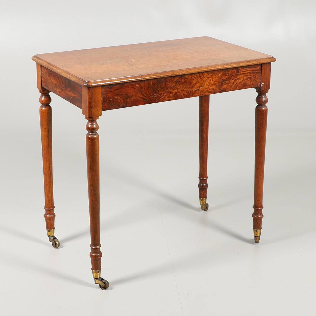 the single drawer with burr wood veneer on turned tapering legs and bras casters, 67cm high x 69cm wide x 42cm deep.