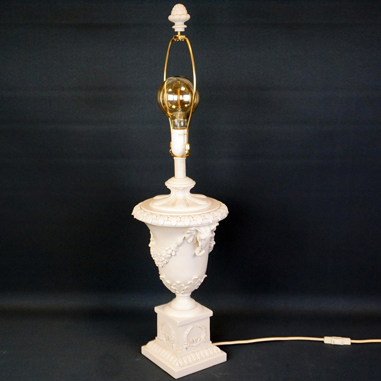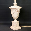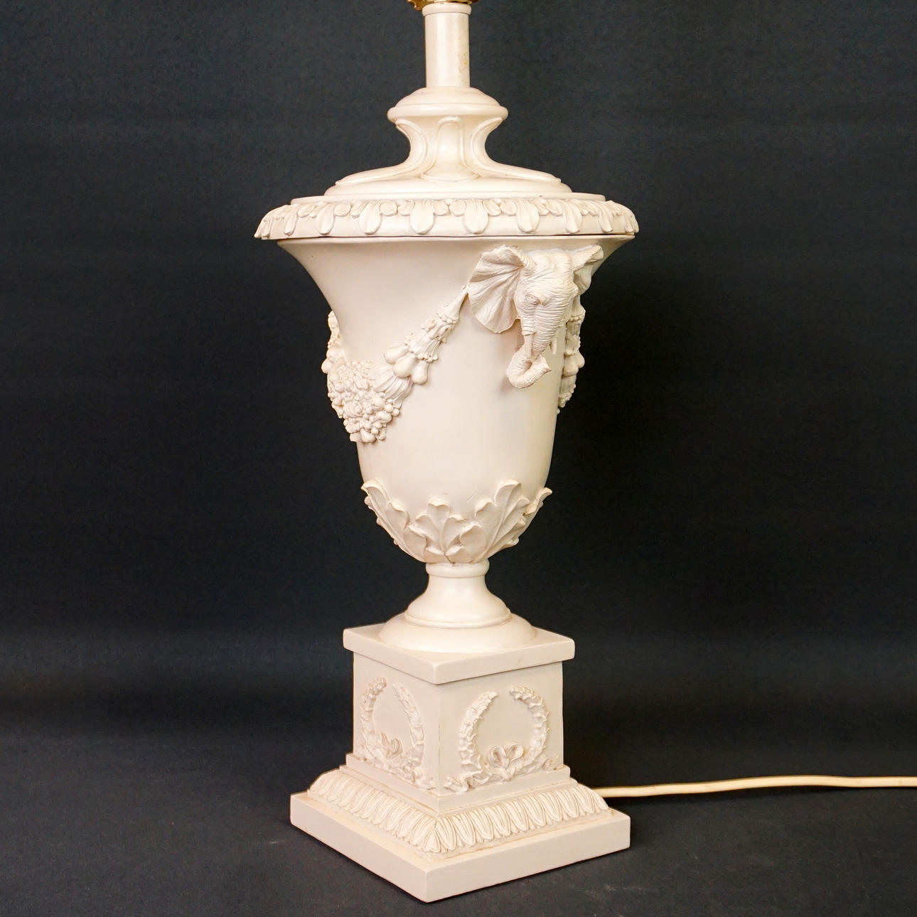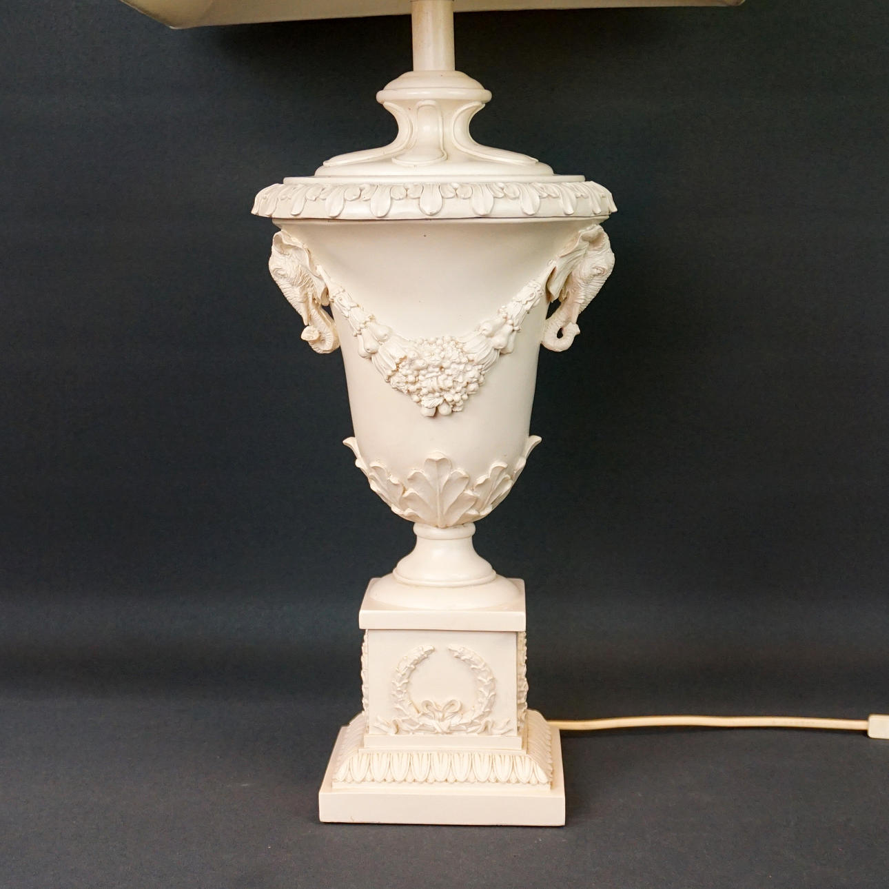 Table lamp in artificial pulp with decoration of plant garlands and elephant heads. Screen in textile. Height approx. 63 cm, width with screen approx. 41 cm x 41 cm.