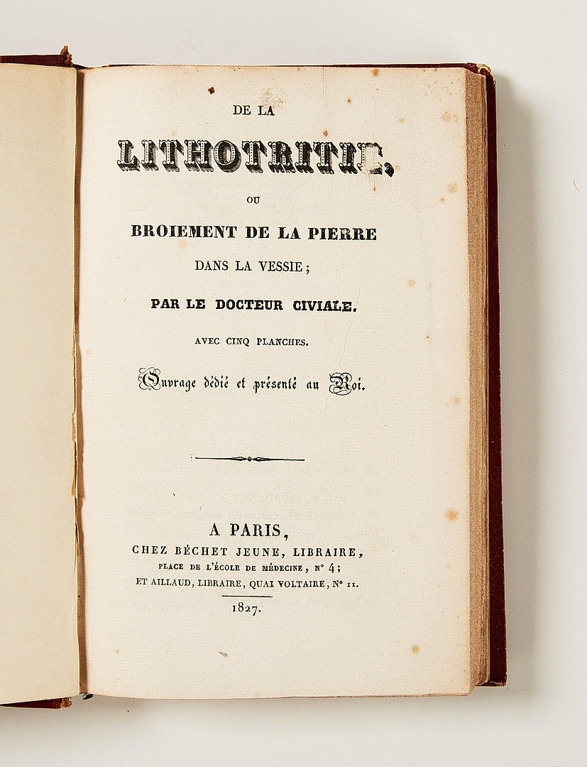 CIVIALE, (JEAN, LE DOCTEUR CIVIALE). De la lithotritie, ou broiement de la pierre dans la vessie. Paris, chez Béchet Jeune, 1827.