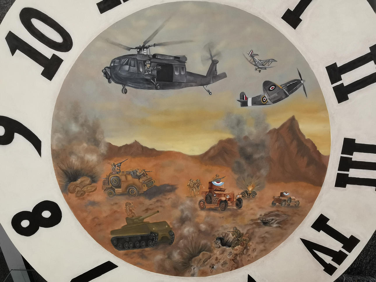 A large hand painted war related clock face on mdf, Dia. 120cm.