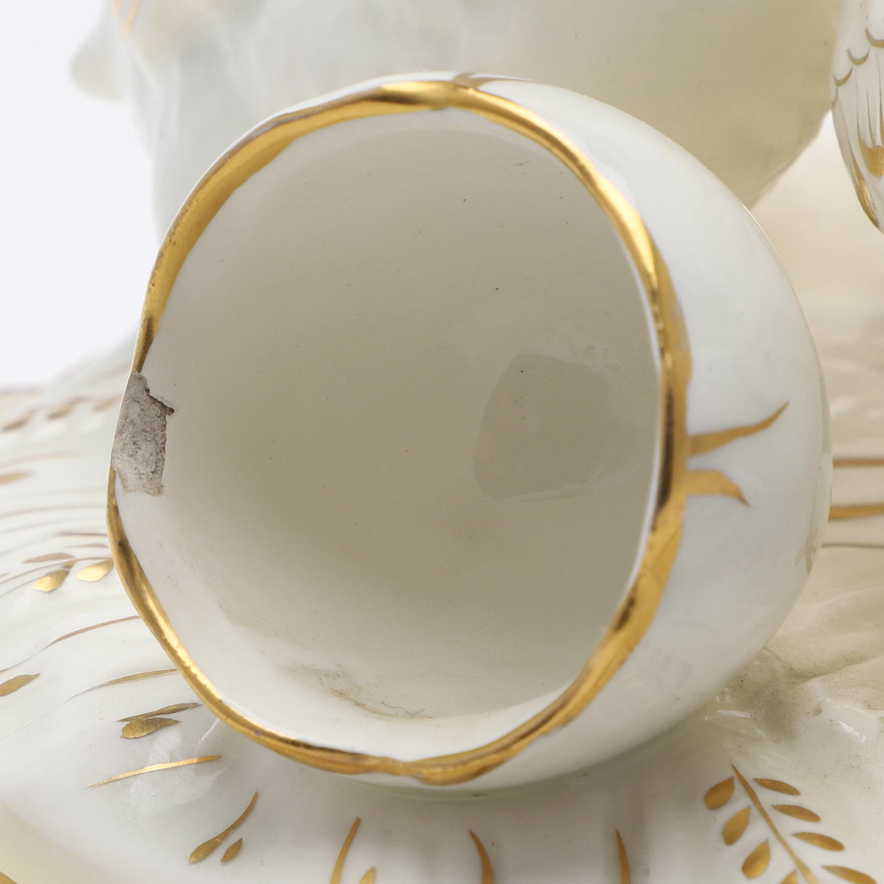 Chips on an eggshell, wear on gold decoration, cracks.