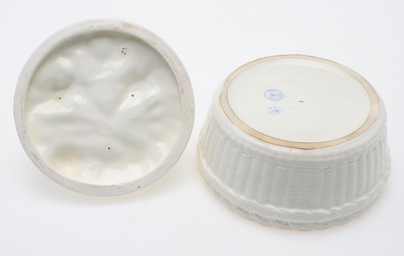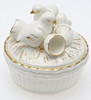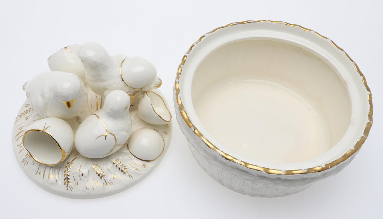 Cover with chickens and eggs Height approx. 16 cm, diameter approx. 17.5 cm.