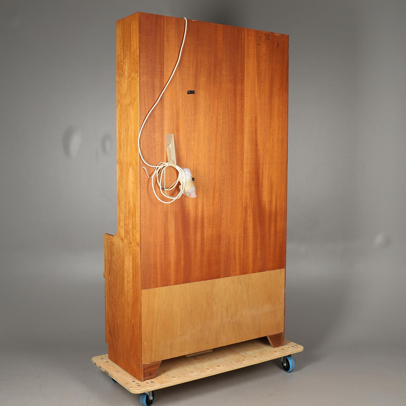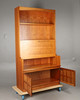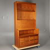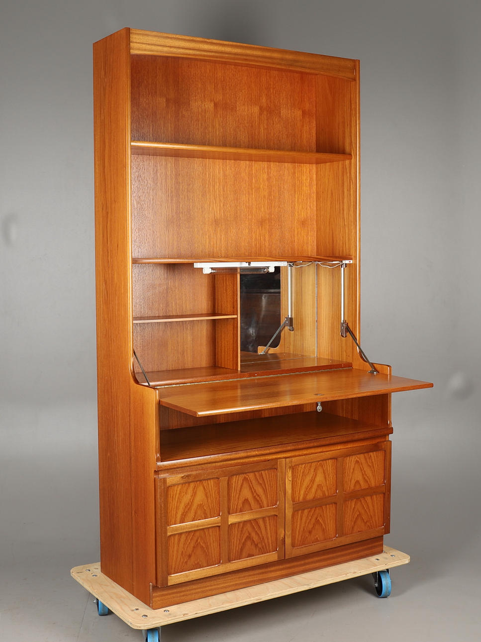 Mid-20th century, the upper section with two long shelves over a fall front enclosing a mirrored drinks cabinet, over a two door base.