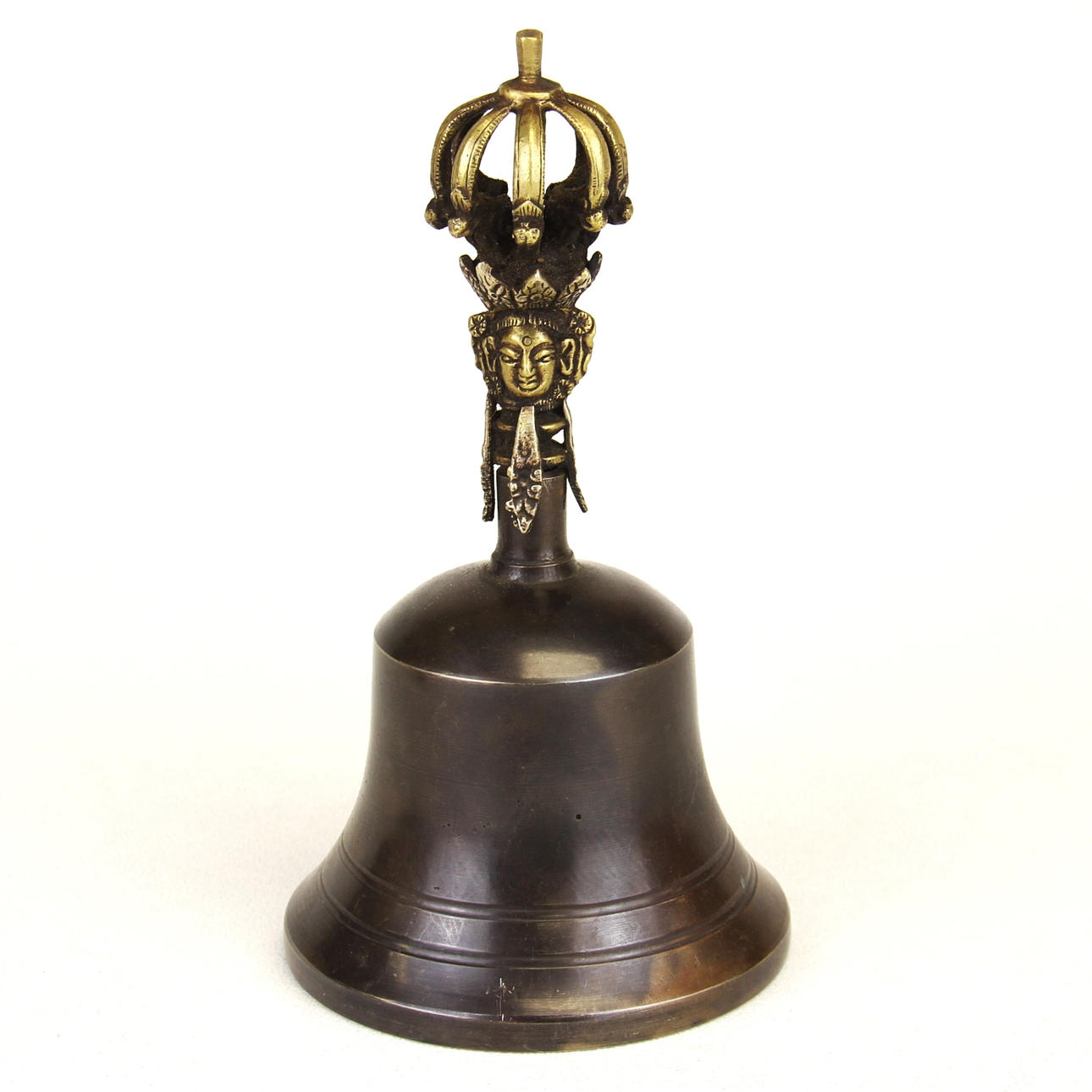 A Tibetan bronze temple bell and a dorje with cases, bell H. 15.5cm.