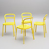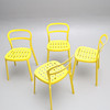 Gold lacquered aluminium, stackable. Seat height 46.5 cm, total height 78.5 cm, width 42 cm, depth 45 cm.