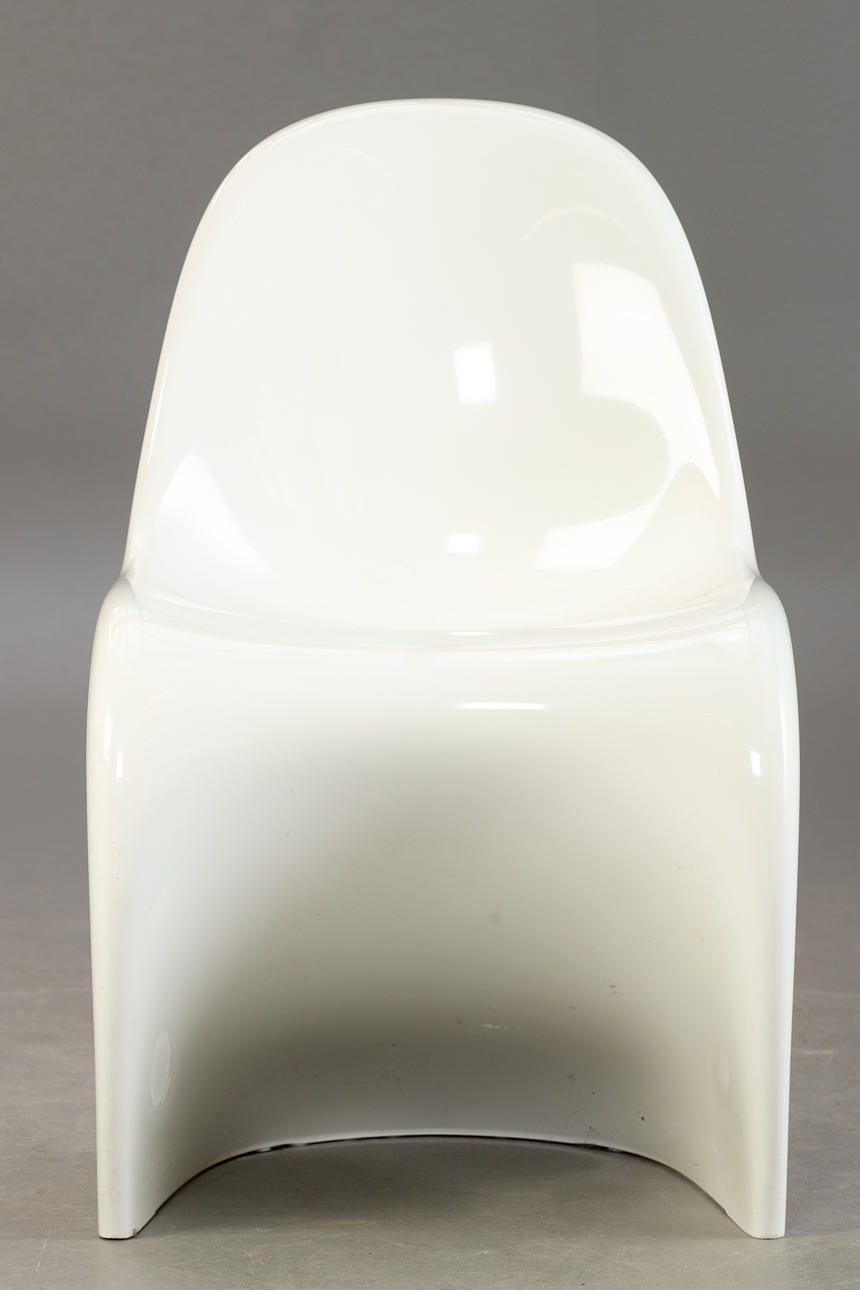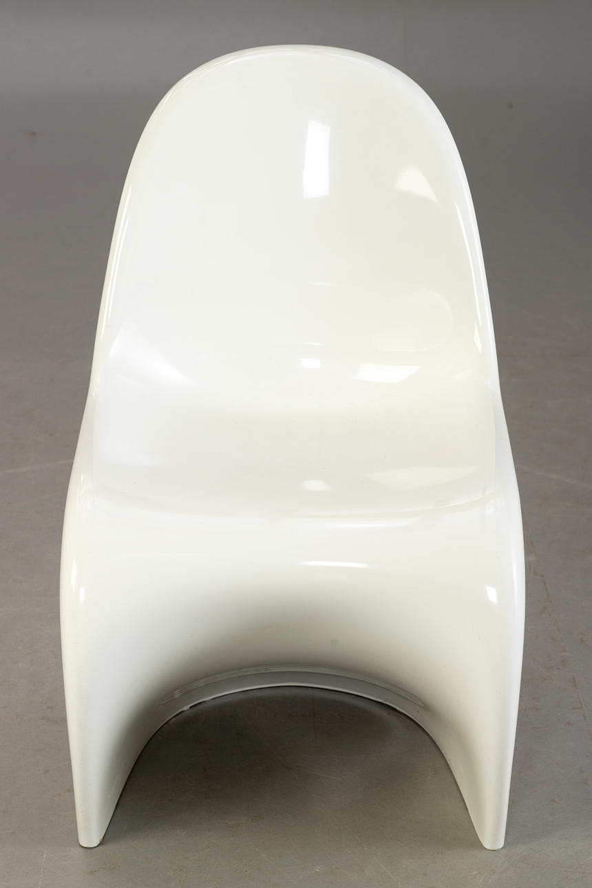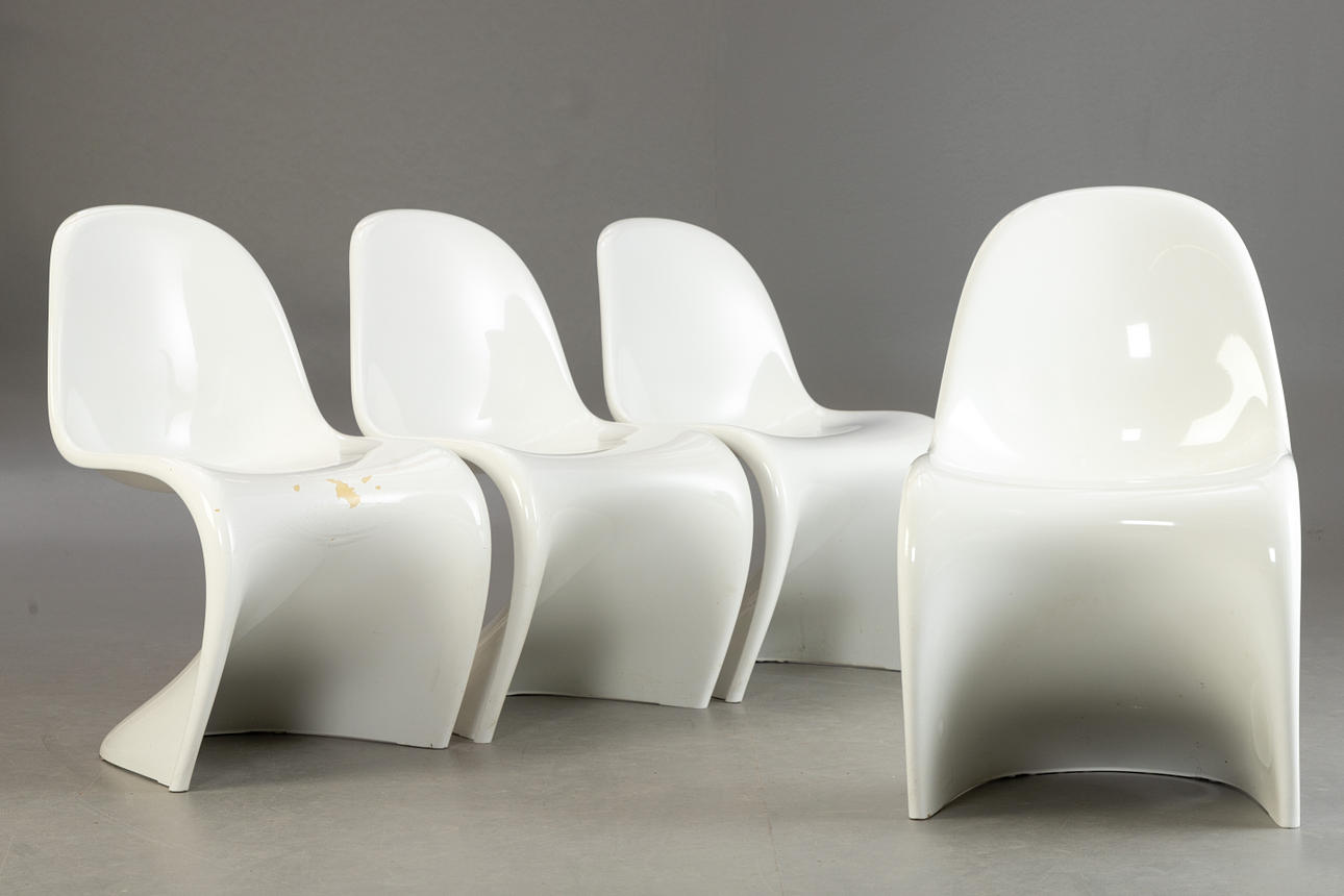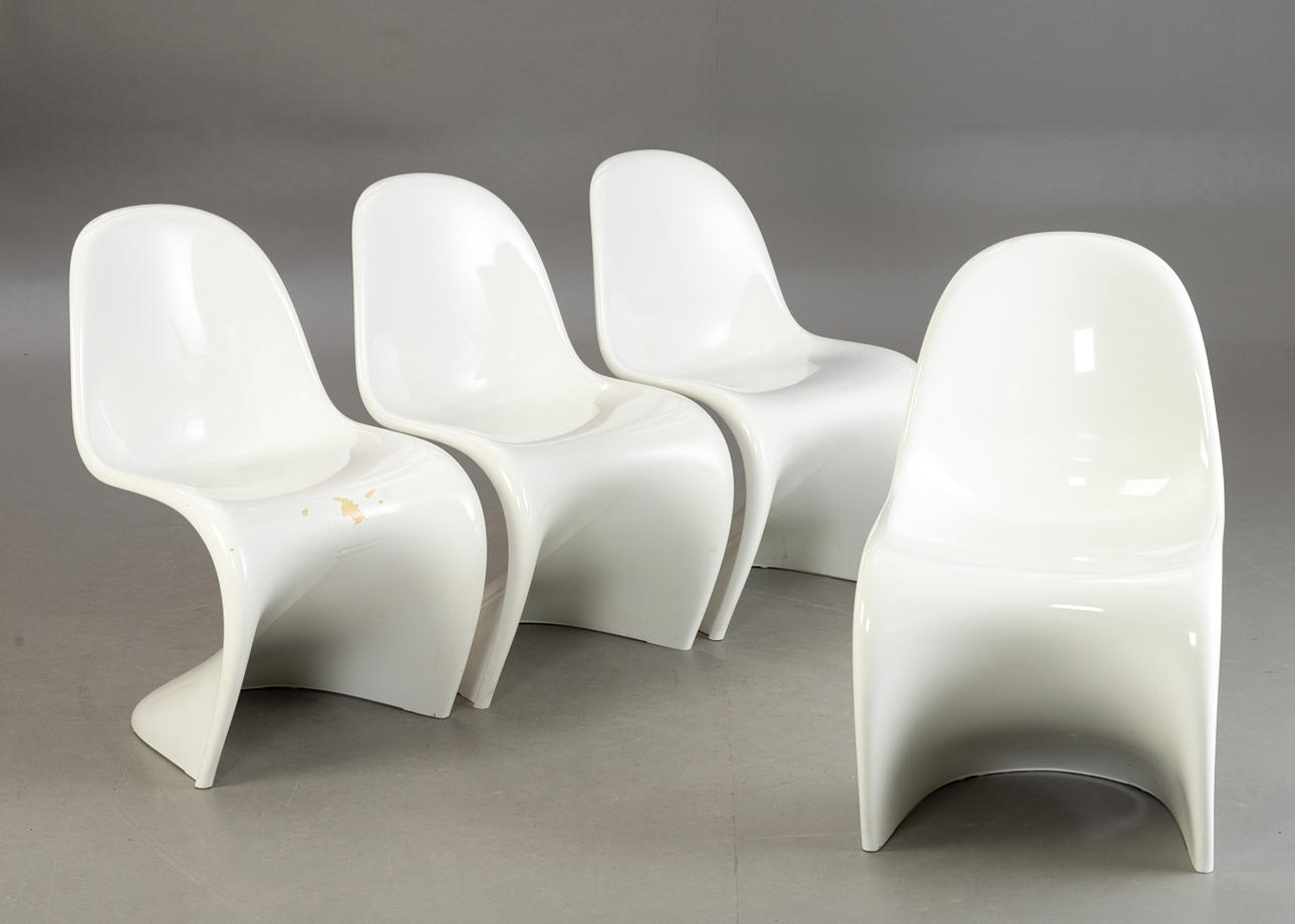 4 'Panton Chairs' by Verner Panton. Manufacturer: Vitra. Plastic construction, high-gloss white. Draft 1959. Marked below. Stackable.