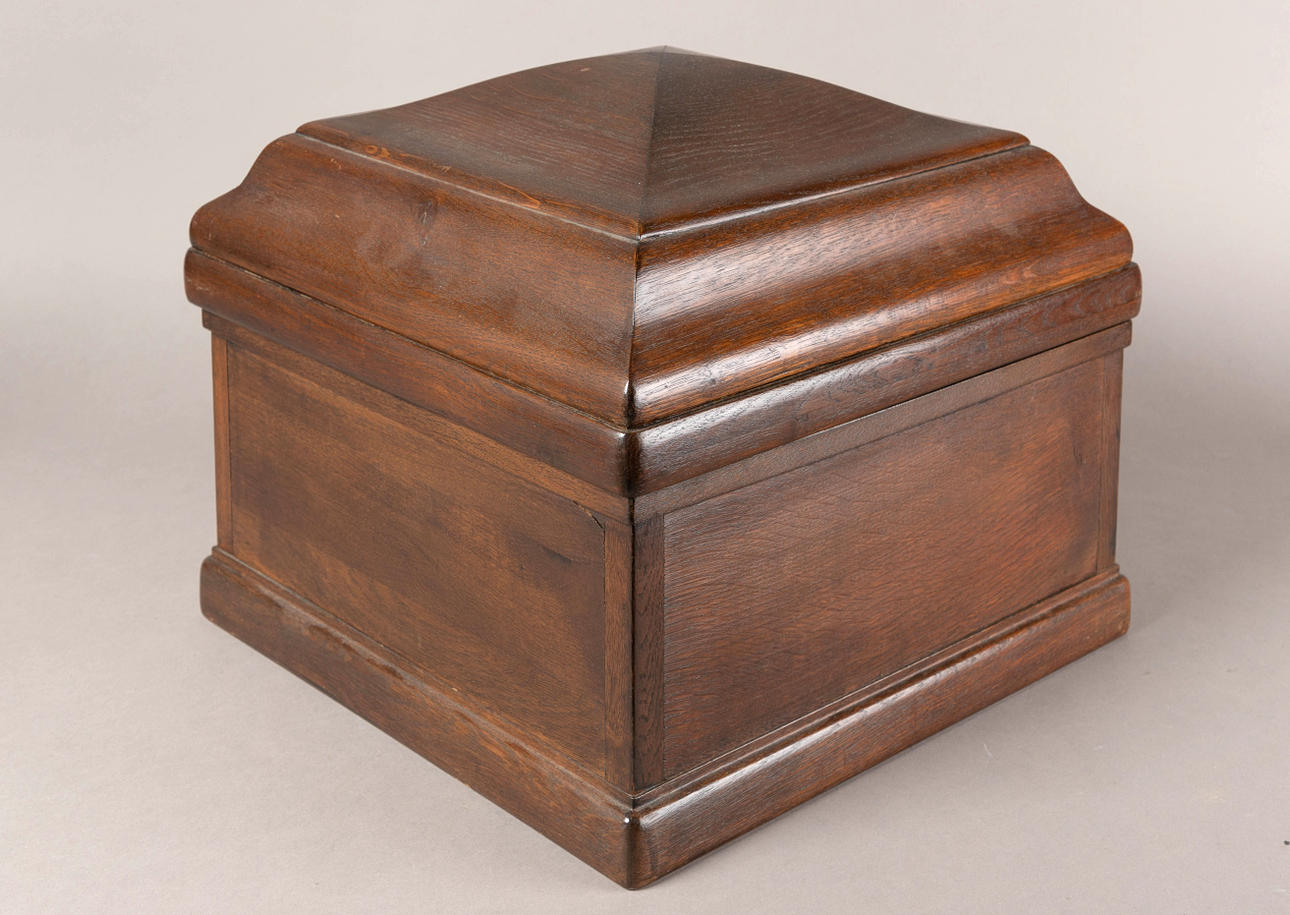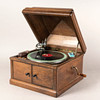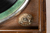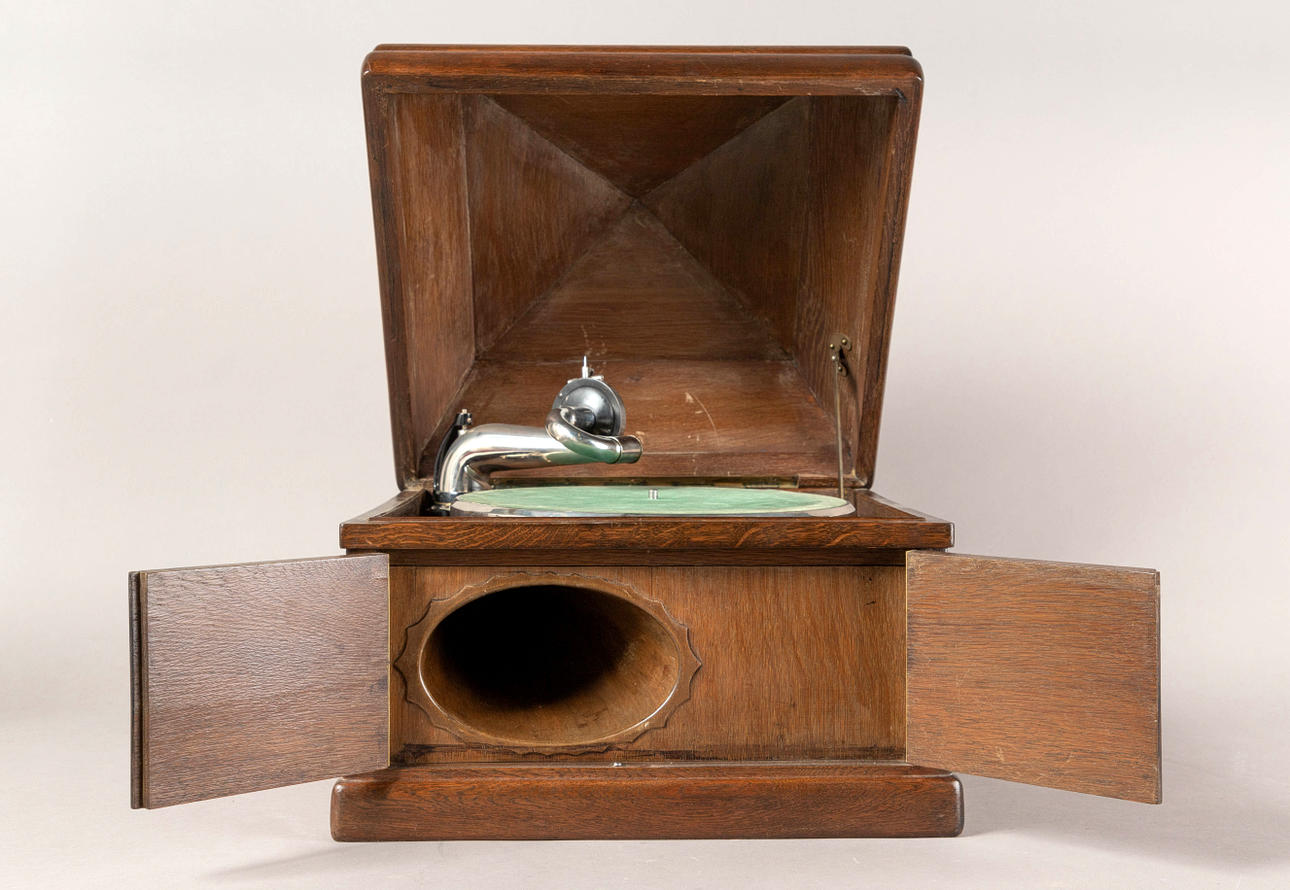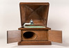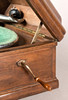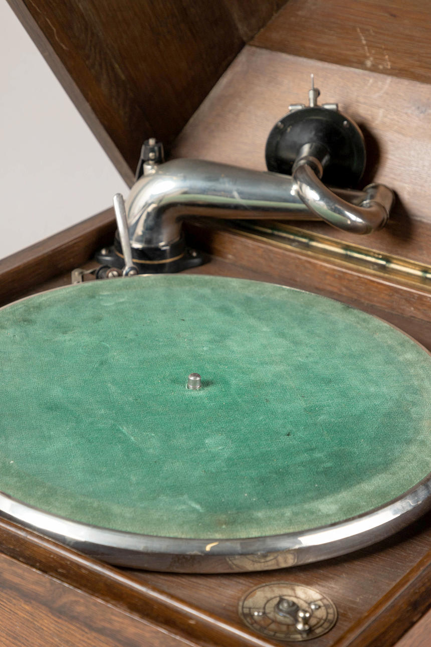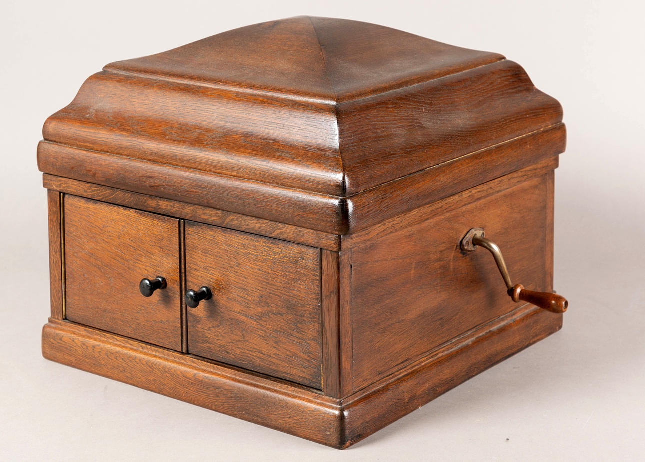 oak/metal Rectangular body with staggered, domed lid. On the visible side, behind two doors, is the integrated funnel loudspeaker. Mechanical drive via side crank. Speed controller (worn), pivoting pickup. HxWxD: approx. 37 x 41 x 41 cm.