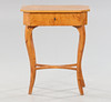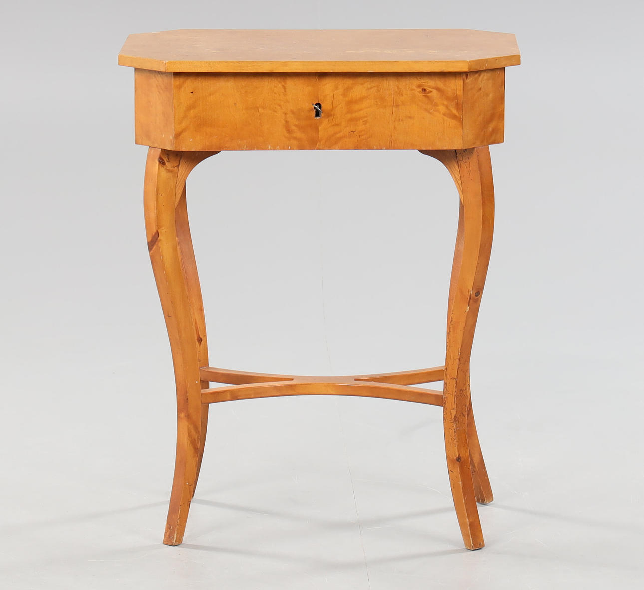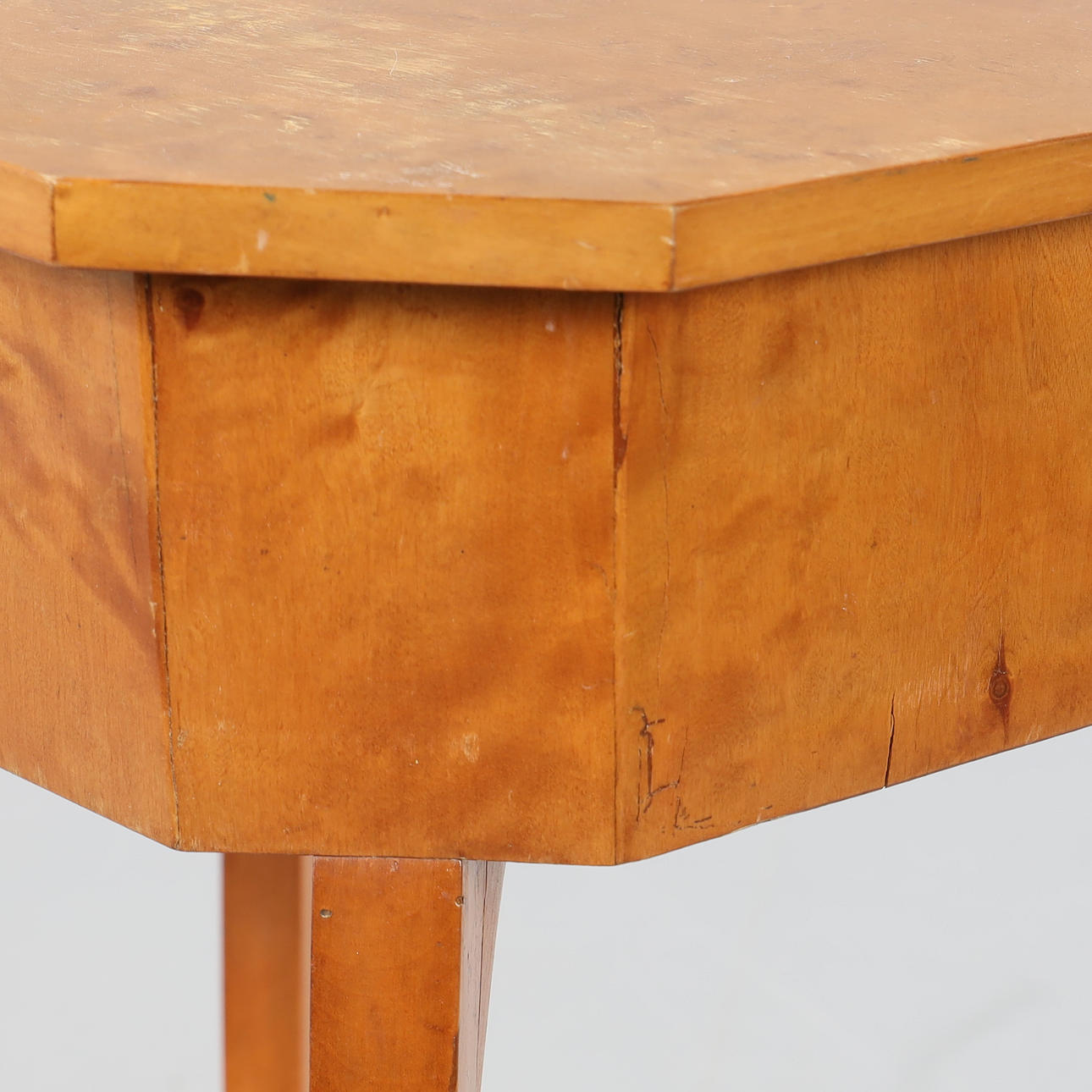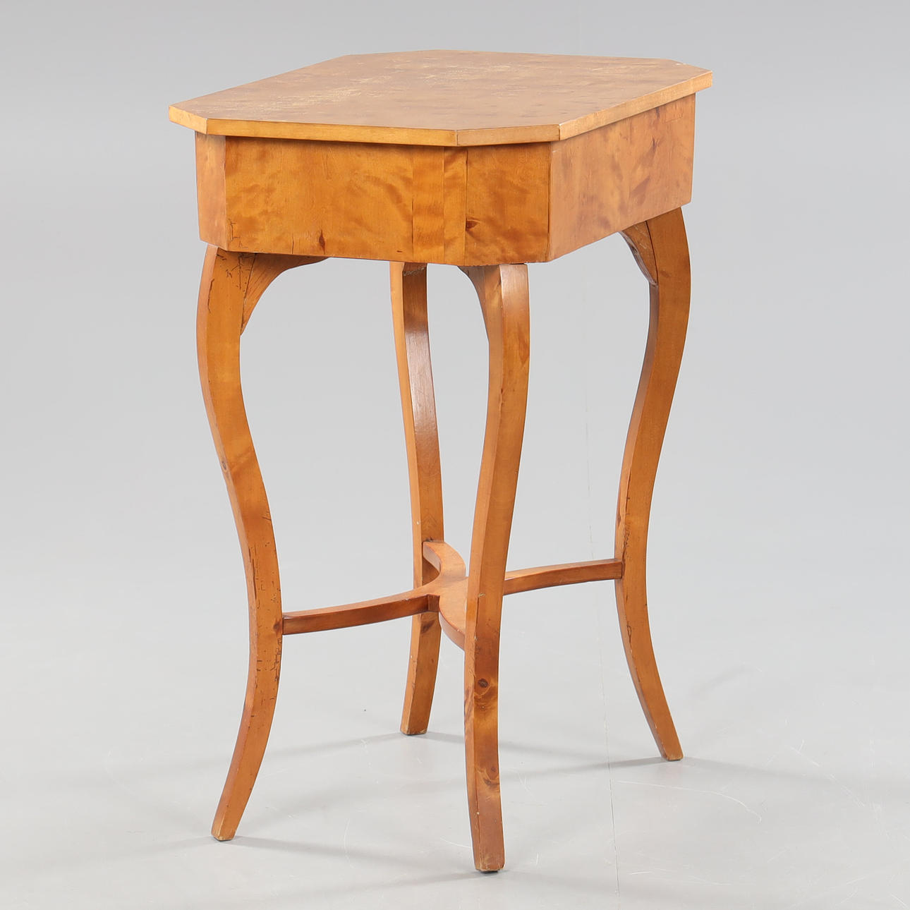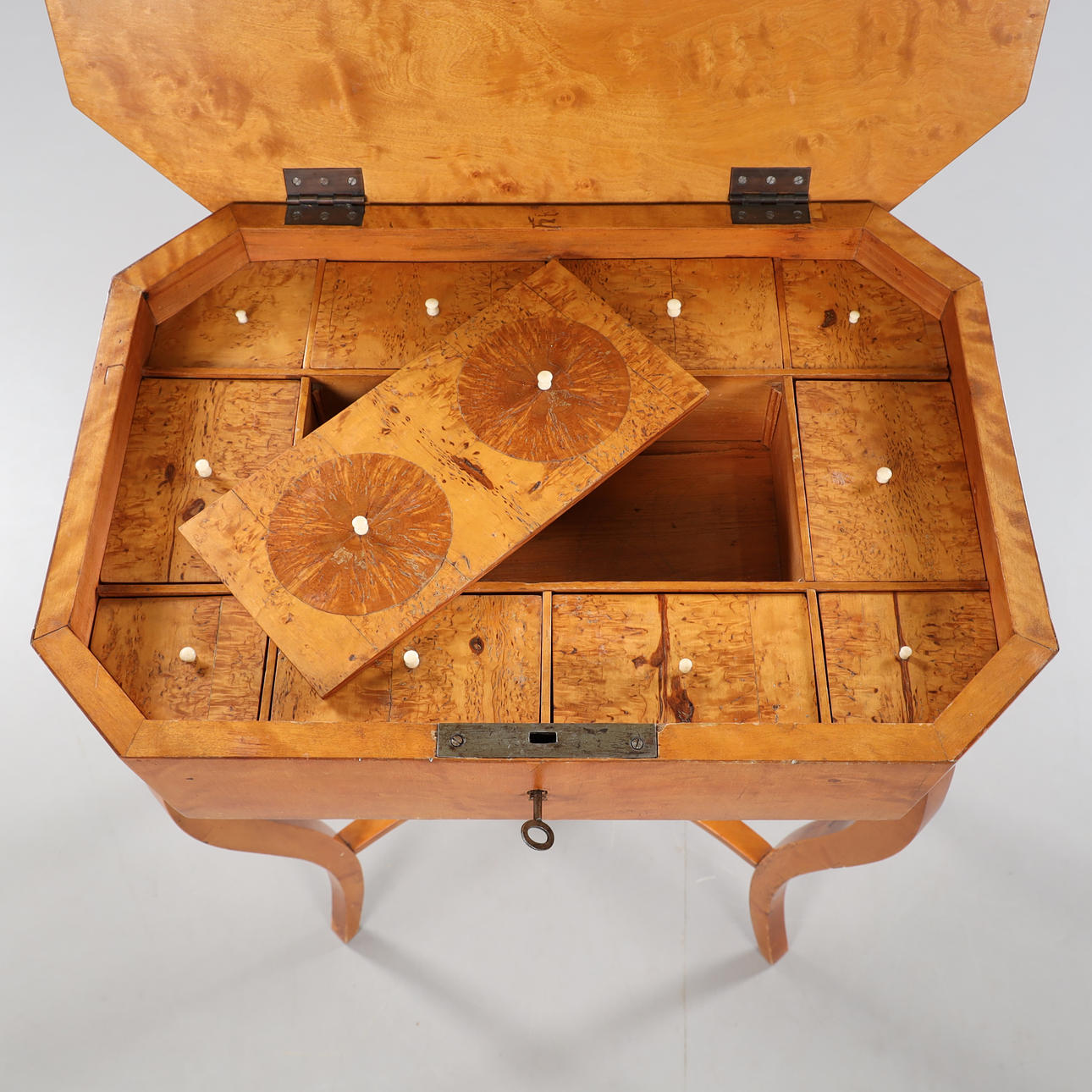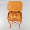 connected legs, interior with various compartments, cover veneered in Masur birch, height approx. 75, 60x42 cm.