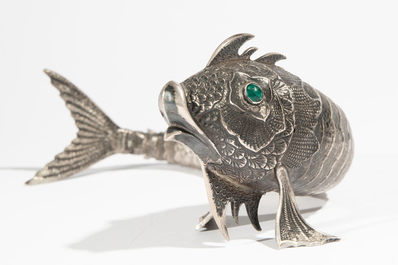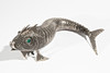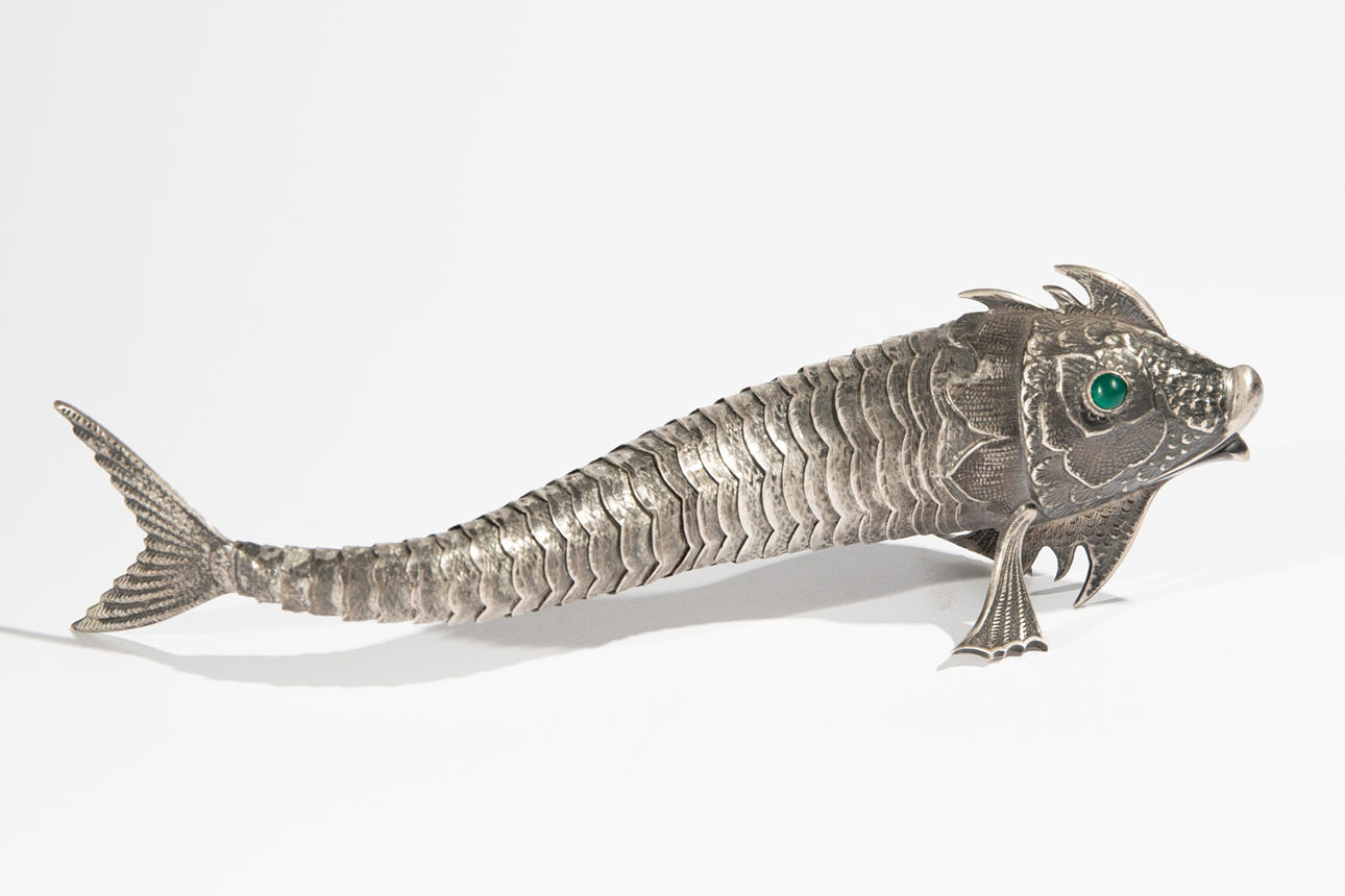 lucky fish China. Silver/ silver plated with green glass eyes, moveable body. 6 x 23 x 6 cm.