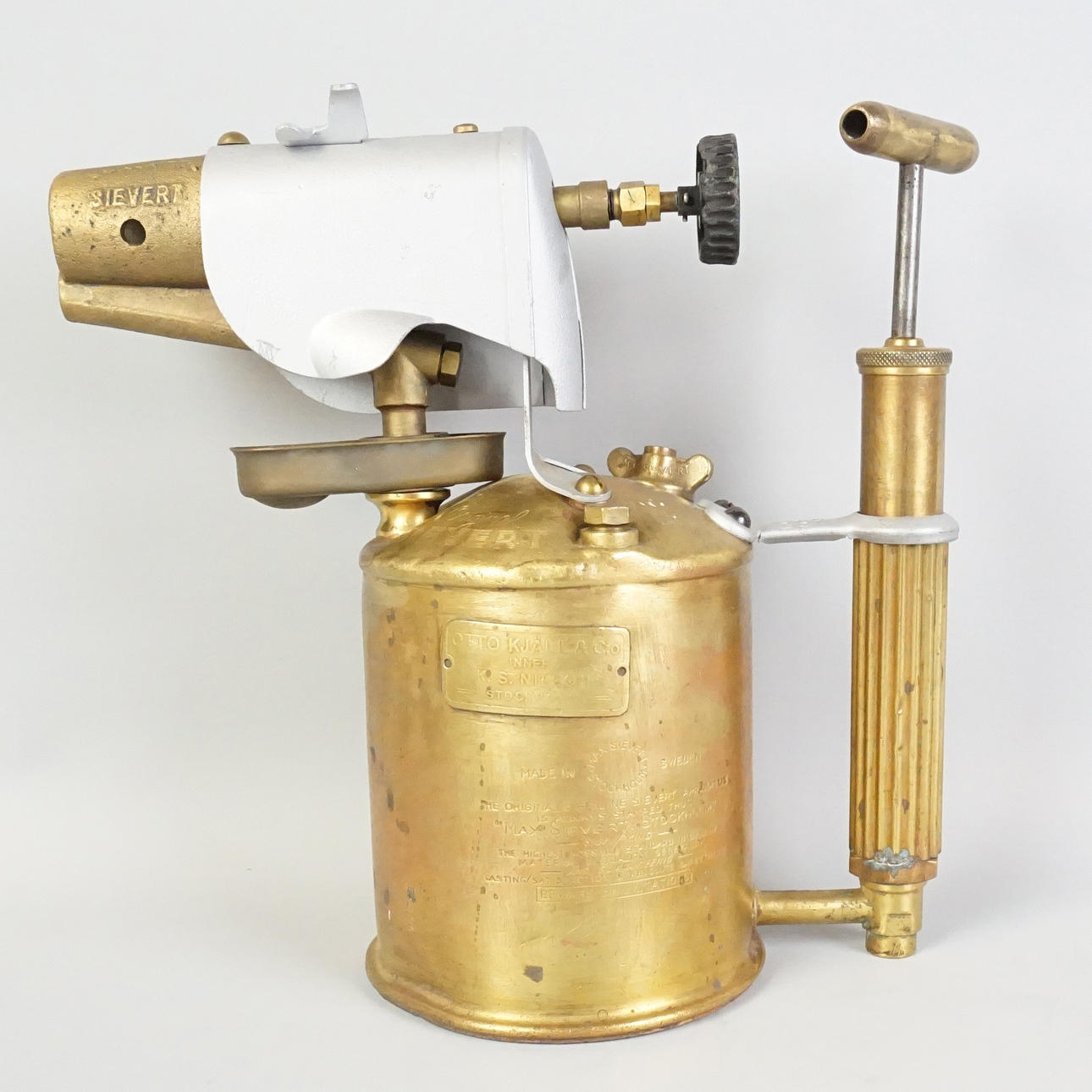 Blowtorch, brass, Max Sievert no. 257, length approx. 26 cm, height approx. 24.5 cm and a small Sievert marked "L", length approx. 15 cm, height approx. 12 cm.
