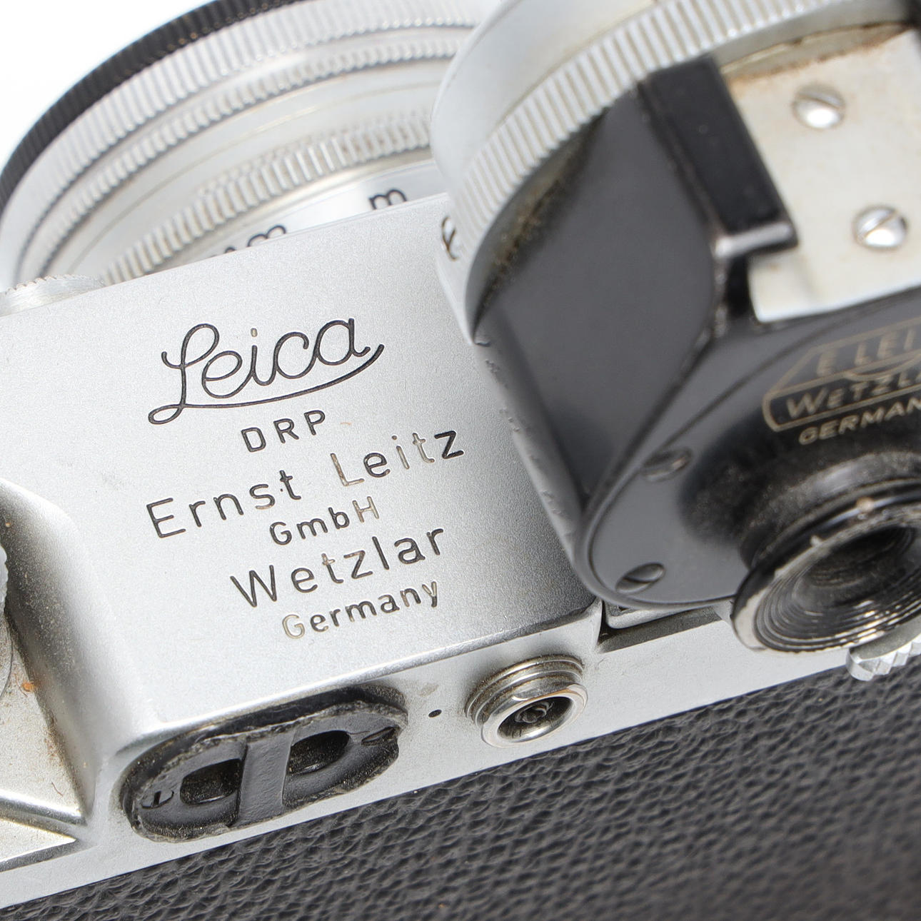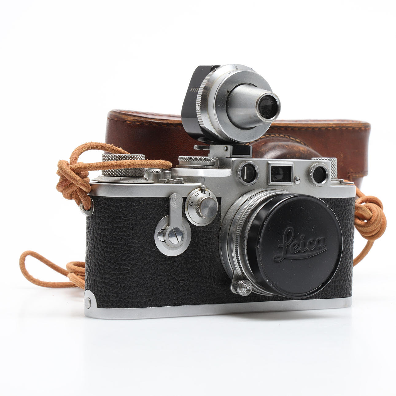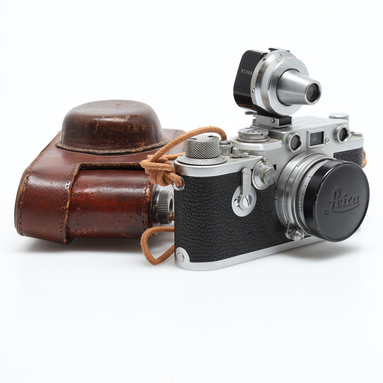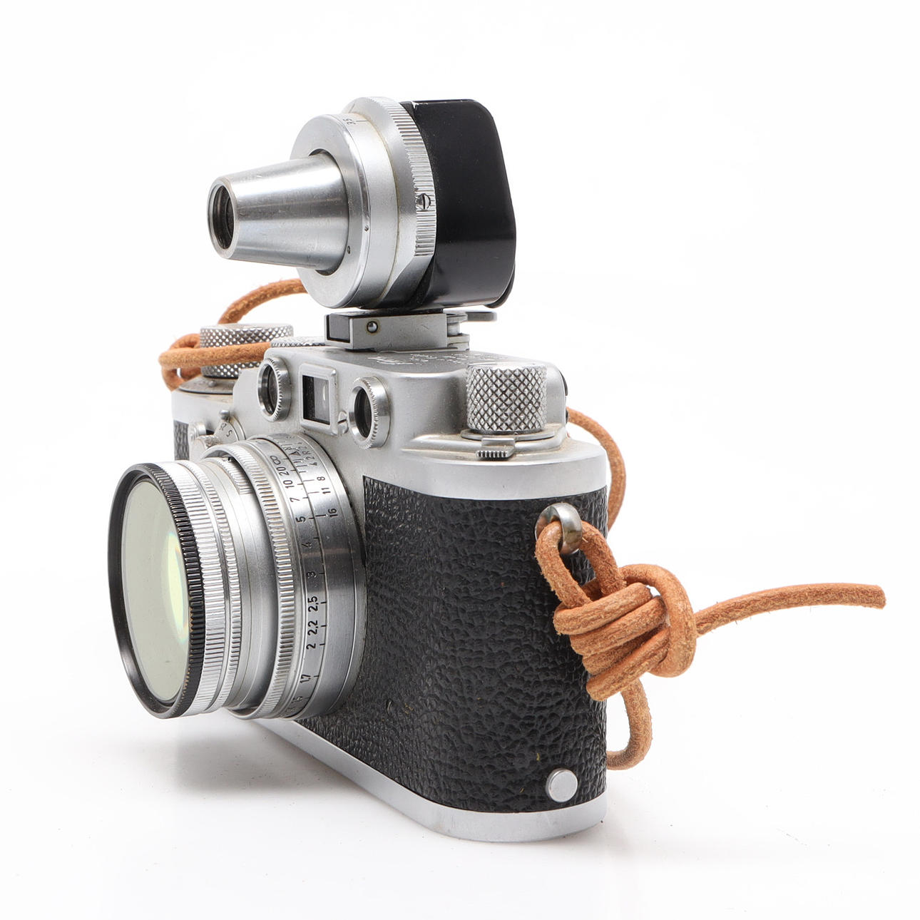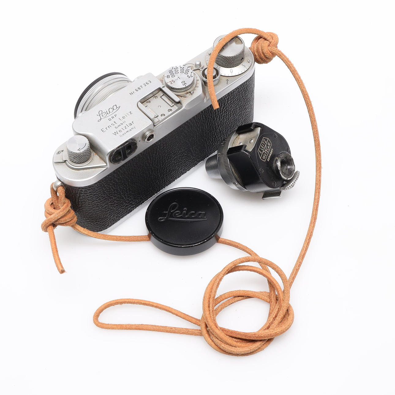 Serial no. 687263, camera body length approx. 13.5 cm Lens Ernst Leitz Wetzlar Summitar f=5 cm, 1:2 No. 815110. Finder E. Leitz No 83368, E. Leitz UV filter Leather case.