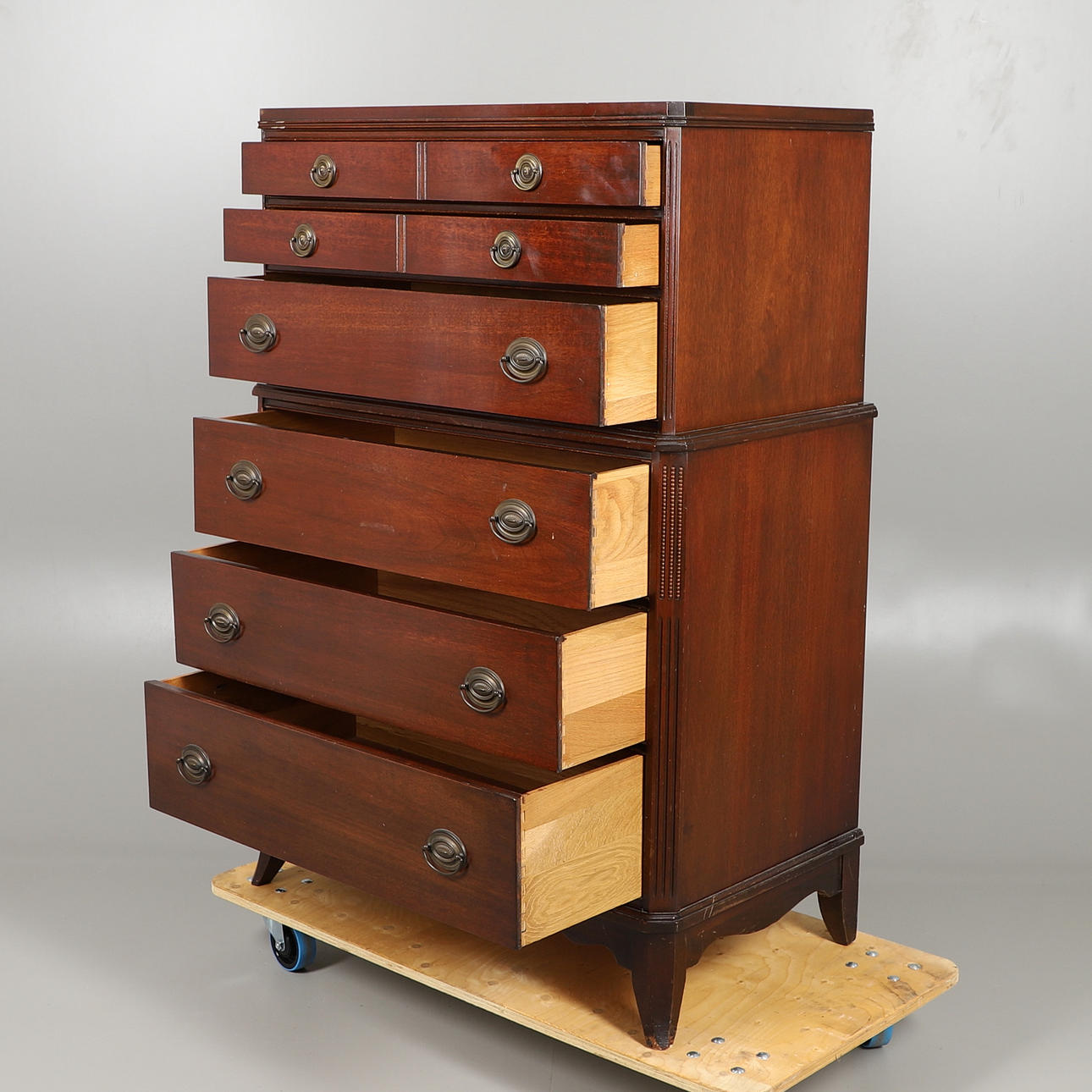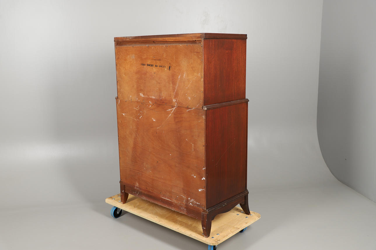 In the style of an early 20th century chest on chest, with brass handles, containing 5 drawers and featuring beaded decoration. Makers label shows it is of American manufacture in genuine mahogany. Height 135cm x Length 93cm x Depth 52cm.