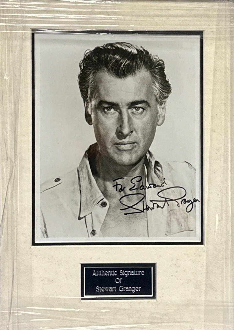A framed photograph signed by Stewart Granger (British 1913-1993) with a certificate of authentication by Todd Mueller, frame size 35.5 x 46.5cm.