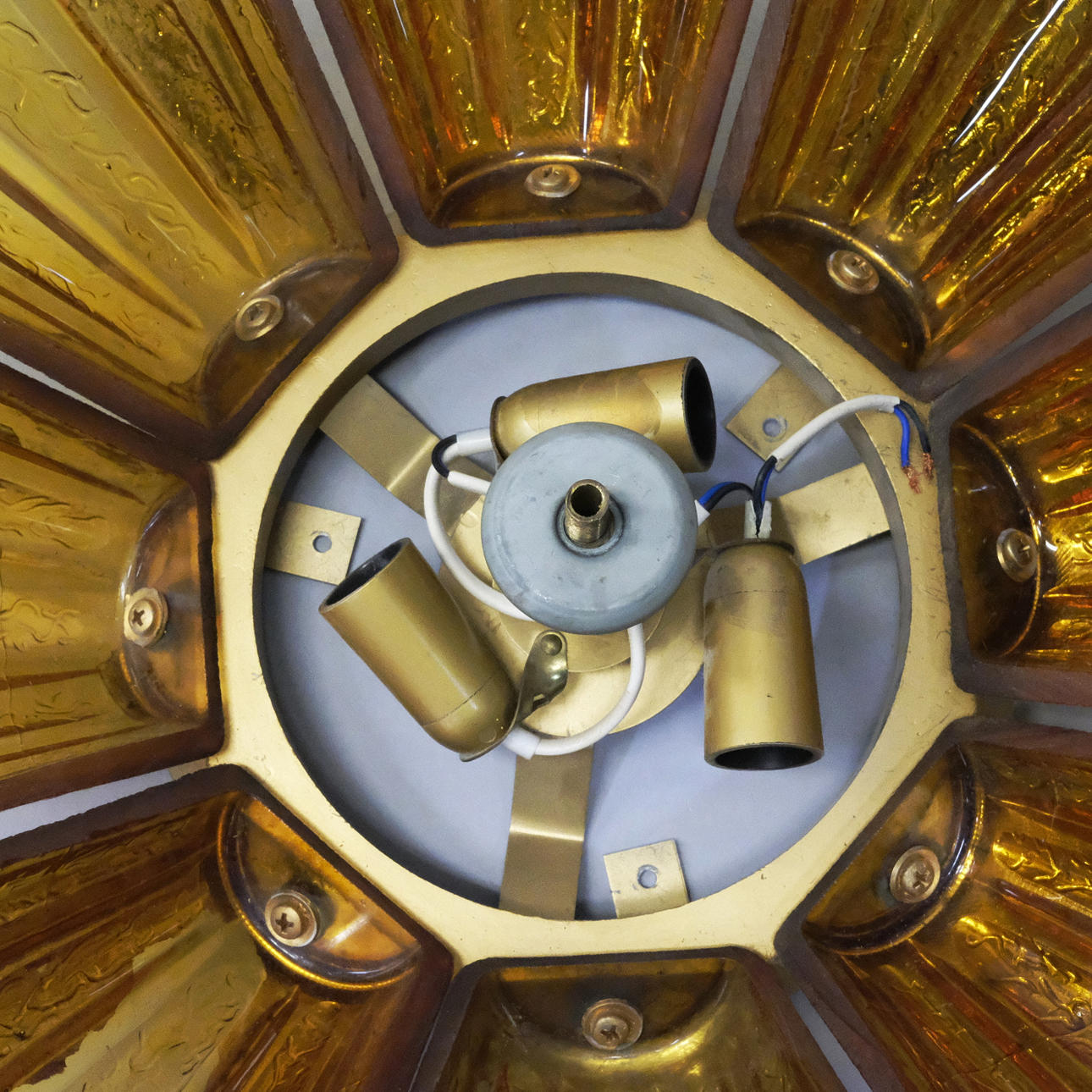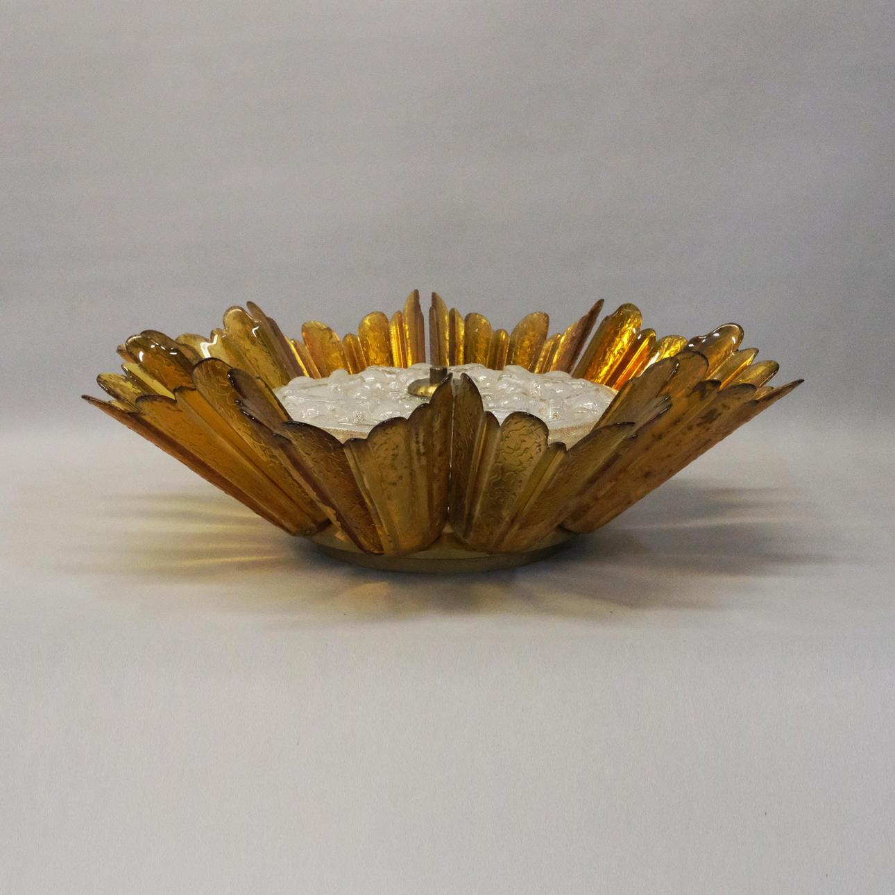 Lampshade in brown folded glass, as well as decorated uncoloured opaque glass. Diameter: approx. 56 cm. Height/depth: approx. 15 cm.