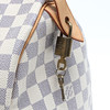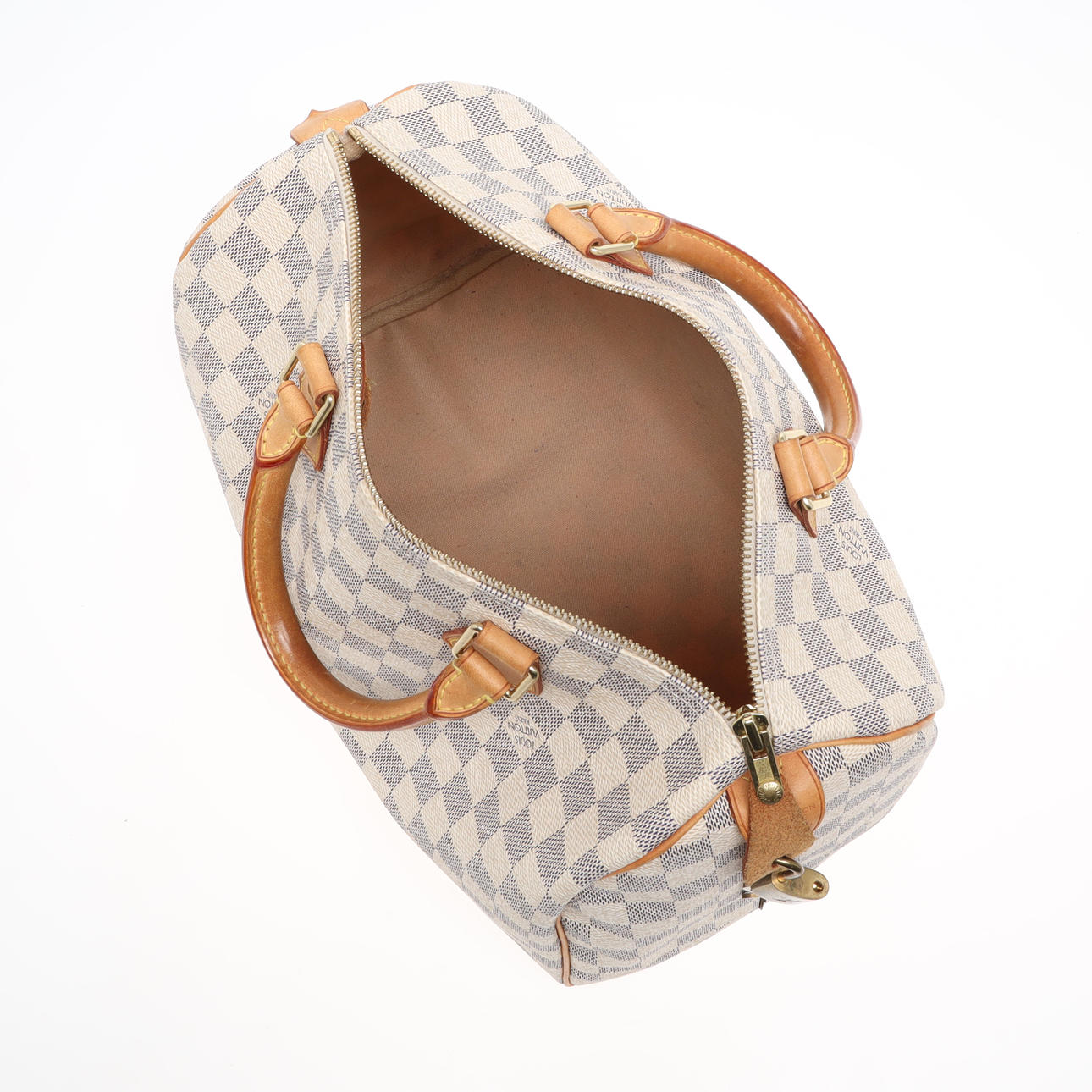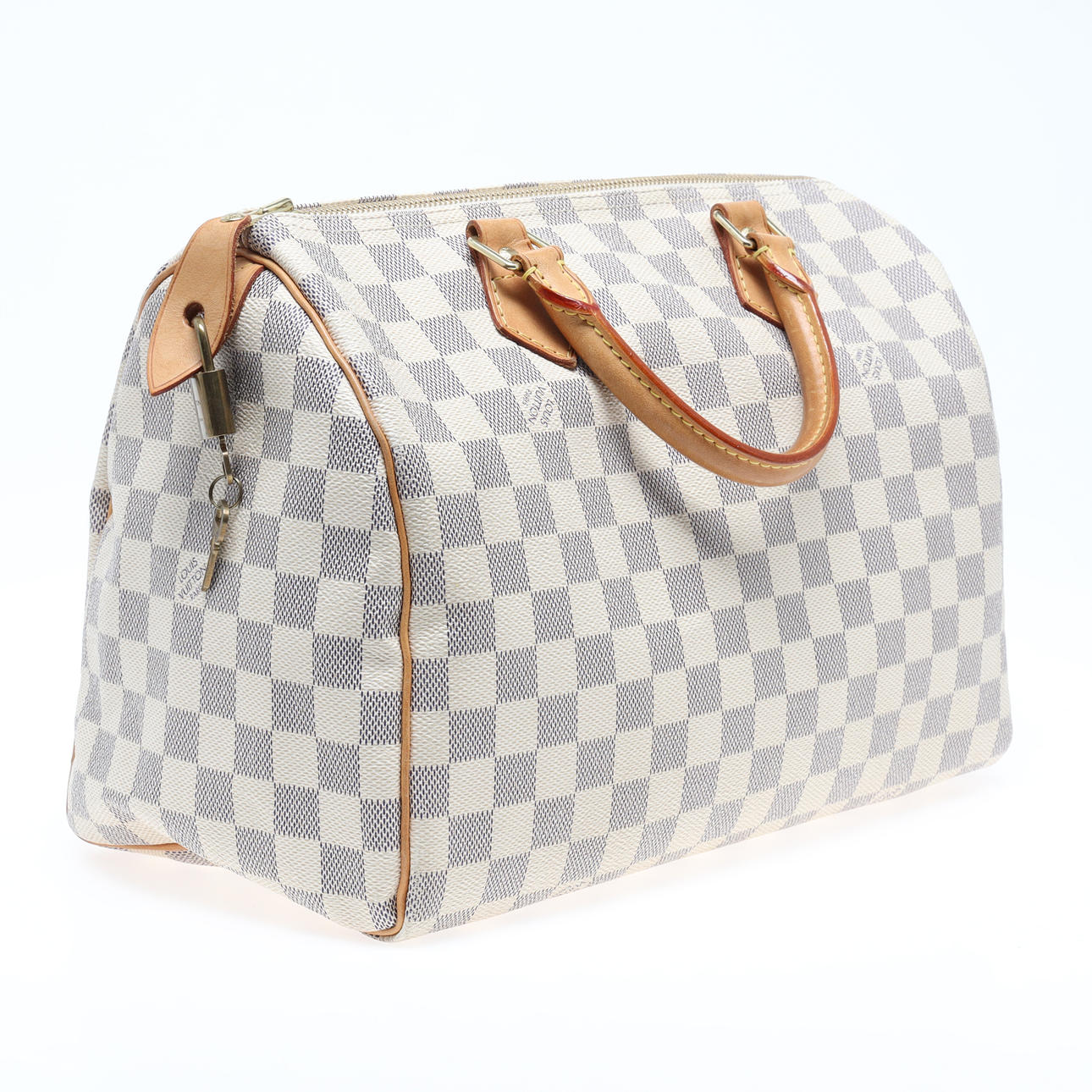 Handbag in light Damier patterned canvas with details in core leather and hardware in yellow metal. Interior with a side compartment. Padlock with keys included. Marked LOUIS VUITTON, PARIS, made in France. Serial number DU0068 (manufactured June 2008). Dimensions approx. H.21, 31x17 cm.