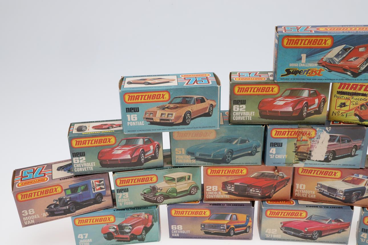 17 boxed models including 1 Dodge Challenger, 16 Pontiac, 28 Lincoln, 4 Chevy, 73 Model T Ford, 62 Corvette, 51 Pontiac, and various other models.