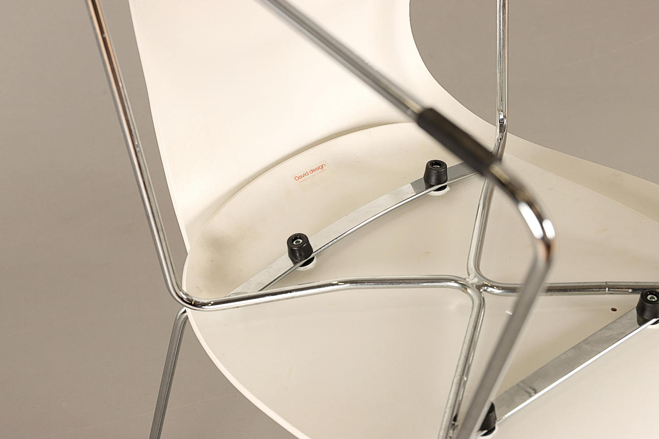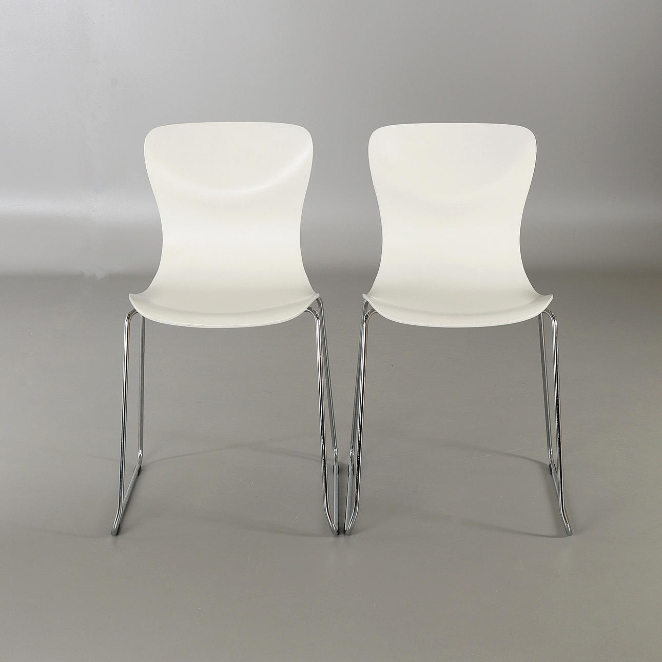 1 pair of chairs, "Swave", white lacquered, chrome legs, stackable. Labeled David design, design by Jon Lindström.