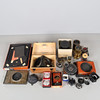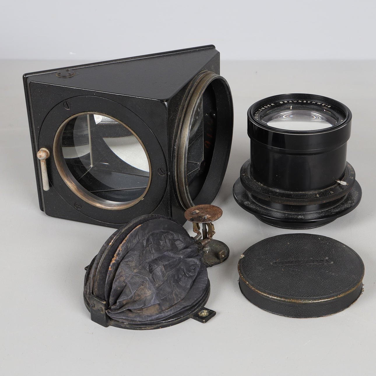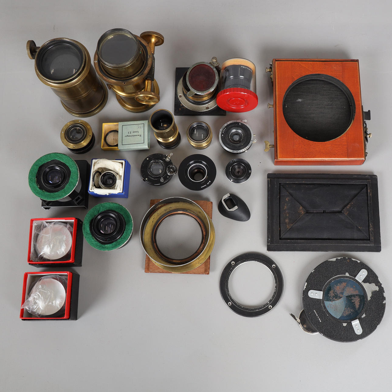 Consisting of, among other things; Carl Zeiss, Jena, Prism 10 cm. No. 9128; Voigtländer Braunschweig, APO-Scopes 1:9/60 cm, No. 3633151; London Made, objective 20 IN, No. 250377; Lenses in brass, 2 pcs, unmarked; Carl Zeiss, Jena, Anastigmat 1:9 f 230 mm, No. 6897; Schulze & Billerbeckm Goerlitz, Euryplan Weitwinkel 15 F 170 mm, No. 15747, and Euryplan Series V, 6.5 F 180 mm, No. 2; Rodenstock-Weitwinkel Perigon 1:12 f 11 cm No. 2297398 with shutter Compur-Rapid No. 6603292; Jos. Schneider & Co. Kreutznach, Doppel Anastigmat Jsconar 1:6.8, f 135 mm, No. 7083, with shutter AGC Derval; Pentax-110 1:2.8 70mm,1326004; Durst Lapla, Rodenstock Rodagon 1:5.6 f 150 mm; Durst Lapla, jRodenstock Apo-Rodagon 1:4 f 80 mm; Steinheil München, Cassar 1:3.5 / 50 mm VL, No. 847155; Meopta Belar, 4.5 / 50, No. 33822; As well as various parts.