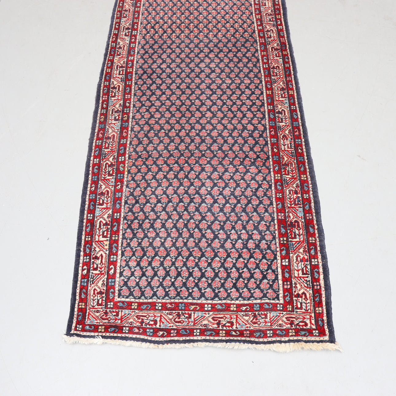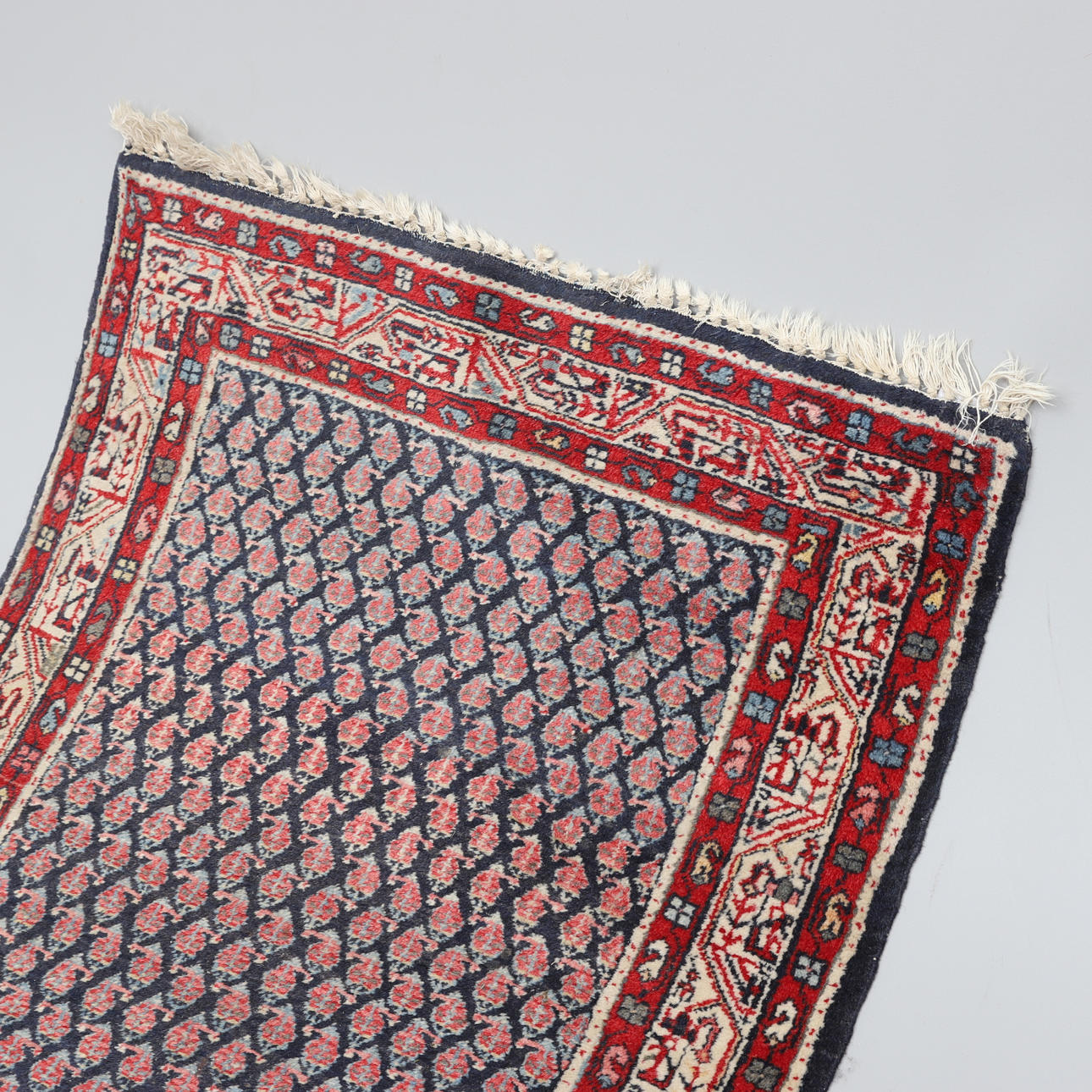 Normal wear and tear, minor stains, fringes not completely gone through. Somewhat uneven.