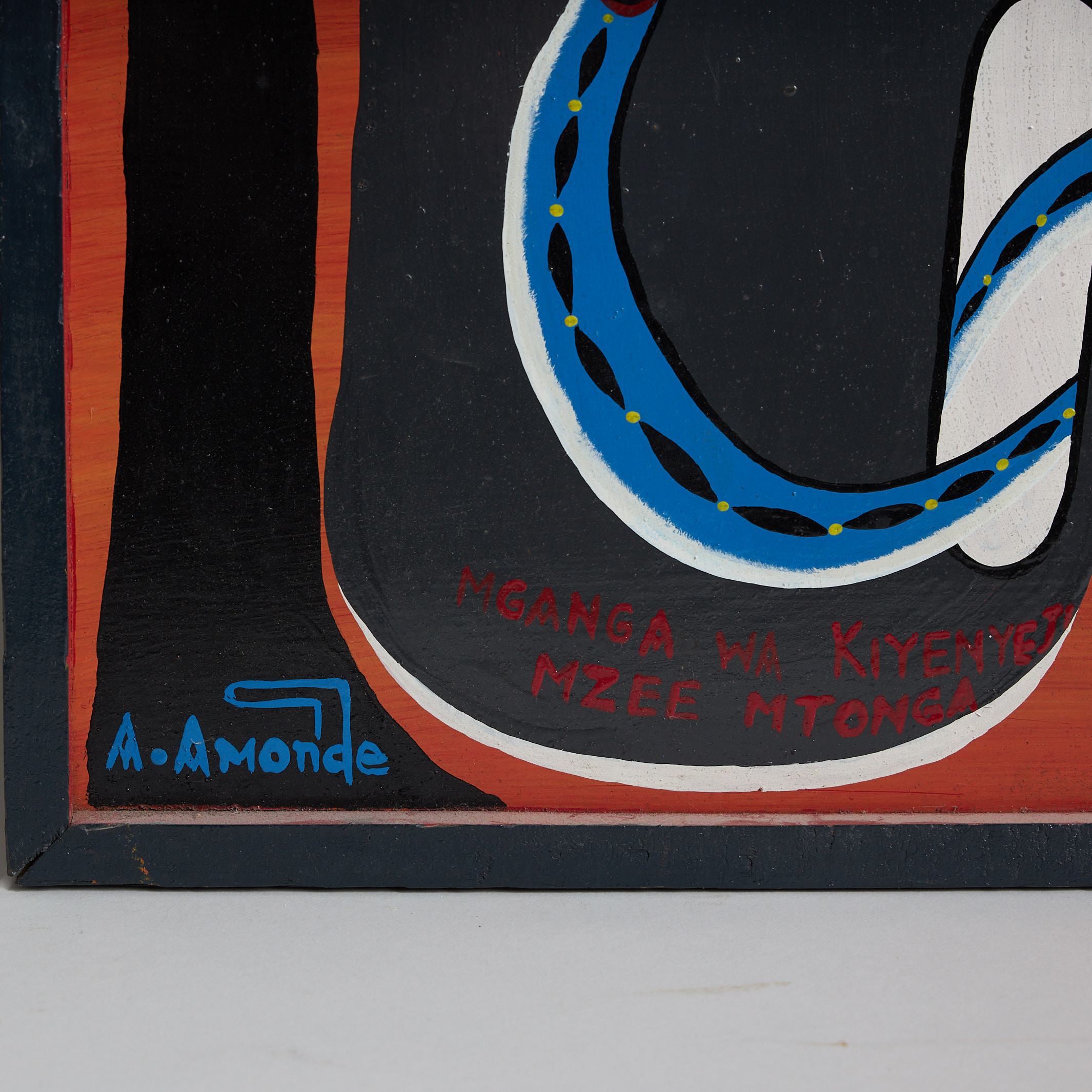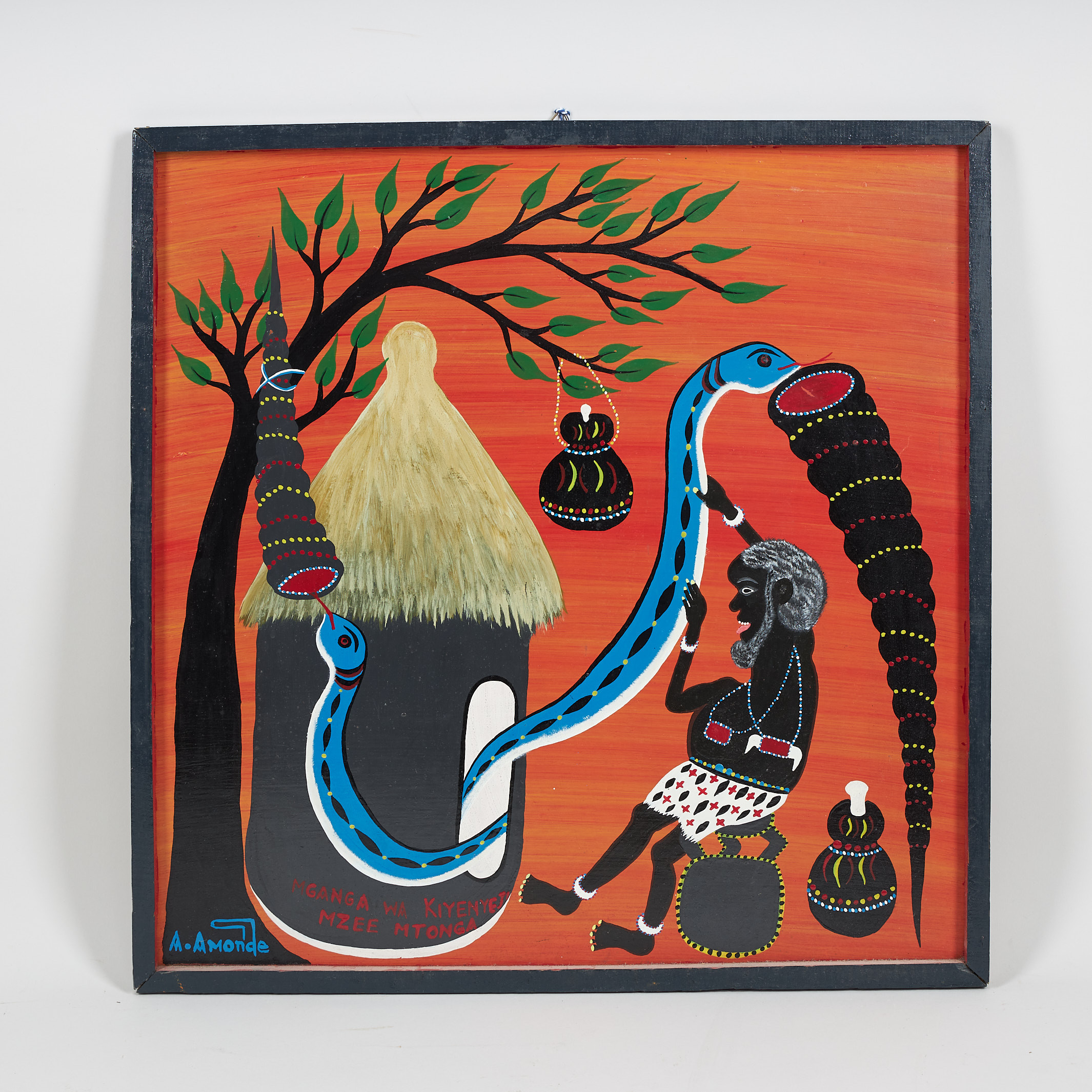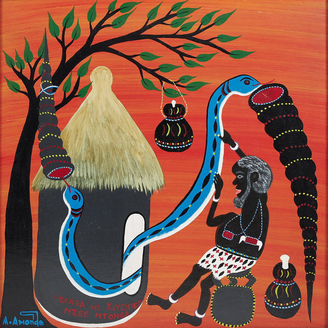 2679529. OMARI ALOIS AMONDE. Tingatinga painting, the man and the snake, signed, cycle varnish on masonite.