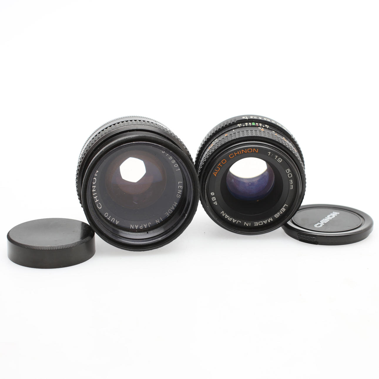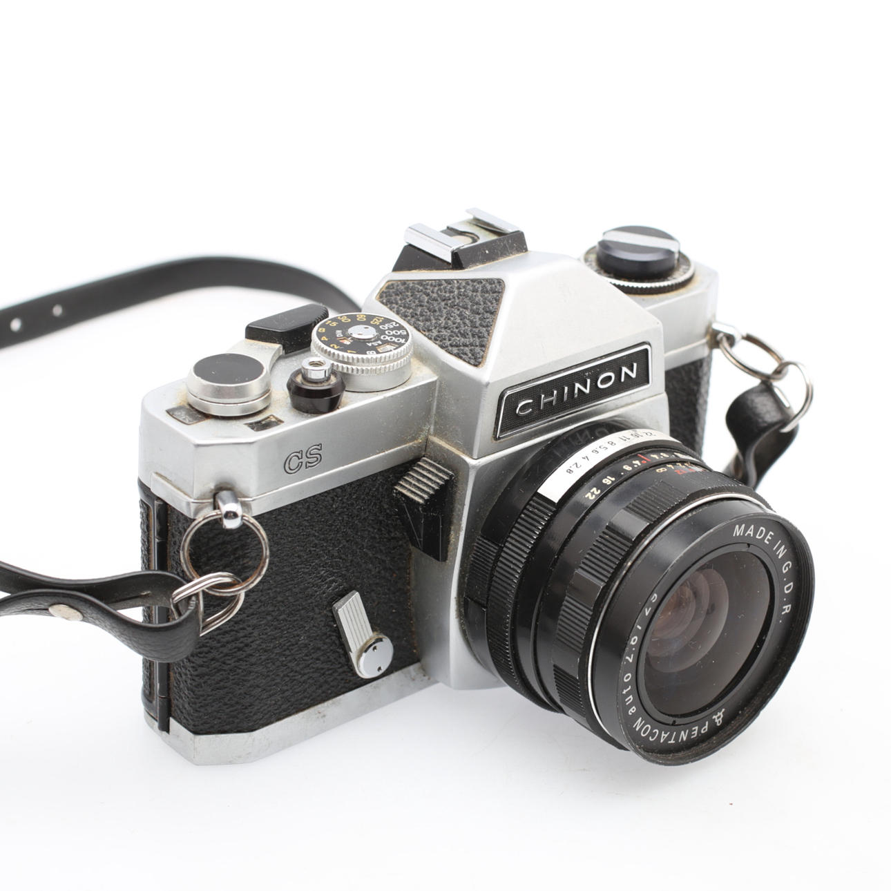 1 camera body Chinon CS 1 lens Pentacon auto 2.8/29 1 lens Chinon 1:1.7 f=55mm 1 lens Chinon 1:1.9 50 mm.
