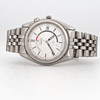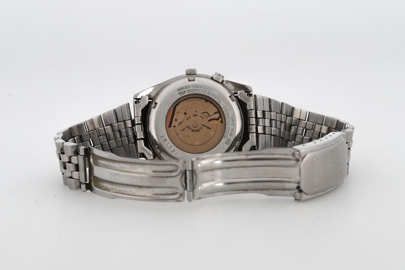 Steel, kinetic (rotor charge generator, quartz-controlled stepper motor), hardlex glass, date, integrated original link in steel, folding clasp, caliber 5M42A, reference no. 5M42-0A30, case no. 671121, inner dimensions of the link approx. 17 cm, case diameter 36 mm.