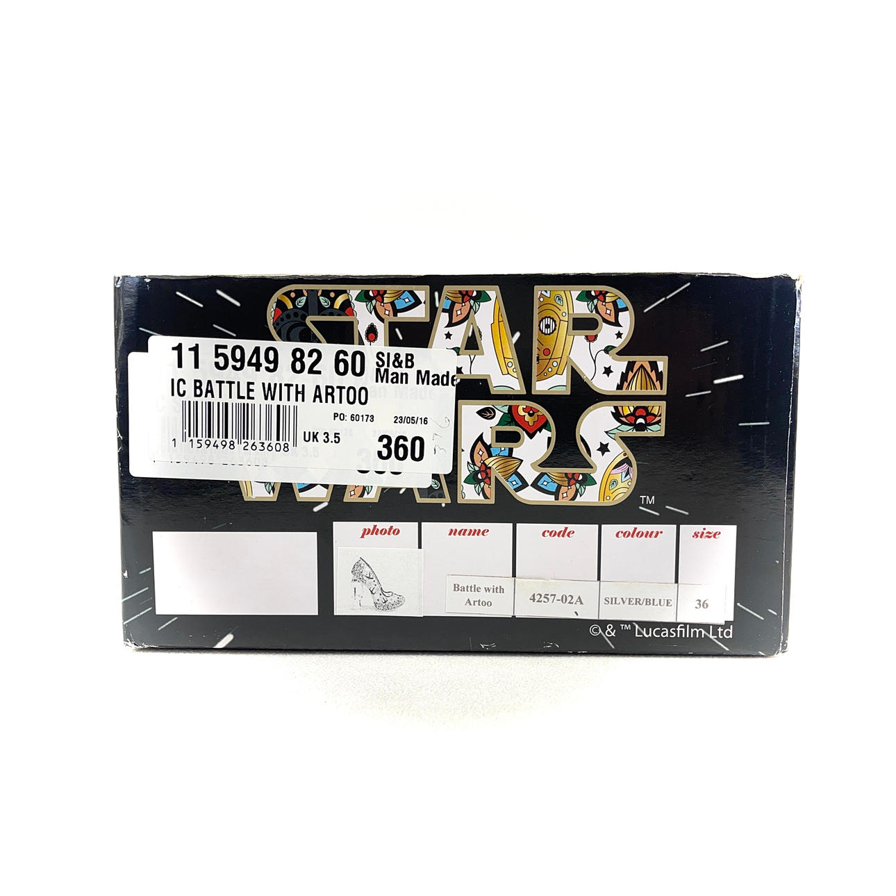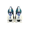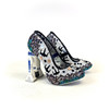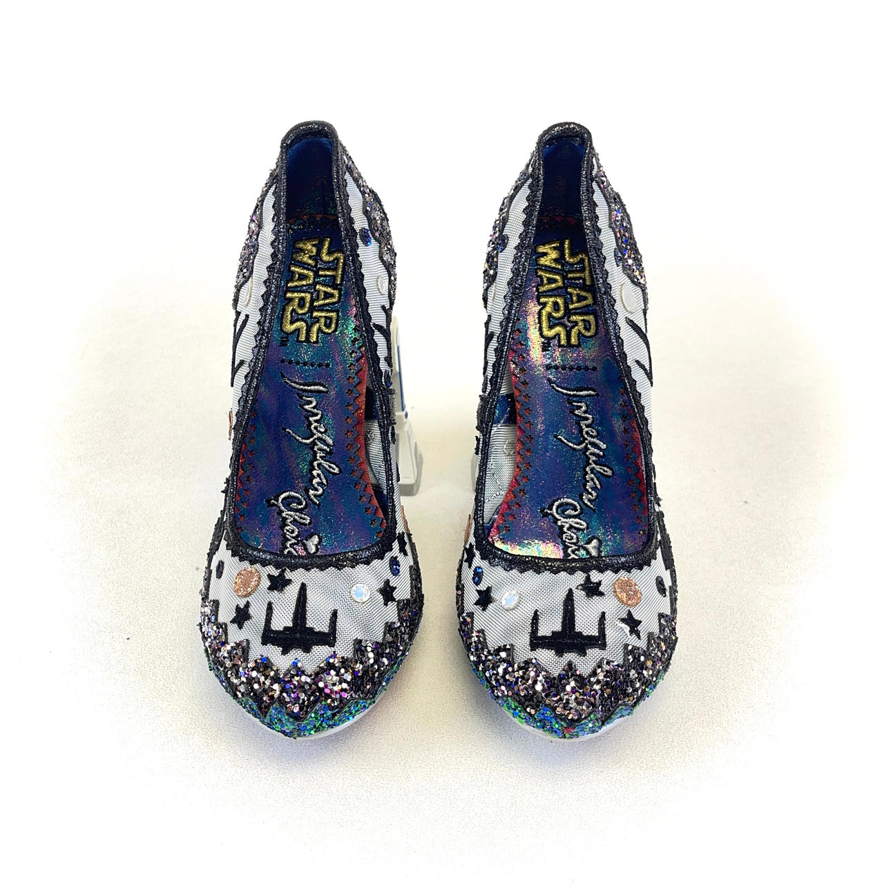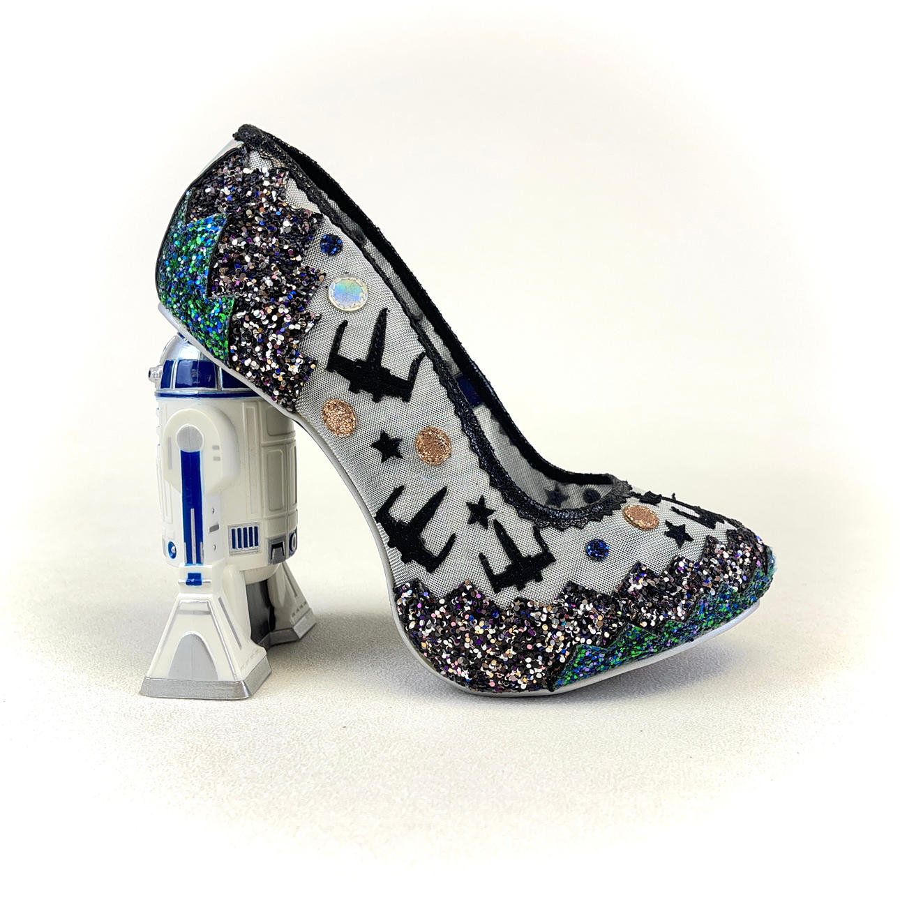 A pair of Schuh Irregular Choice x Star Wars 'battle with Artoo' multicolour glitter high-heel shoes decorated with sequins and X-WING embroidery with R2-D2 as the heal.