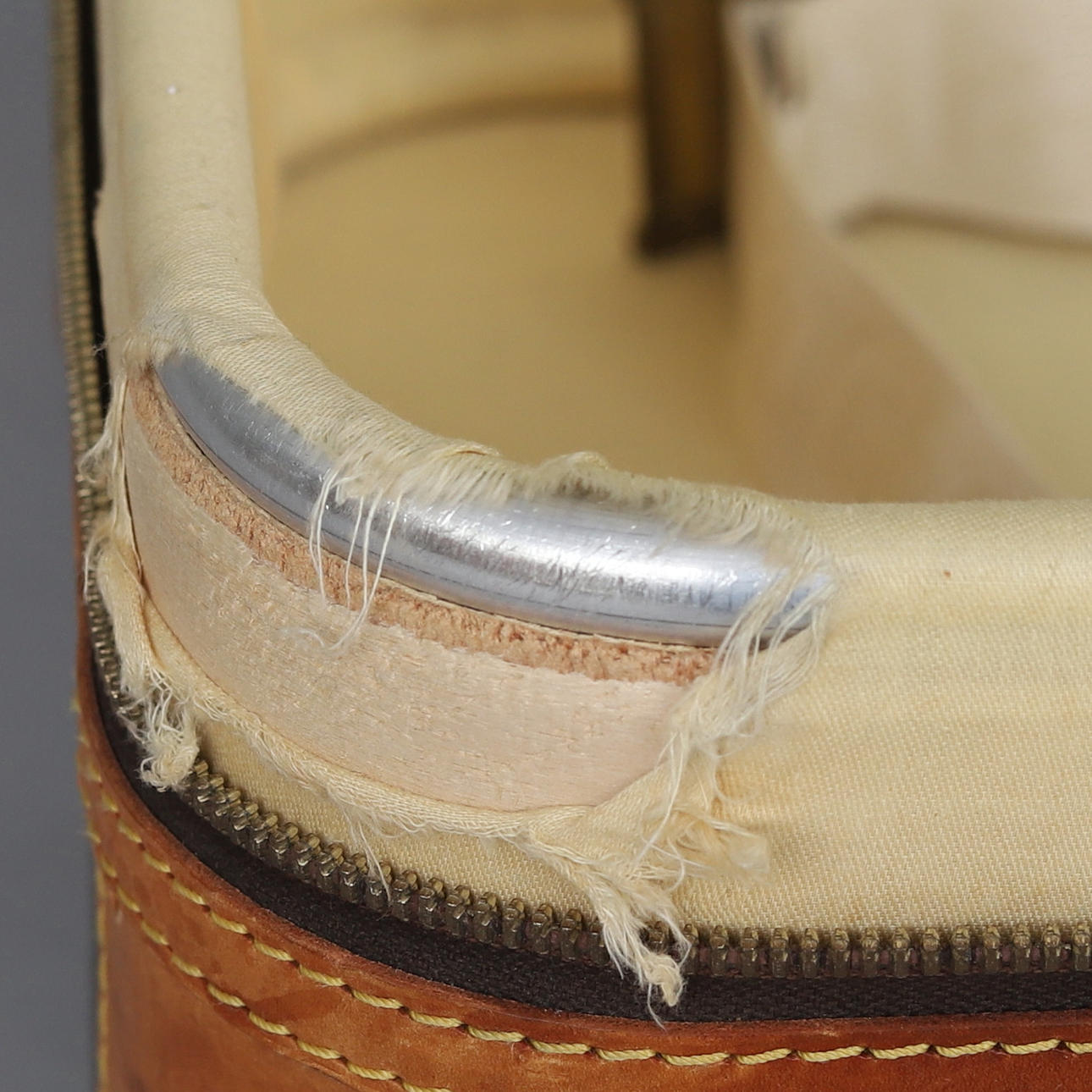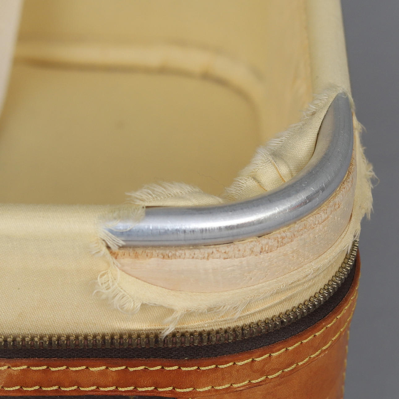 The bag is reinforced with a cowhide leather lining including piping, corner plates and front, side and top straps.