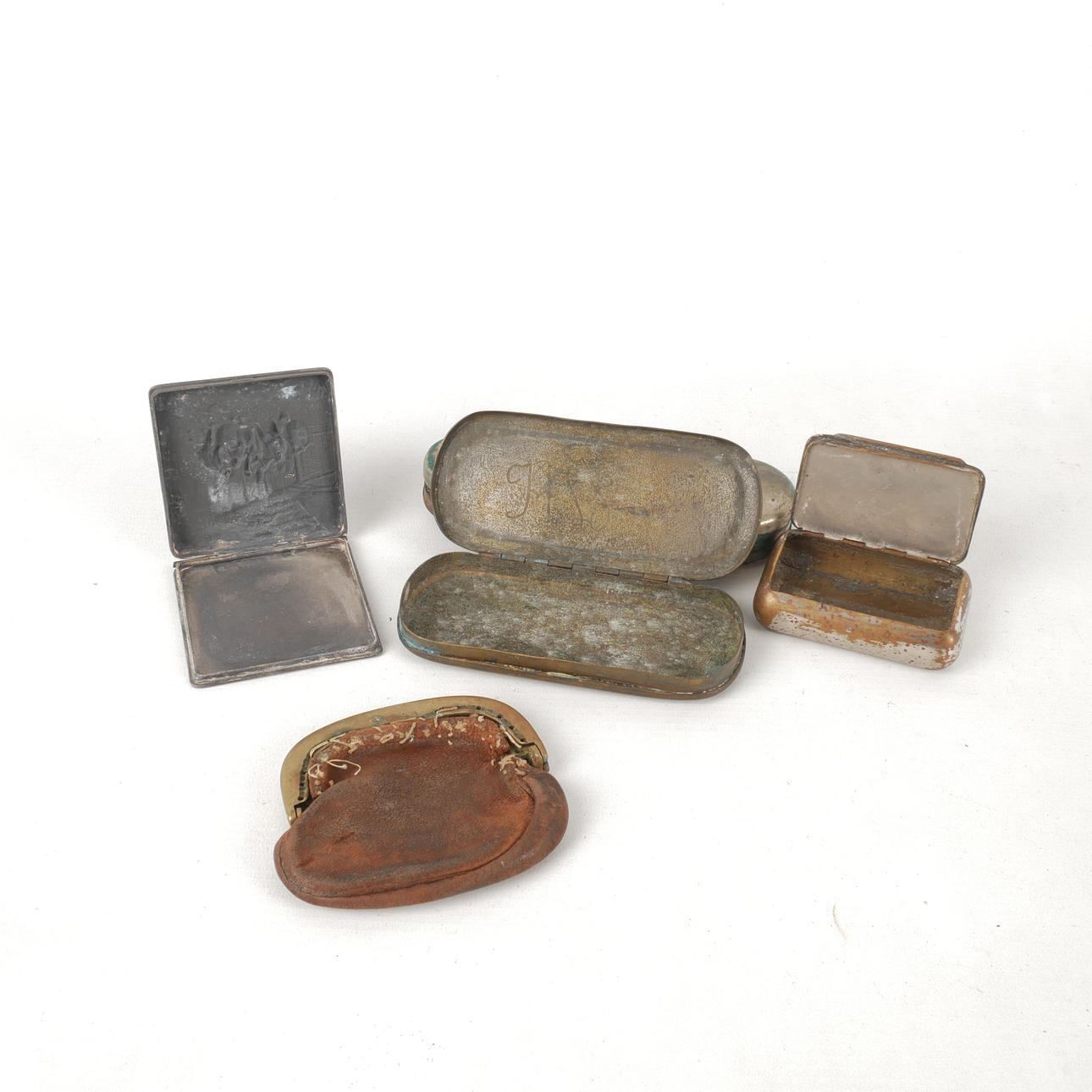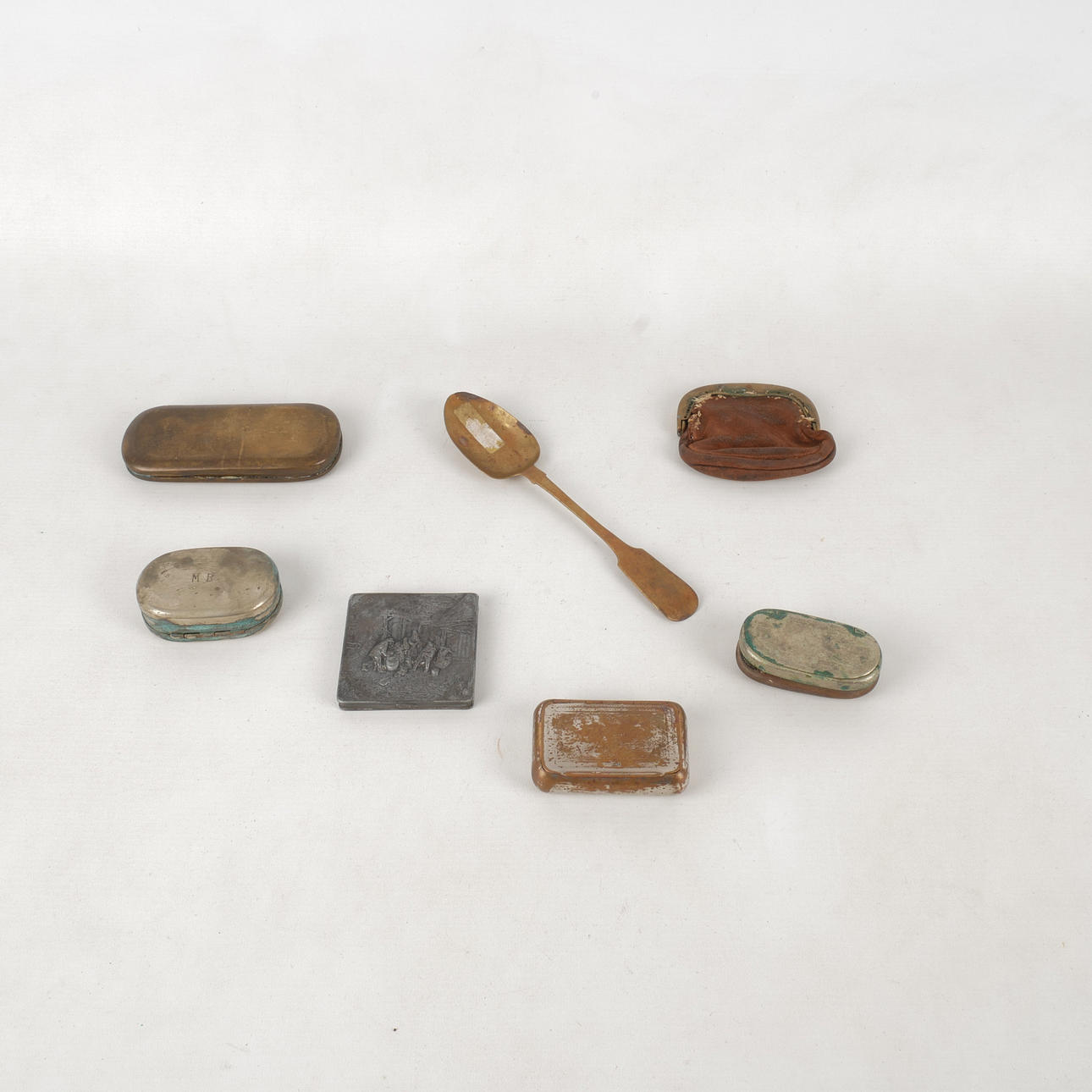Brass calendar box, snuff boxes, etc. with relief decor.