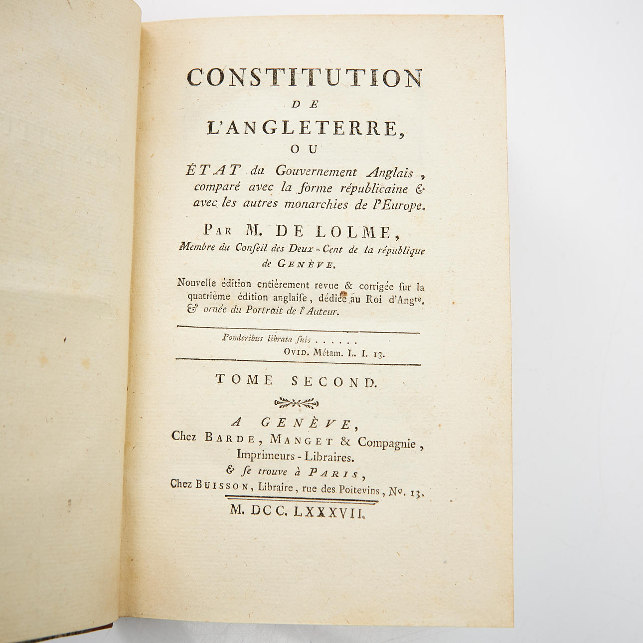 Constitution de l'Angleterre ou etat du gouvernement anglais, compare avec la forme republicaine et avec les autres monarchies de l'Europe. Nouvelle édition entiere revue & corrigée sur la quatrième édition anglaise, dedicated au roi d'Angre & ornée du portrait de l'auteur. I-II. A Genève, chez Barde, Manget & Compagnie [...] & se trouve à Paris, chez Buisson, 1787.
