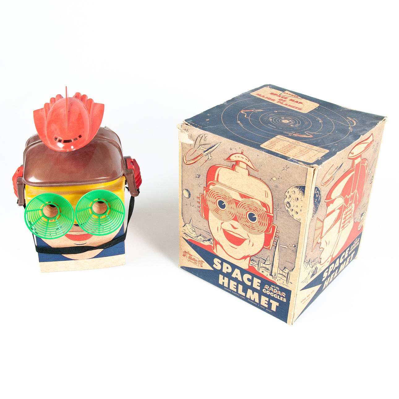 A very unusual toy Banner plastic space helmet. with Original box, Banner plastic space helmet in original box. Box is complete but does have some tearing and creasing. Helmet looks unused near mint condition on cardboard head piece insert. Also includes radar goggles. Condition: Box: (Very Good). Helmet: (Near Mint). Dimensions: Box: 8 - 1/4" x 8 - 1/2" x 9 - 1/2".