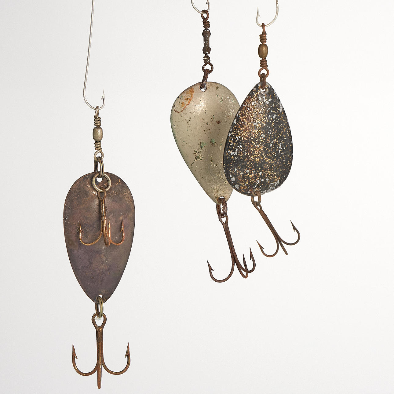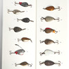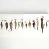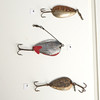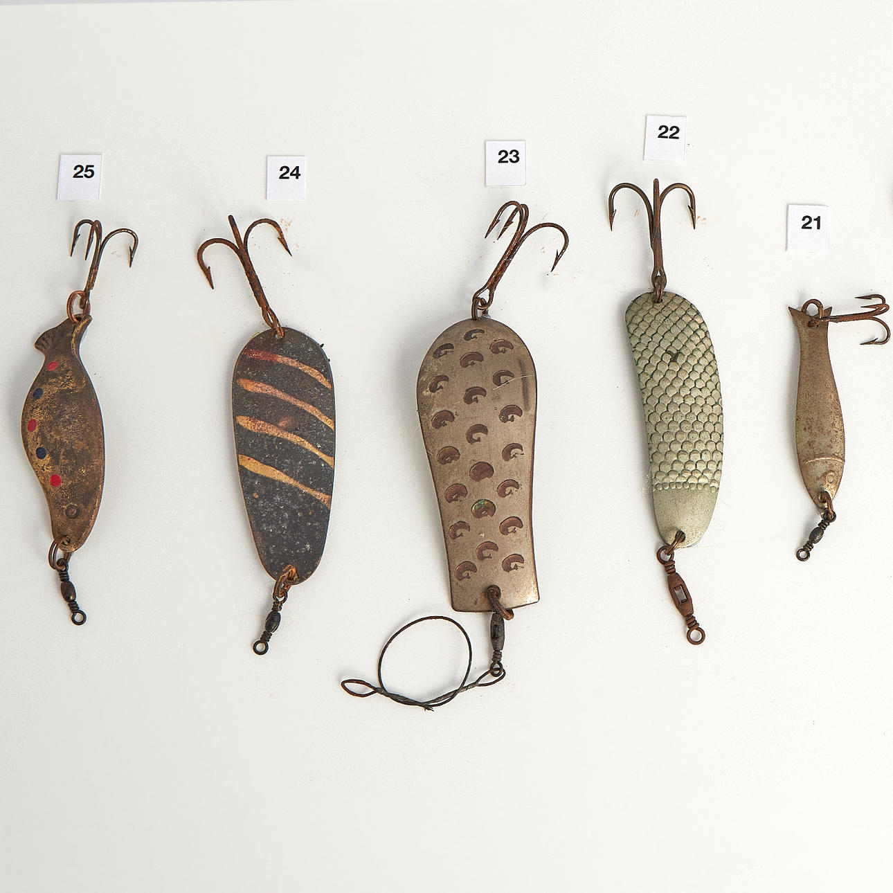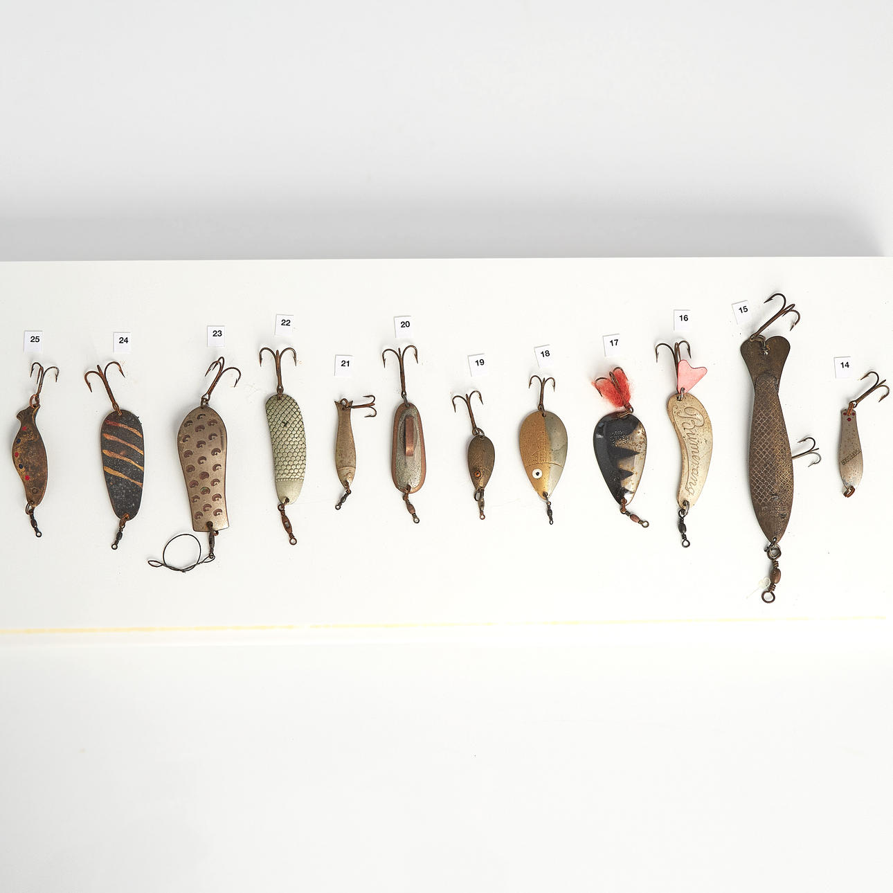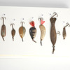 1. Kaleva, painted (cFn) 2. Stump (LADIES) 3. Kaleva type, black, fluorescent 4. Kaleva type, black, fluorescent with mica, rear mounted 5. Feather Spoon (English) 6. Kaleva type (Bastmans) 7. Kaleva type (PB) 8. Stump (Ak) 9. Kaleva type, fluorescent 10. Kaleva 11. Kaleva type (HJAB) 12. Stump (Finnish) 13. Stump, backwards mounted (Ak) 14. Professor (Finnish) 15. Silverfish, heavy, easily cast, for flowing water (Lff) 16. Boomerang (BHR) 17. Stump (Alkub, Finland) 18. Plankton, favorite type, minted 19. Drag, small, light for rowing 20. Keelex (E. Barkman, Lidingö 1943) 21. Draw 22. Blank draw (Ge-K, Edsbyn) 23. Blanks, patterned 24. Mörtblänk (ABU) 25. Flelljo (Whalsluk) cFn – Carl Leidesdorff DAM – Deutche Angelgeräte Manufaktur, Berlin PB – Pebeco, Paul Berghaus & Co, Gothenburg Ak – H. Allcock, Reddich, England HJAB – Halmstad Järnvarubolag, Halmstad Lff – AB Leidesdorffska Fiskeredskapsbutiken, Gothenburg - closed BHR – Bröderna Holm, Ransta ABU – AB Urfabriken, Svängsta