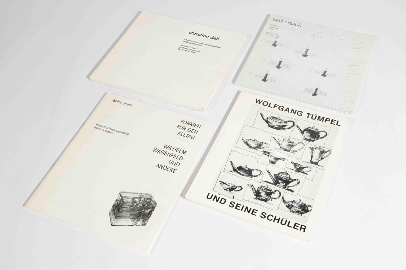 "Mies van der Rohe" - Philip C Johnson. "Lilly Reich" - Sonja Gunther. "Contemporary and time-resistant, industrial forms by Wilhelm Wagenfeld" - Carlo Burschel. "The Cantilever Chair" - Jean Prouve Archive. "Gustav Hasenpflug" Christian Grohn. "Wolfgang Tümpel" - Museum Huelsmann Bielefeld."Vernissage, magazine for the Wilhelm Wagenfeld exhibition" - Bremen. "Burg Giebichenstein" - exhibition catalog Halle and Karlsruhe 1993. "Ludwig Mies van der Rohe" - Daniel Hammer Tugendhat and Wolf Tegethoff. "Lilly Reich" - Museum of Modern Art. "Christian Dell, silversmith and lamp designer" - Beate Alice Hofmann. "Bodo Rasch" exhibition catalog Architekturgalerie am Weißenhof. "Forms for everyday life, Wilhelm Wagenfeld and others" - Geiersbach and Scheiffele."Wolfgang Tümpel and his students". "Heinrich Loffelhardt" - Carlo Burschel. "75 years Giebichenstein Castle". "Jindrich Halabala". "Ferdinand Kramer" - Anabas Verlag. "The Sculptor Gustav Weidanz" - State Gallery Moritzburg Halle. "Rasch Brothers" - Edition Marzona. "Departure for a new way of living" Hans Wichmann.
