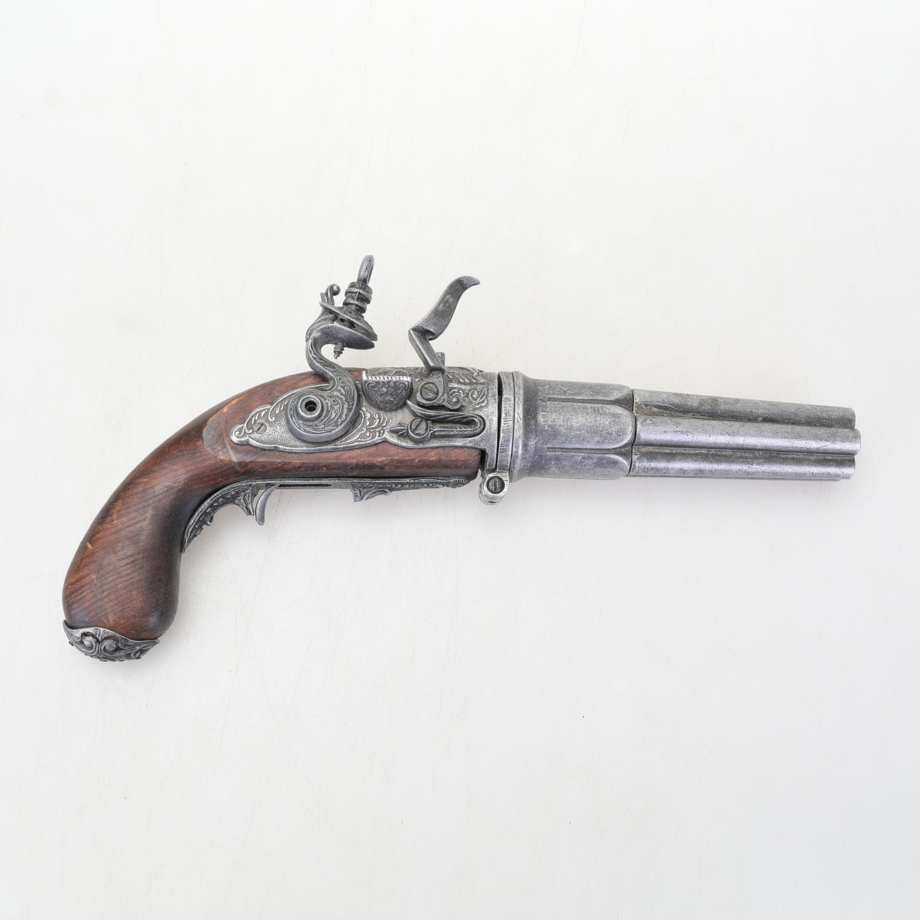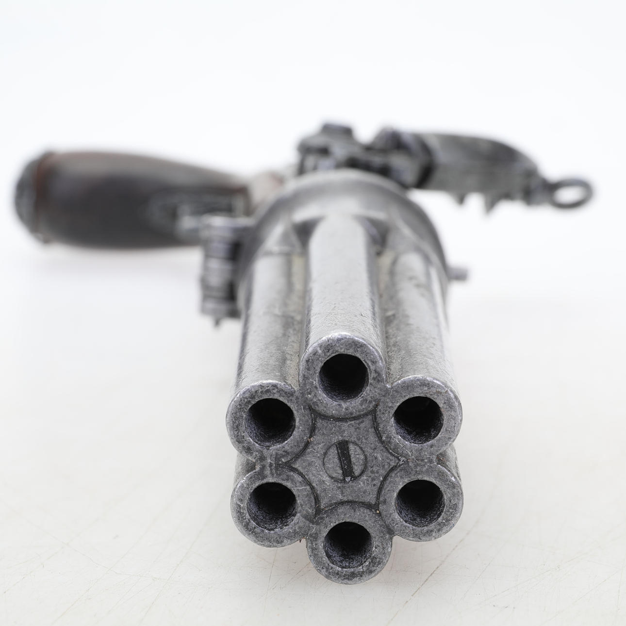A replica of a flintlock pistol with six barrels a so-called "Pepperbox". Length approx. 35 cm, height approx. 18 cm.