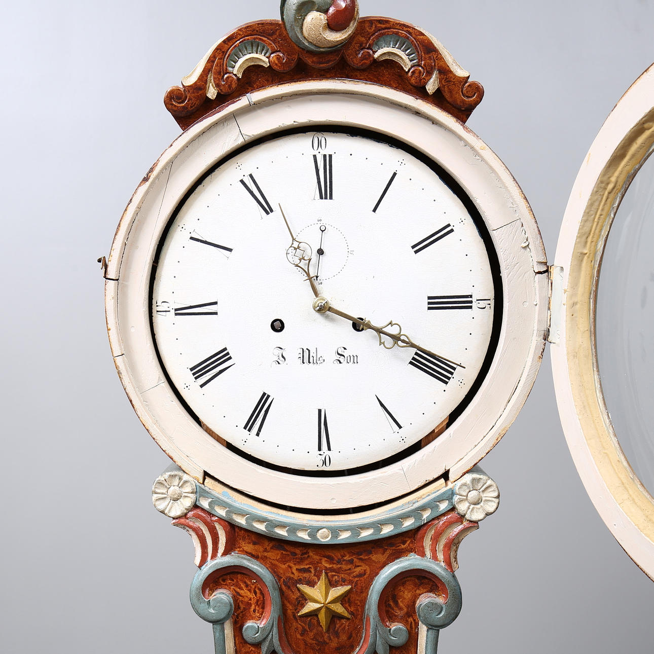 White painted dial with Roman numerals and hour-minute hands and separate seconds hand, marked S. Nils. Son.