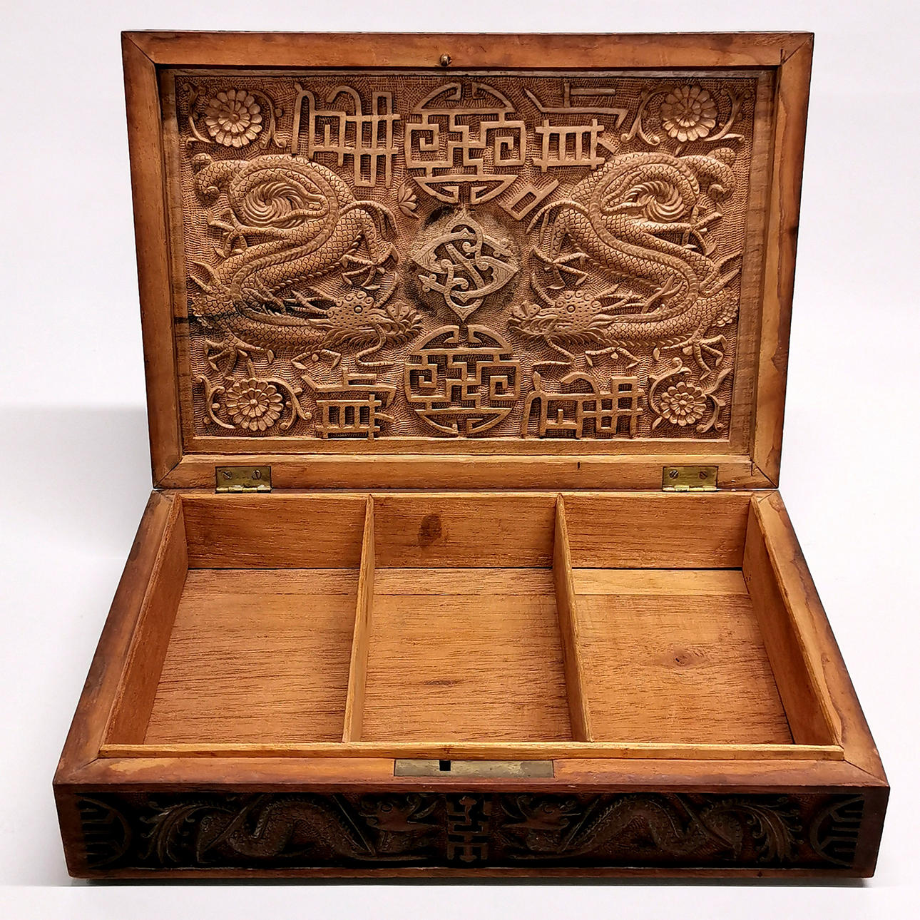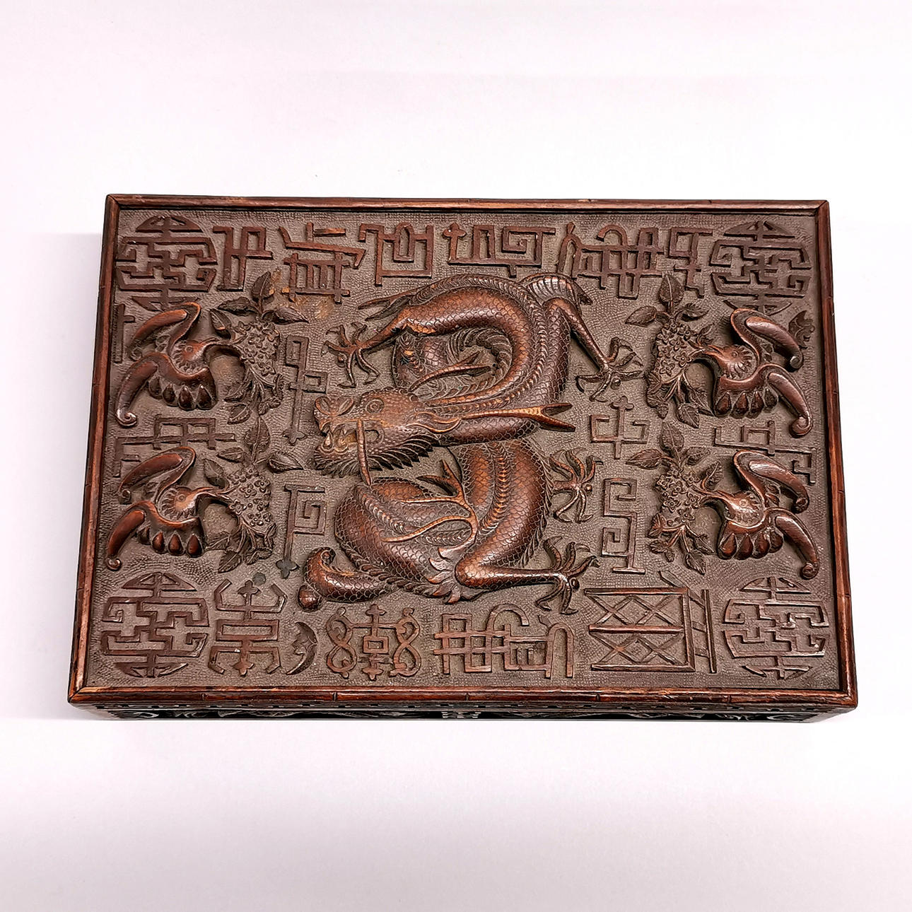 A 19th century Chinese carved wooden box, decorated with a dragon and birds carrying spring blossom, 31 x 21 x 7cm.