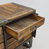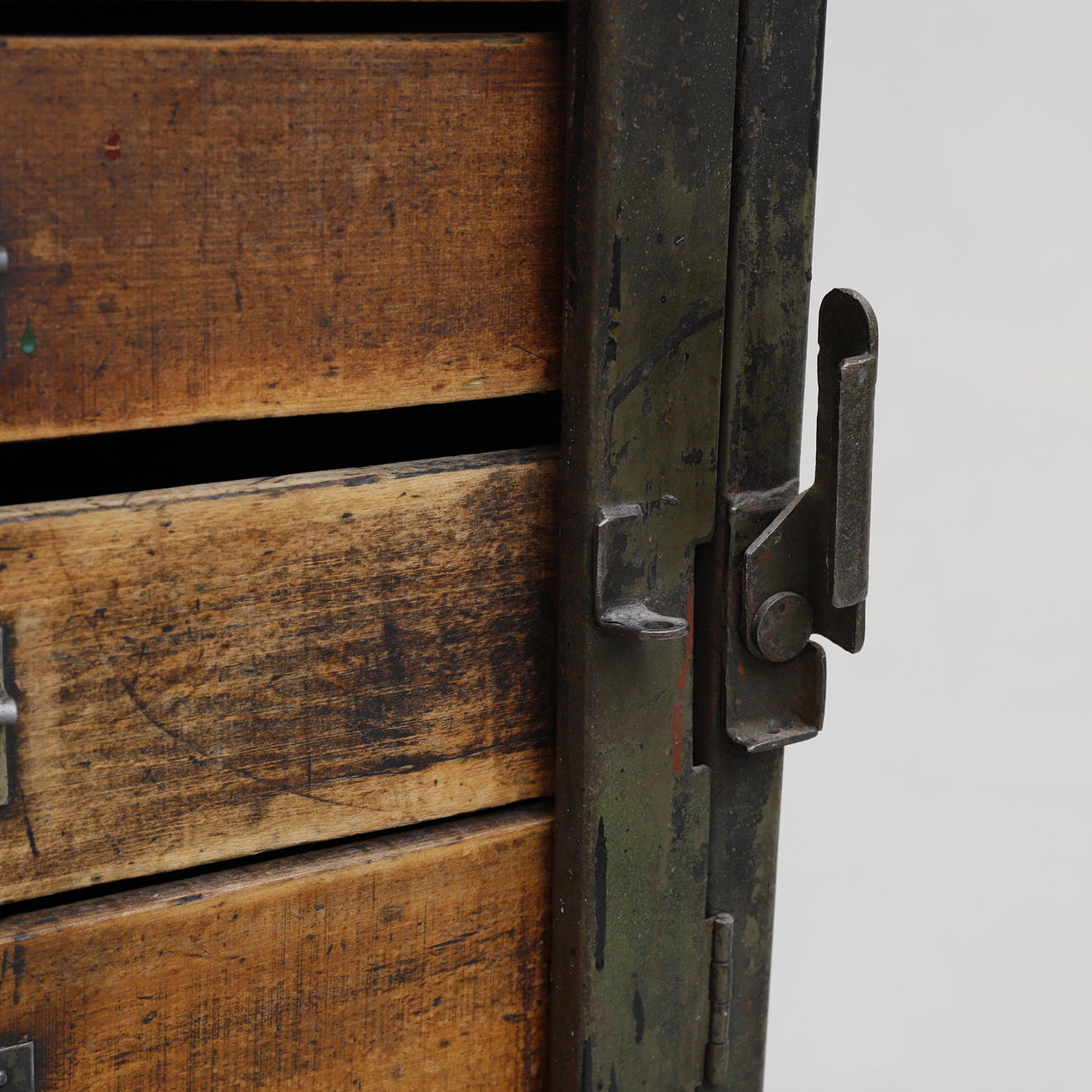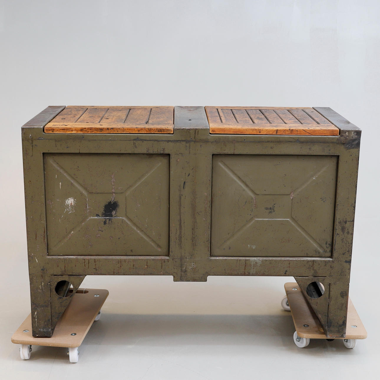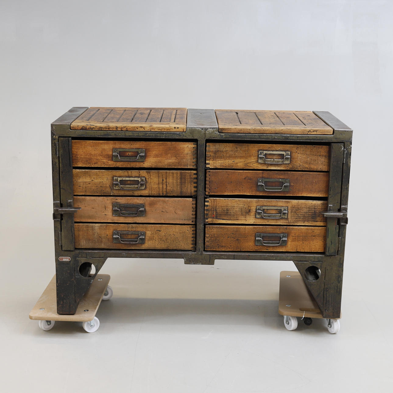 Steel frame. Covered with wood. Two vertical rows of four boxes/cases each. Lockable from the sides with space for a padlock. Length approx. 127 cm. Width approx. 59 cm. Height approx. 87 cm.