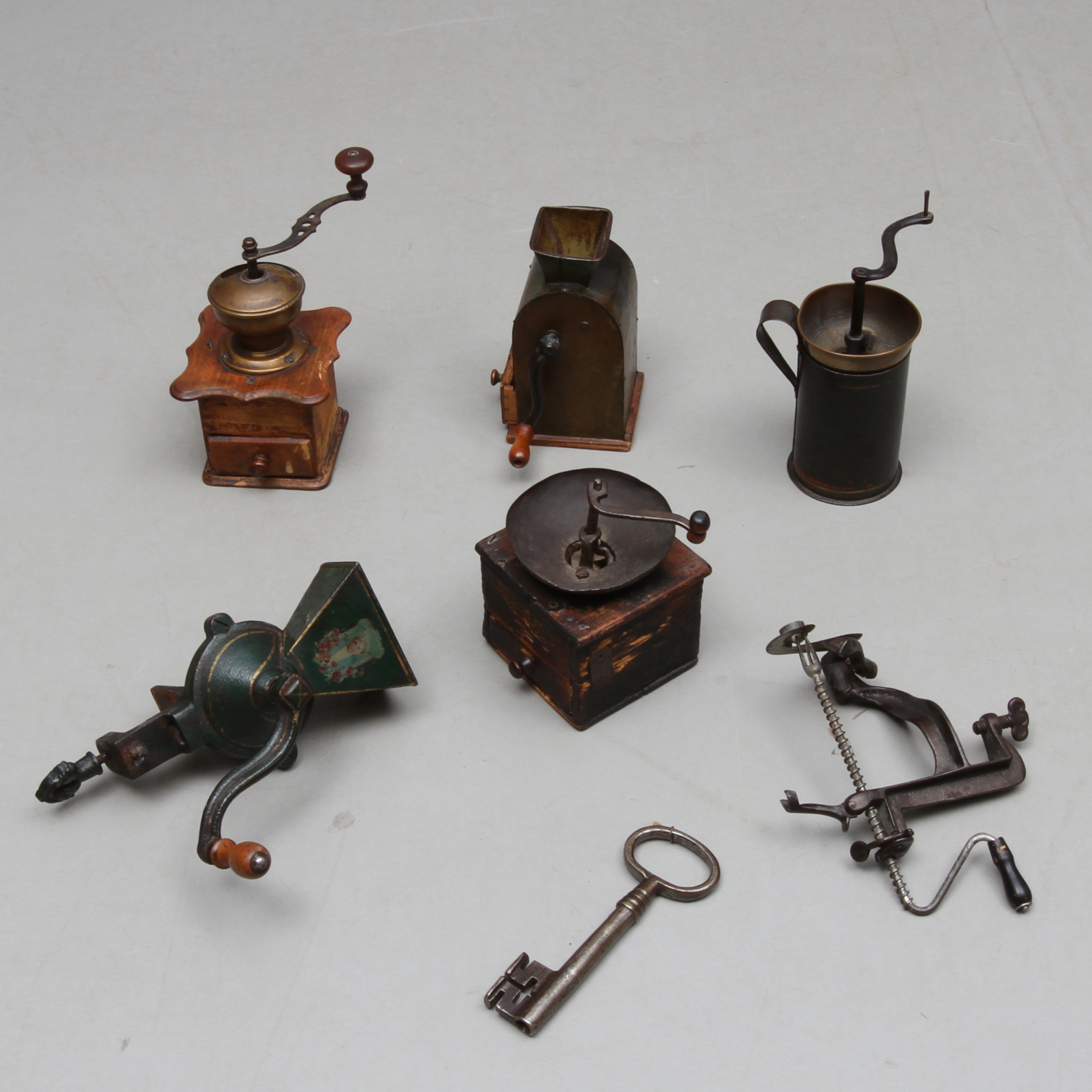 270704. COFFEE GRINDER, 5 pcs, APPLE SHELL, KEY, 18 & 1900s.