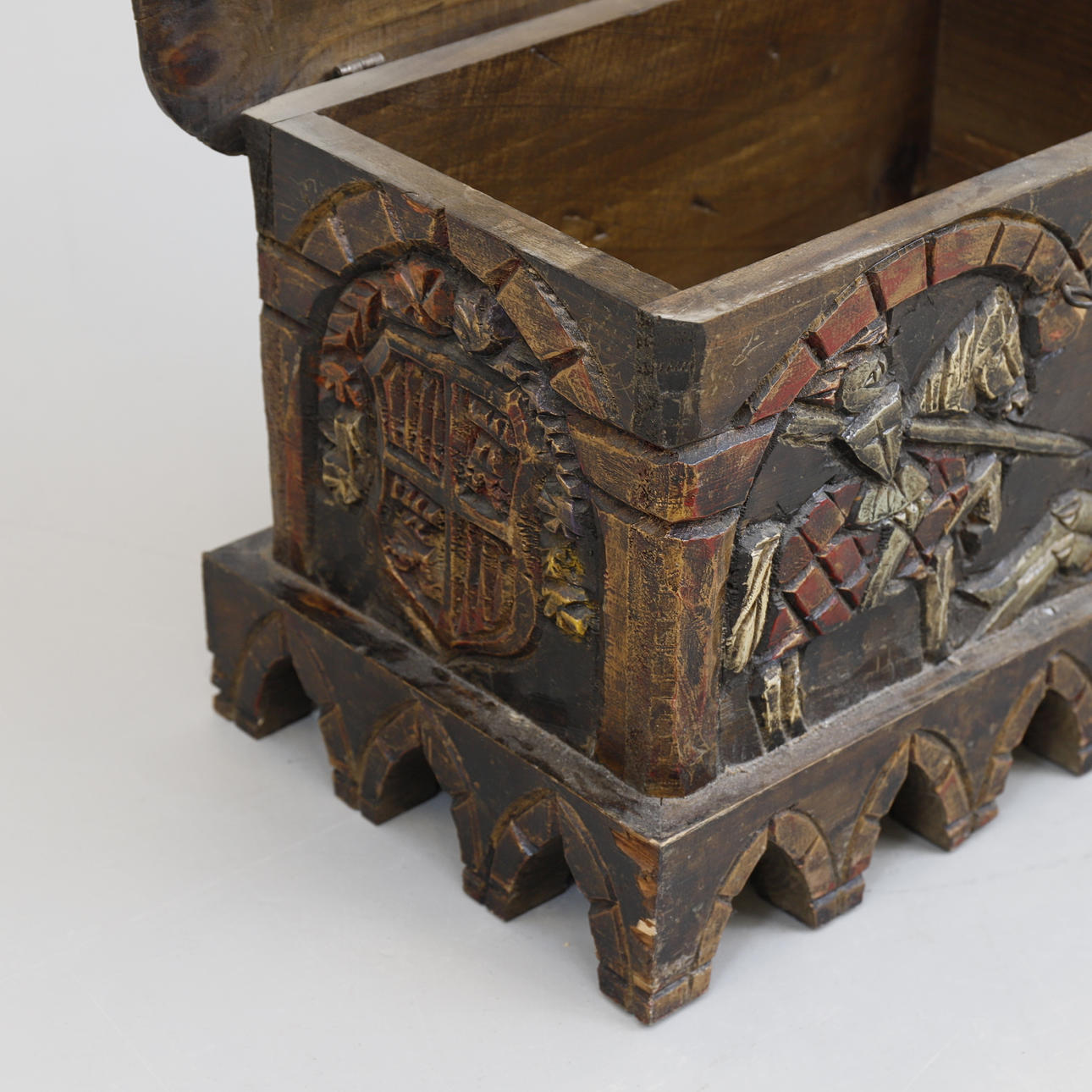 Carved decoration of i.a. knight and coat of arms. Length approx. 45 cm. Width approx. 30 cm. Height approx. 32 cm.