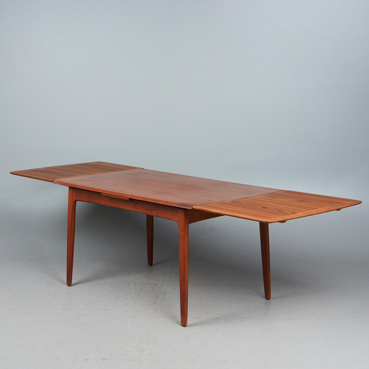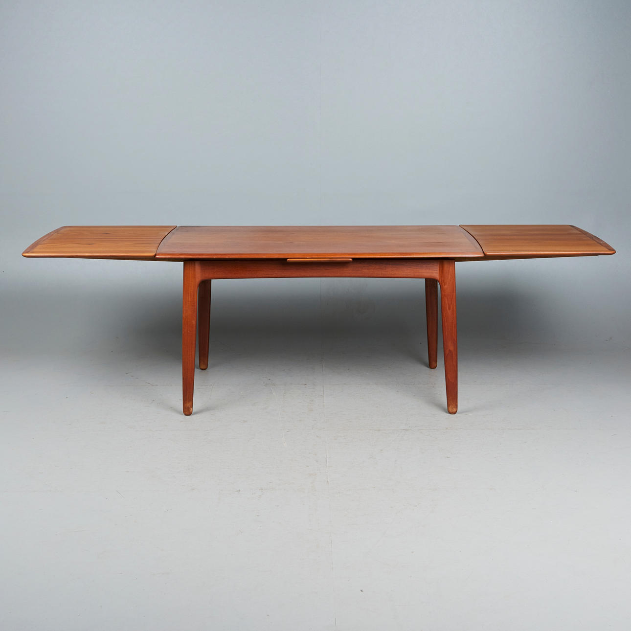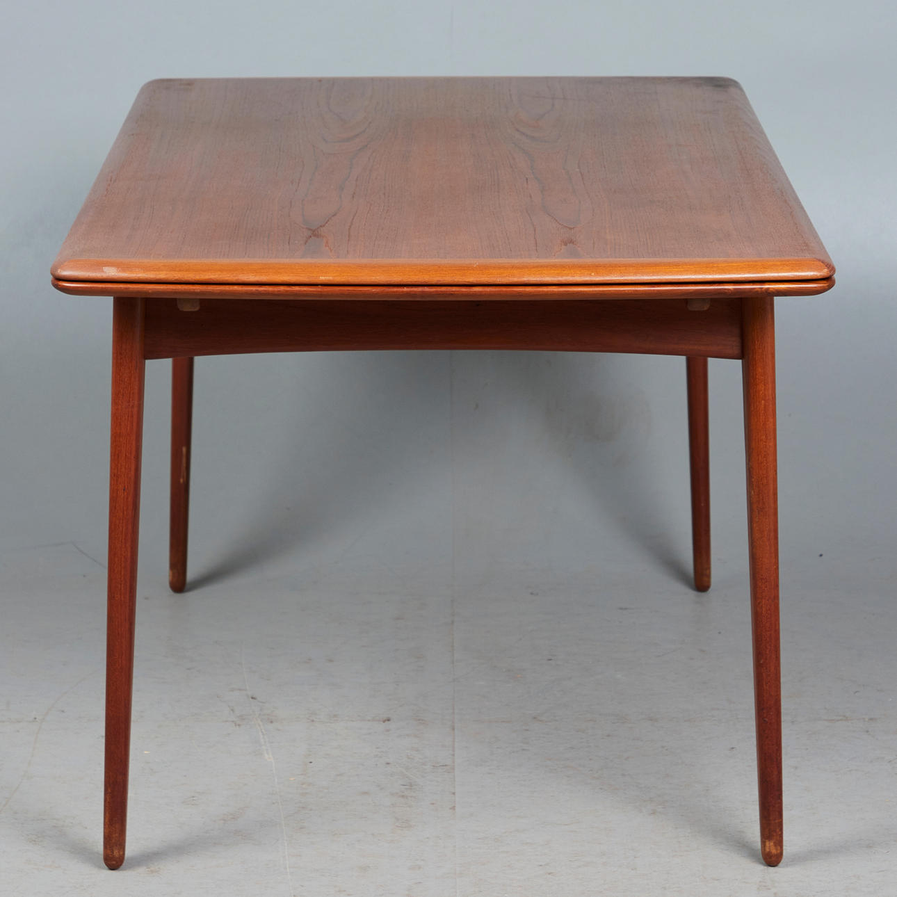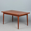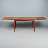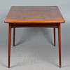 Svend Åge Madsen, Dining room table / table, teak, 1960s, Denmark. Structure made of glazed teak with four conical legs and a rectangular, extendable tabletop in flat-iron cut with rounded corners, equipped with two pull-out extension leaves on the underside, H.71cm, L.142-256cm, W.85cm. .