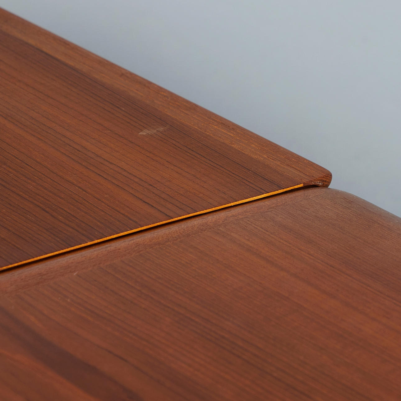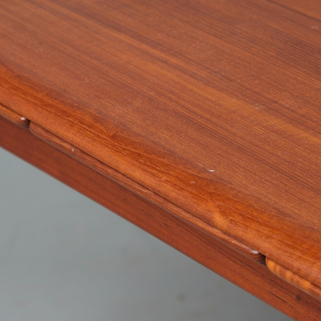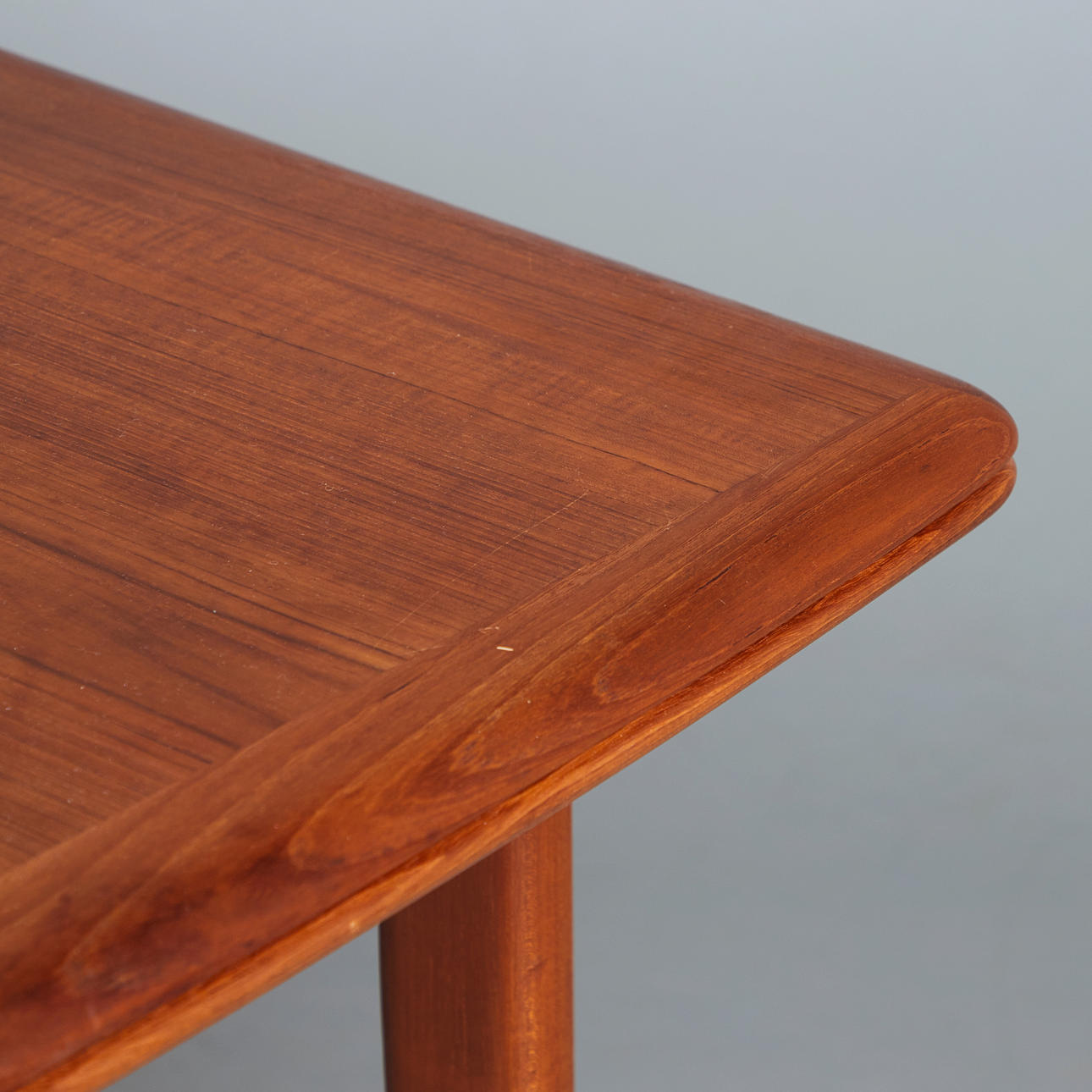 Svend Åge Madsen, Dining room table / table, teak, 1960s, Denmark. Structure made of glazed teak with four conical legs and a rectangular, extendable tabletop in flat-iron cut with rounded corners, equipped with two pull-out extension leaves on the underside, H.71cm, L.142-256cm, W.85cm. .
