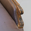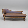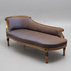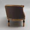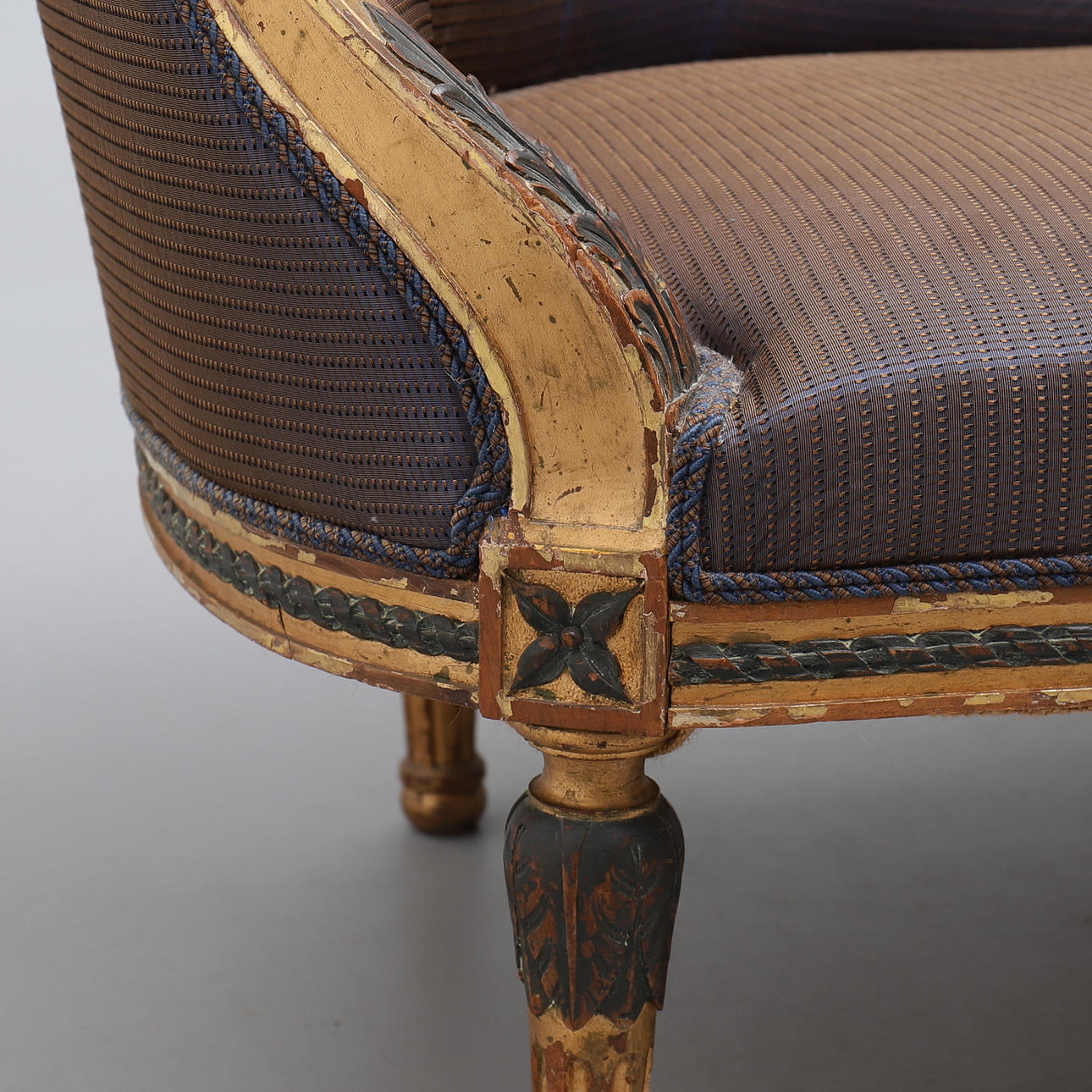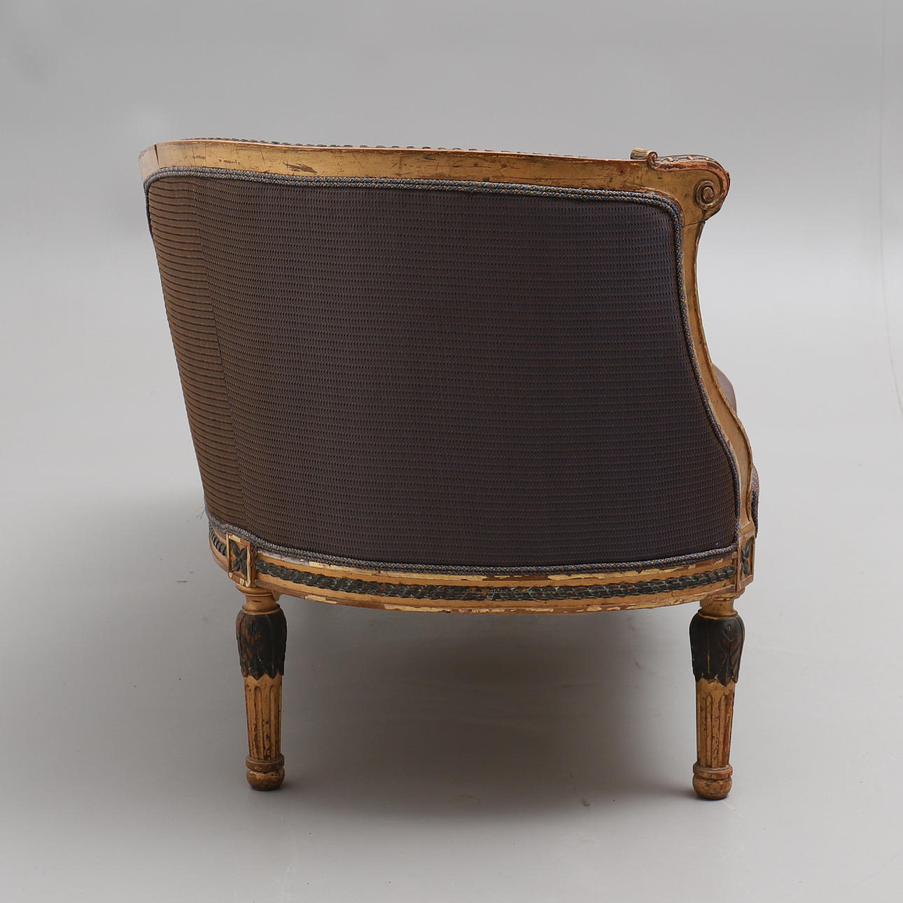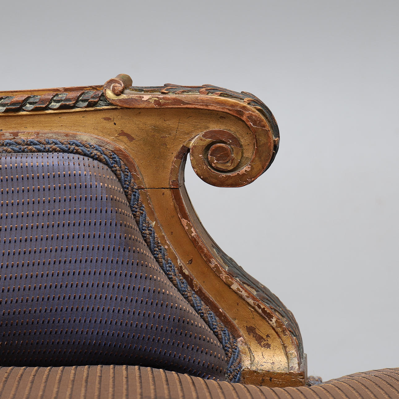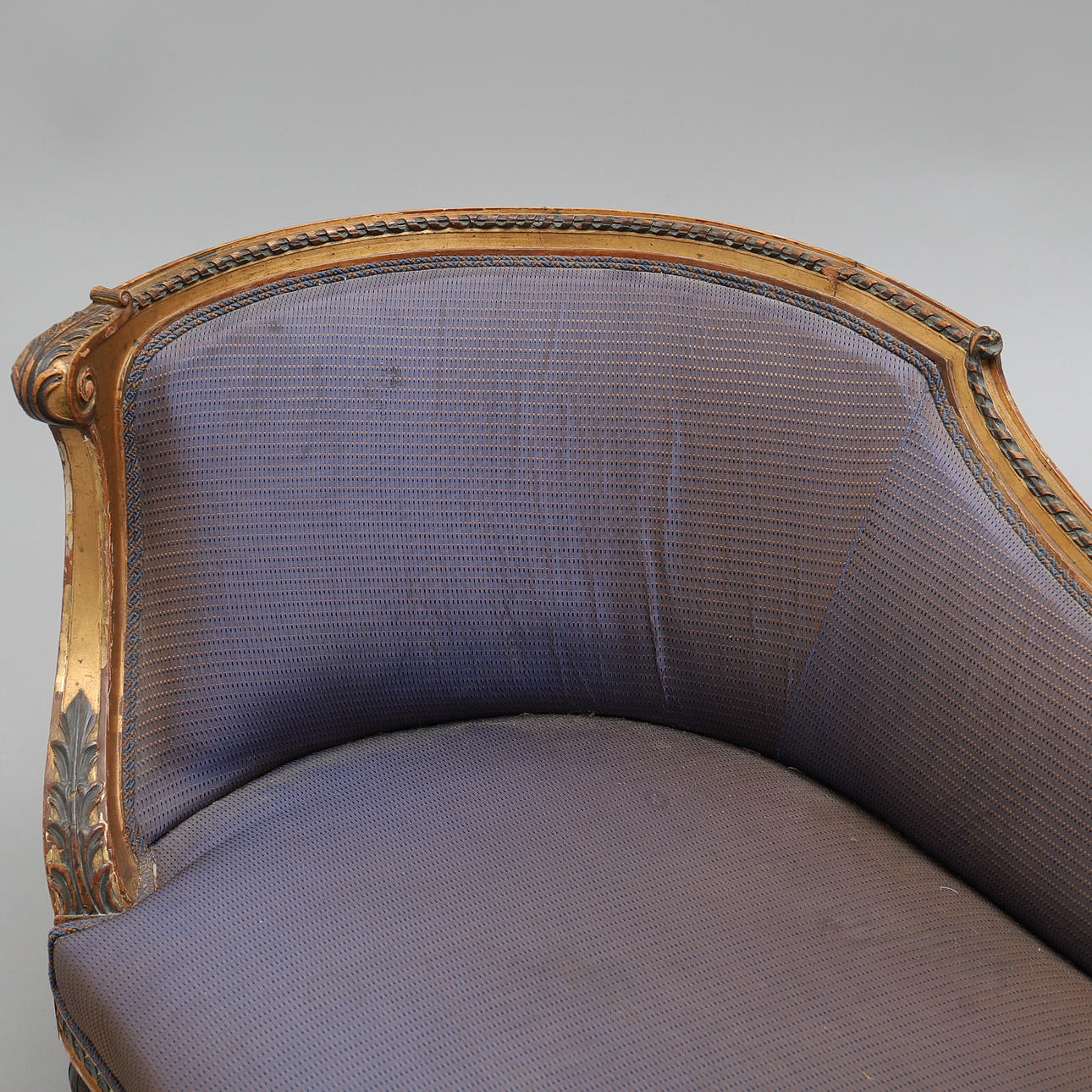 Fixed upholstered seat and back, cut gilt and painted decor, height 68, length approx. 170 cm.