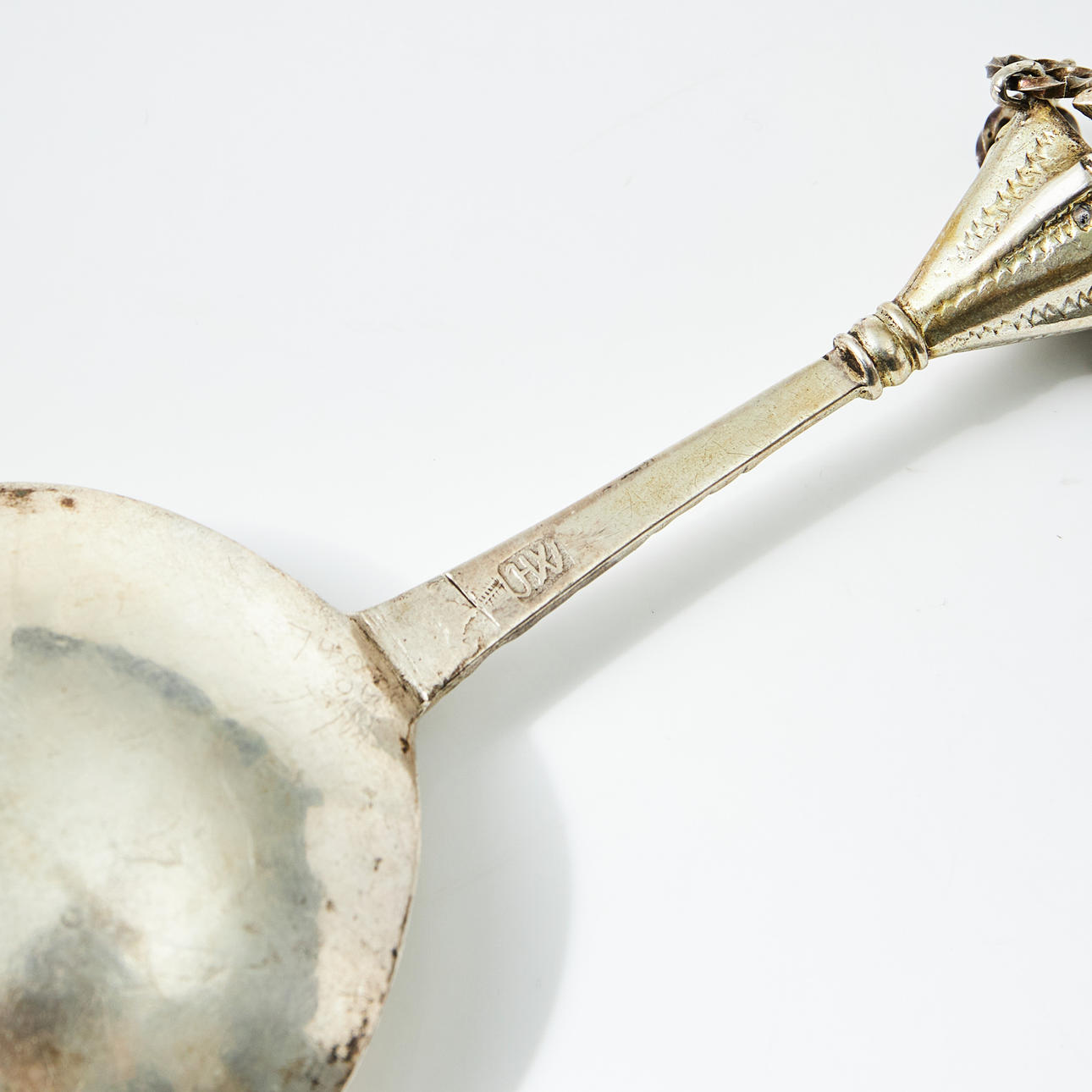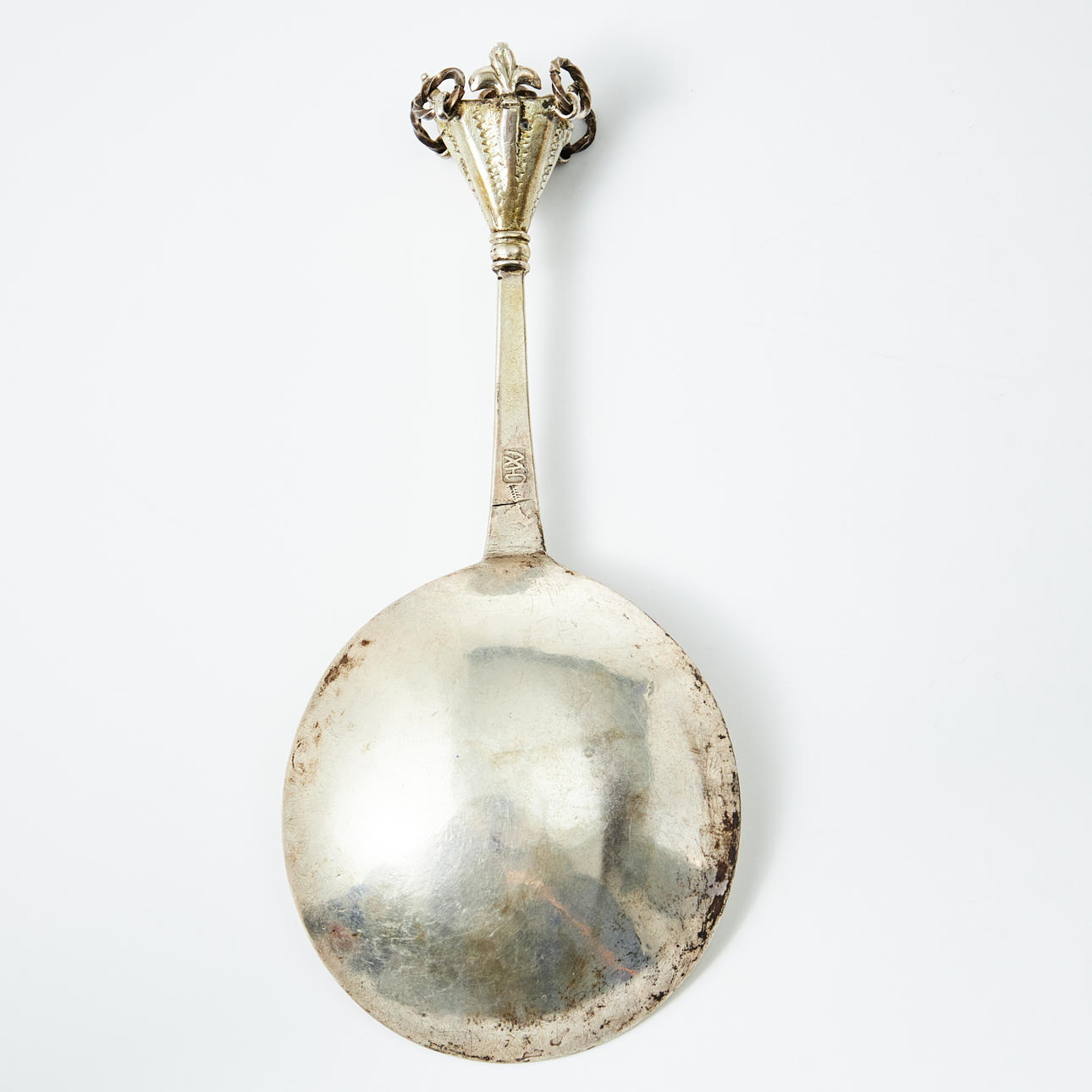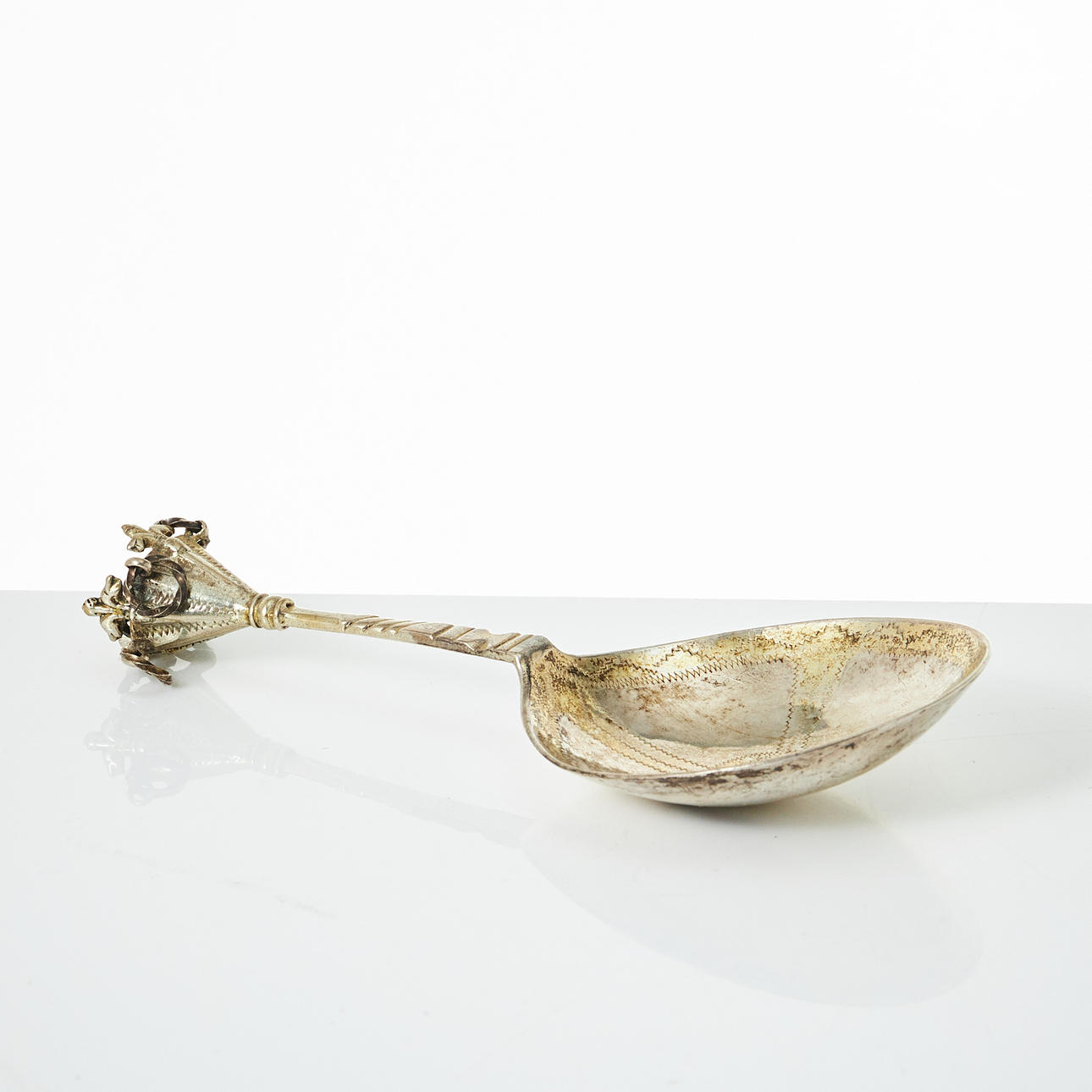 Partly gilt, crown knob with ringing, flat shaft with oblique grooves, in the blade swissled cross formation. Length 13.5 cm, weight 33 grams.