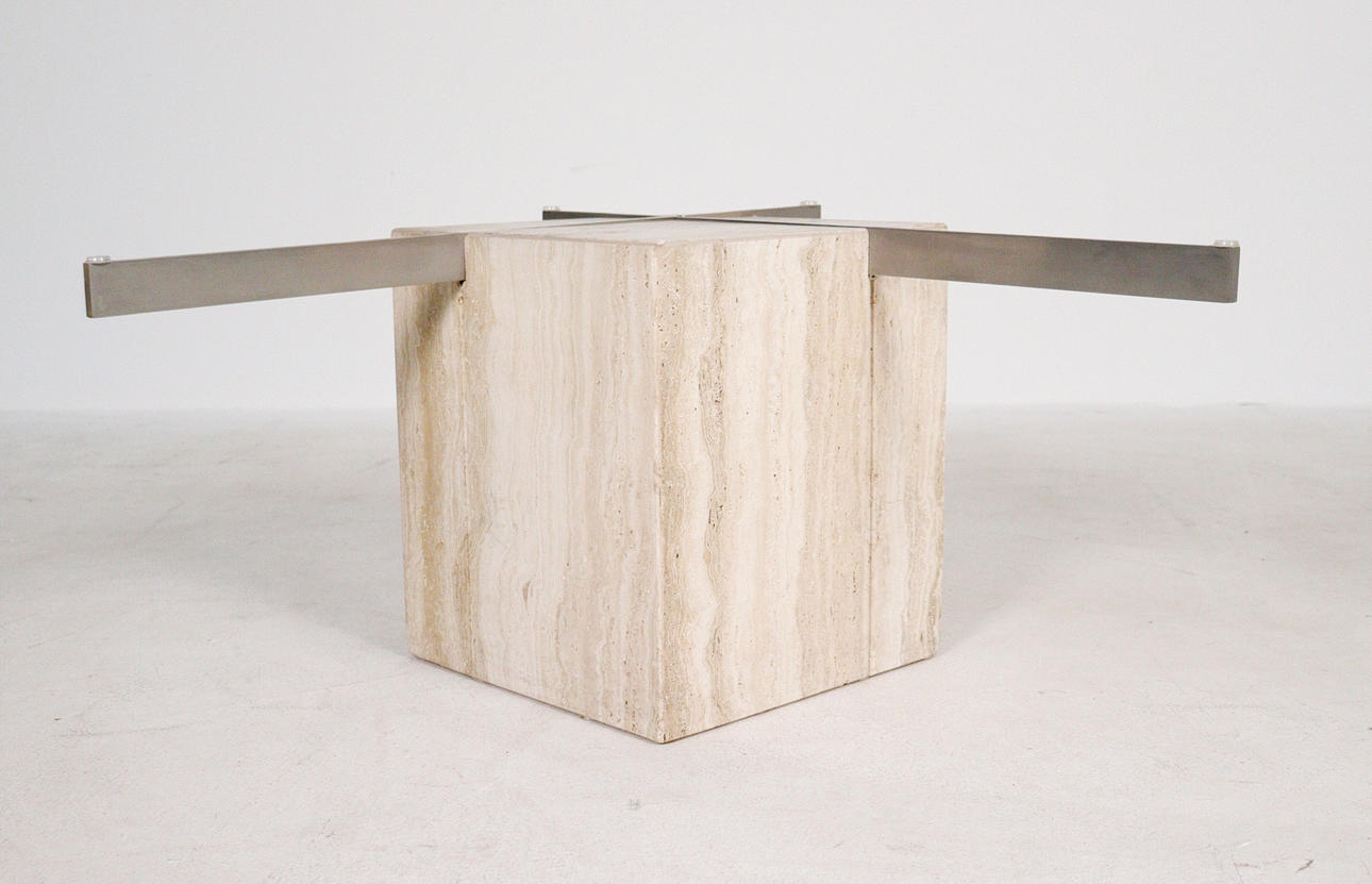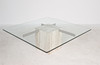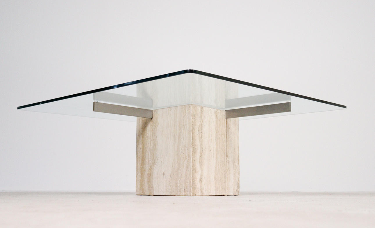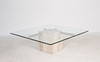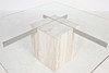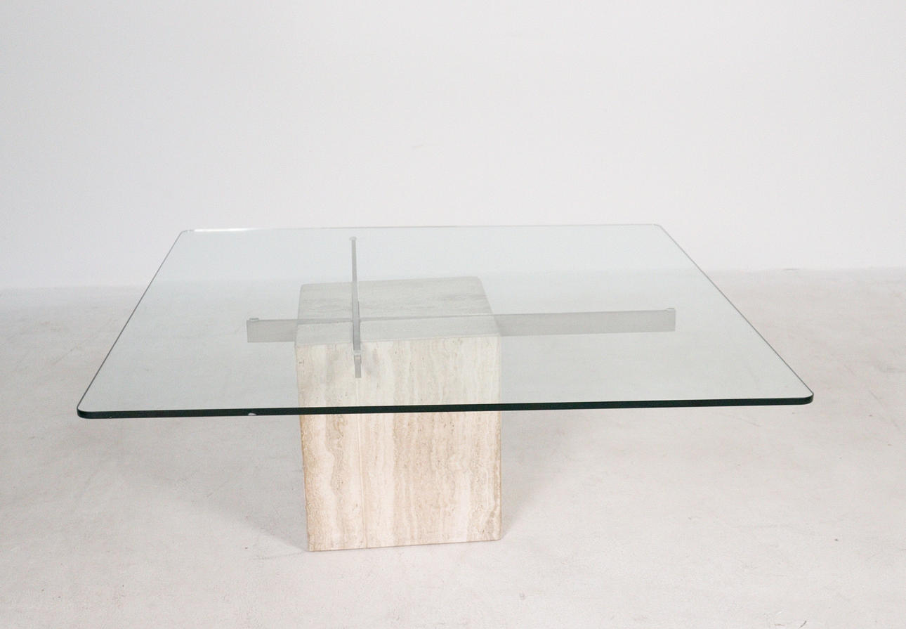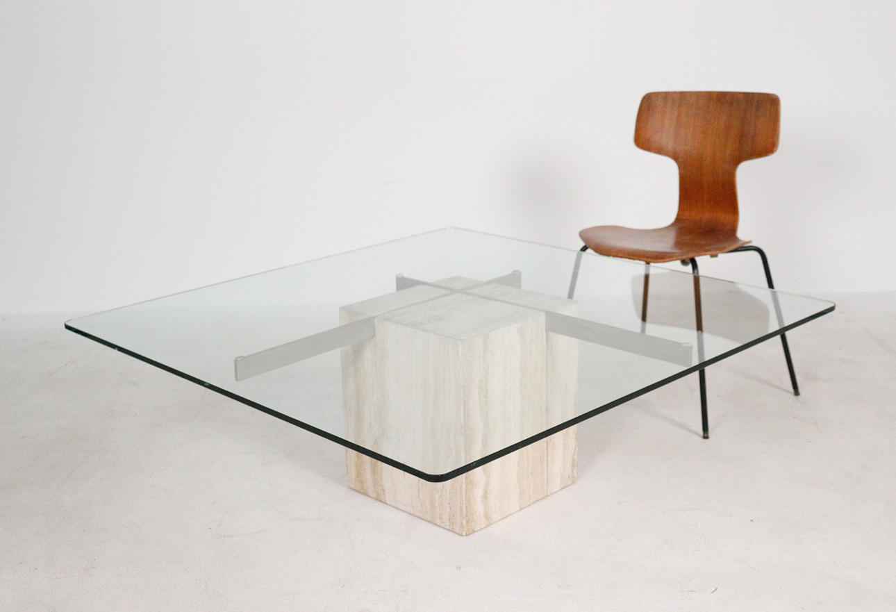 Artedi travertine coffee table/side table, Italy, 1970s, travertine construction with a square glass plate (loose), dimensions approx.: H. 40cm, W. 110cm, D. 110cm.