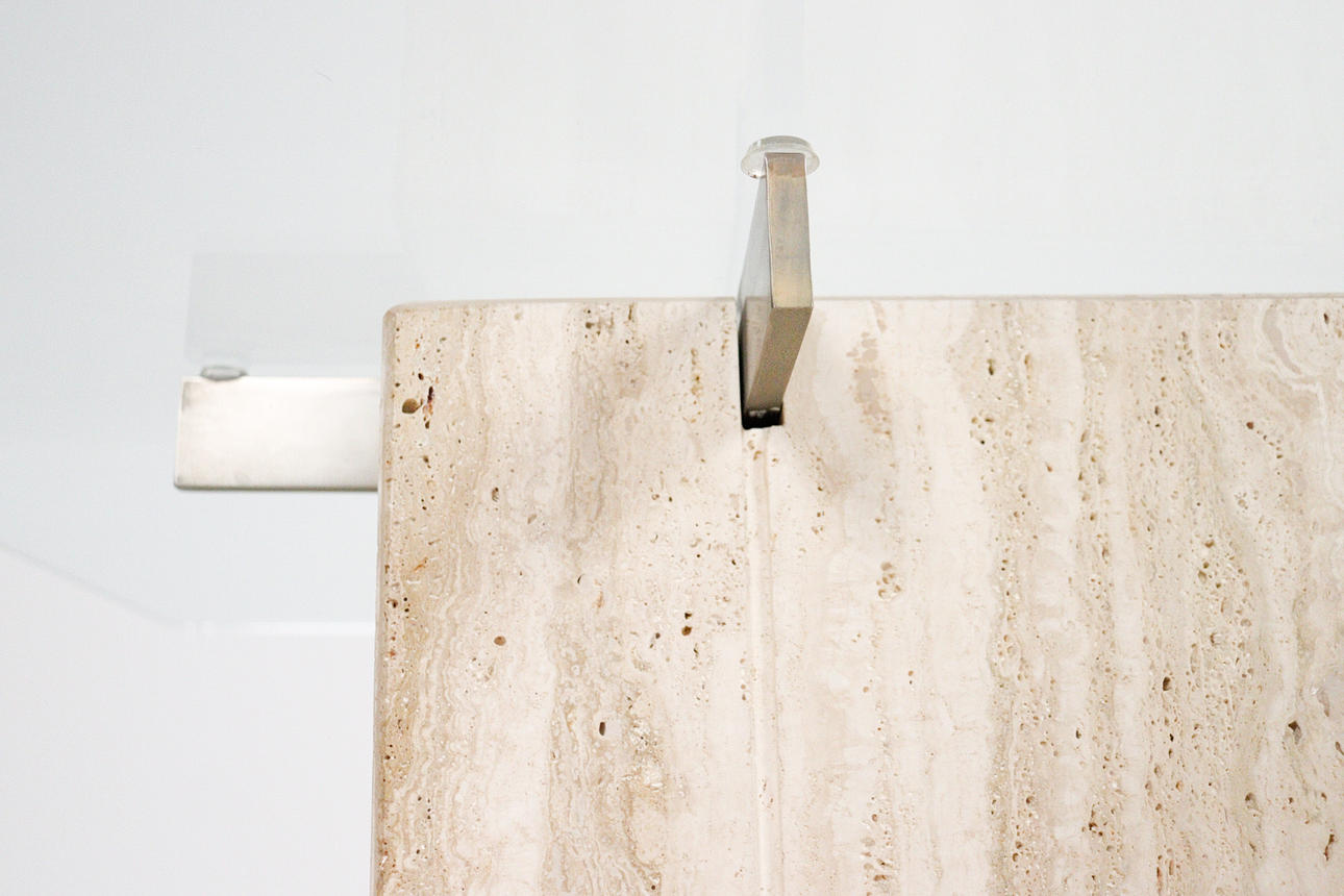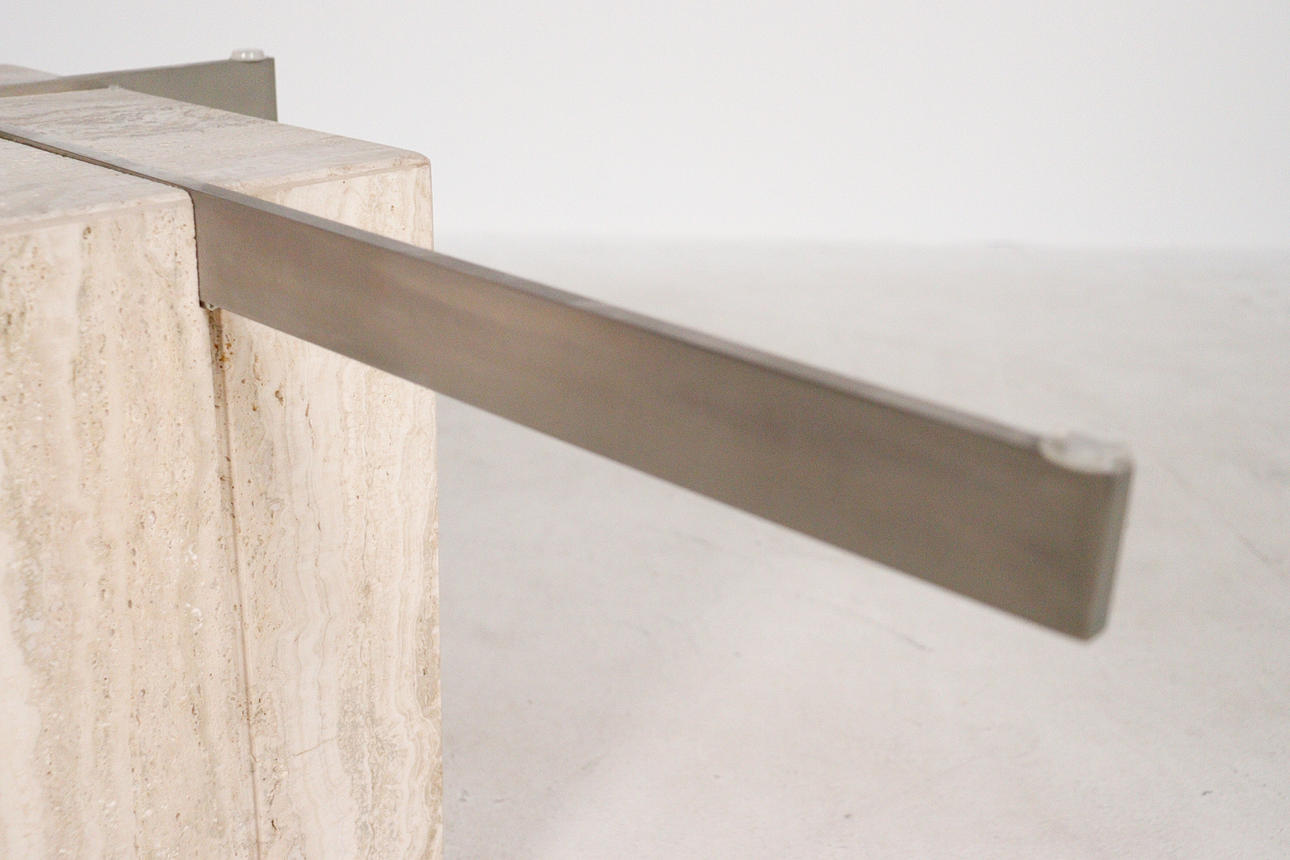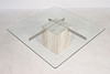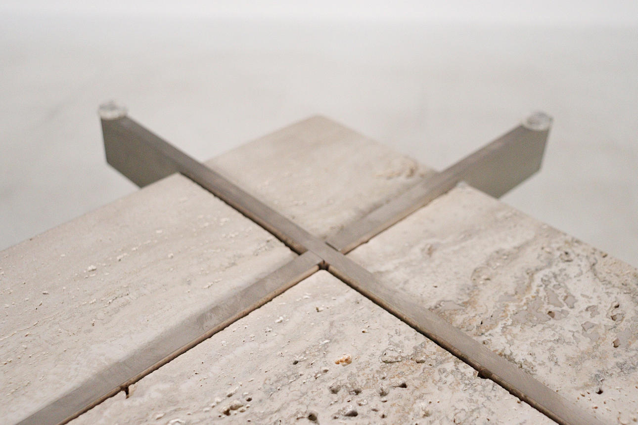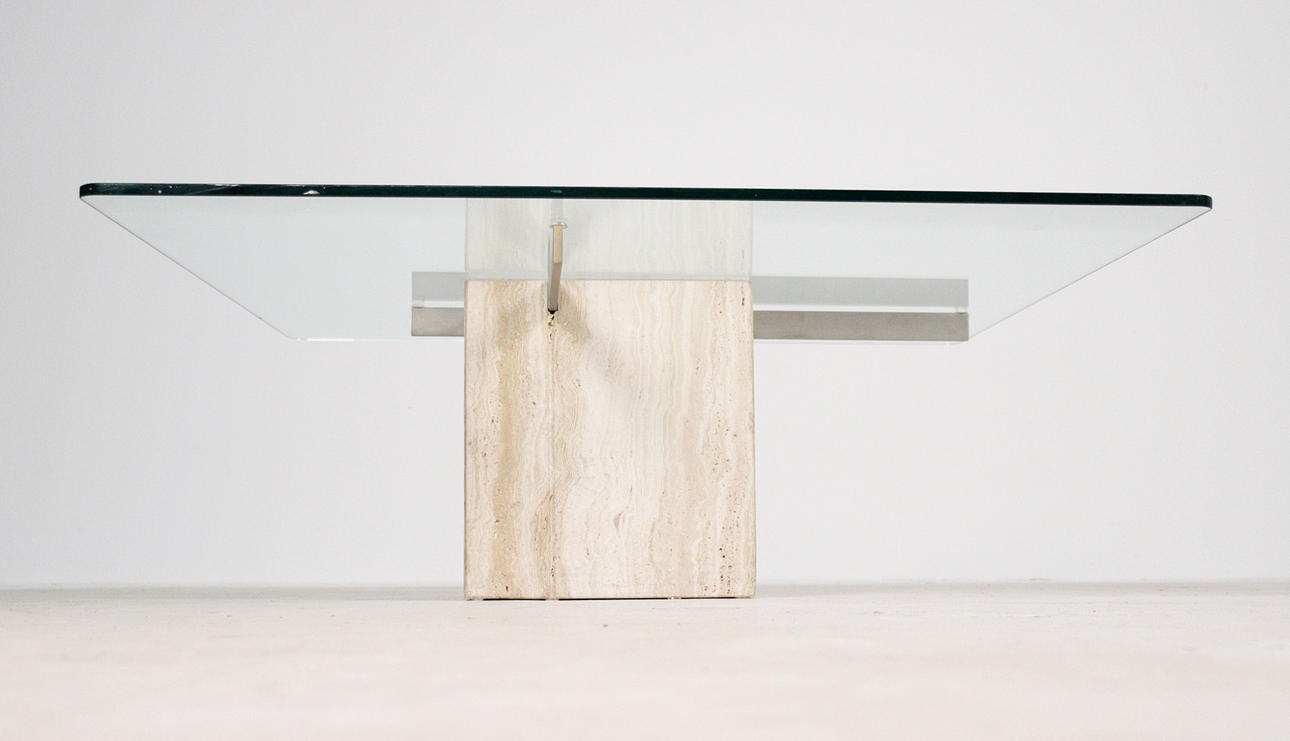 Artedi travertine coffee table/side table, Italy, 1970s, travertine construction with a square glass plate (loose), dimensions approx.: H. 40cm, W. 110cm, D. 110cm.