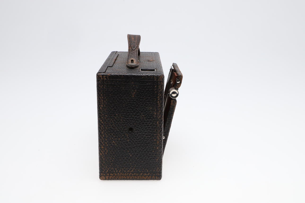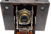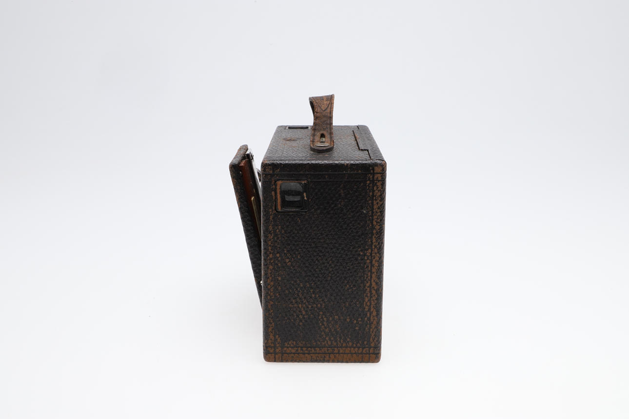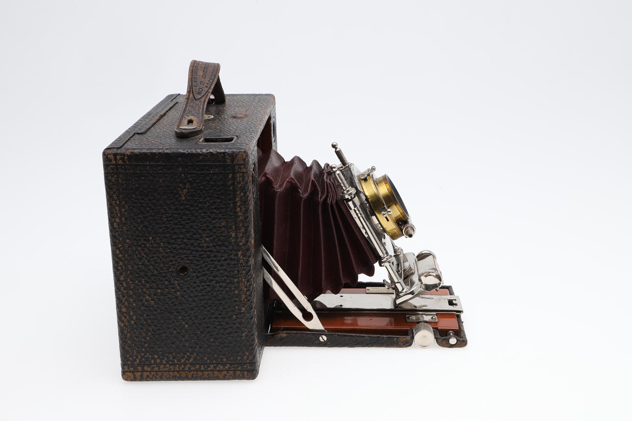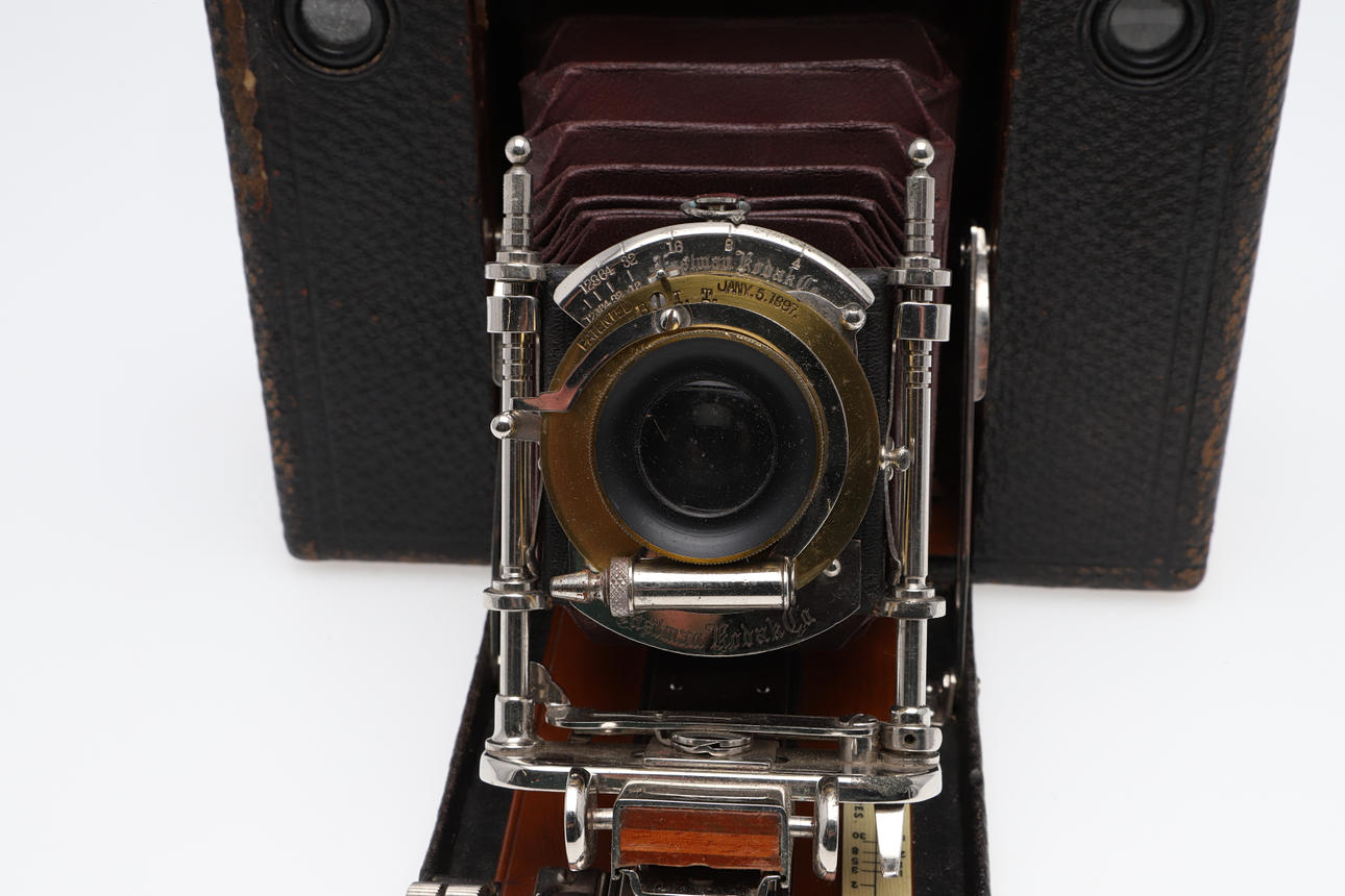 A vintage cartridge camera with leather bellows and leather case. Marked, Eastman Kodak Co.