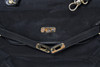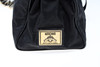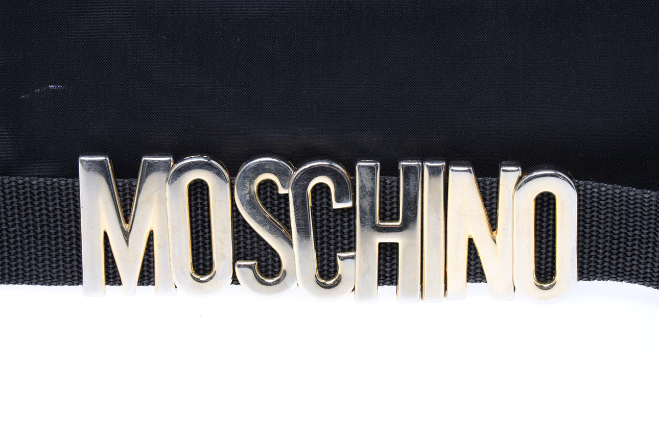 Bag in black nylon with leather edging. Detachable shoulder strap in woven nylon with 'MOSCHINO' letters in gilded metal. Cover with padlock. Interior with black lining fabric, a zipped side compartment. Interior and exterior plaque marked MOSCHINO, redwall, serial number, Made in Italy. Dimensions approx. (excl. handle) 25x34x13 cm.